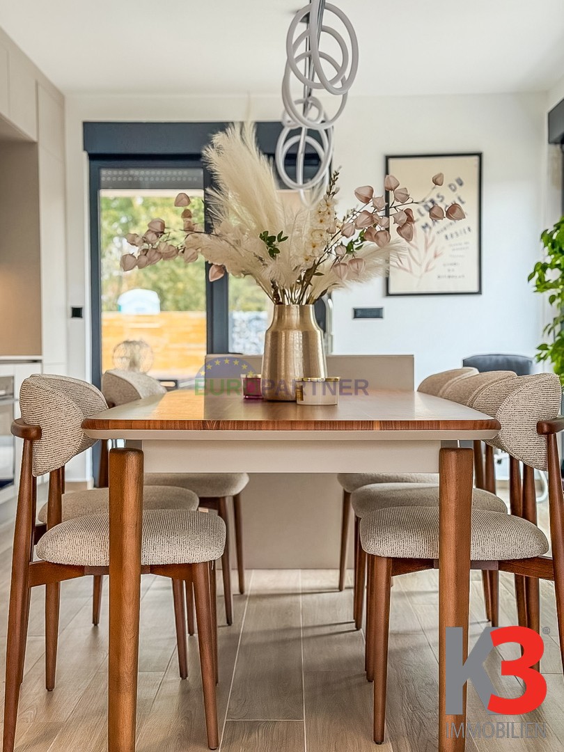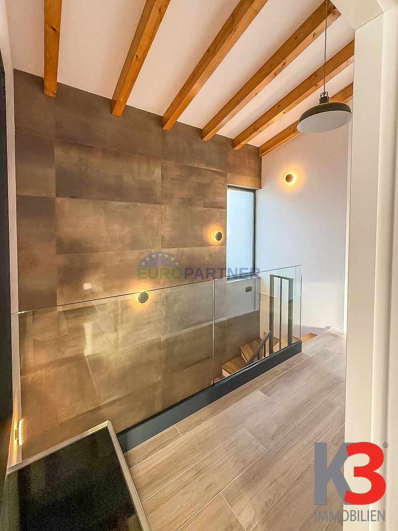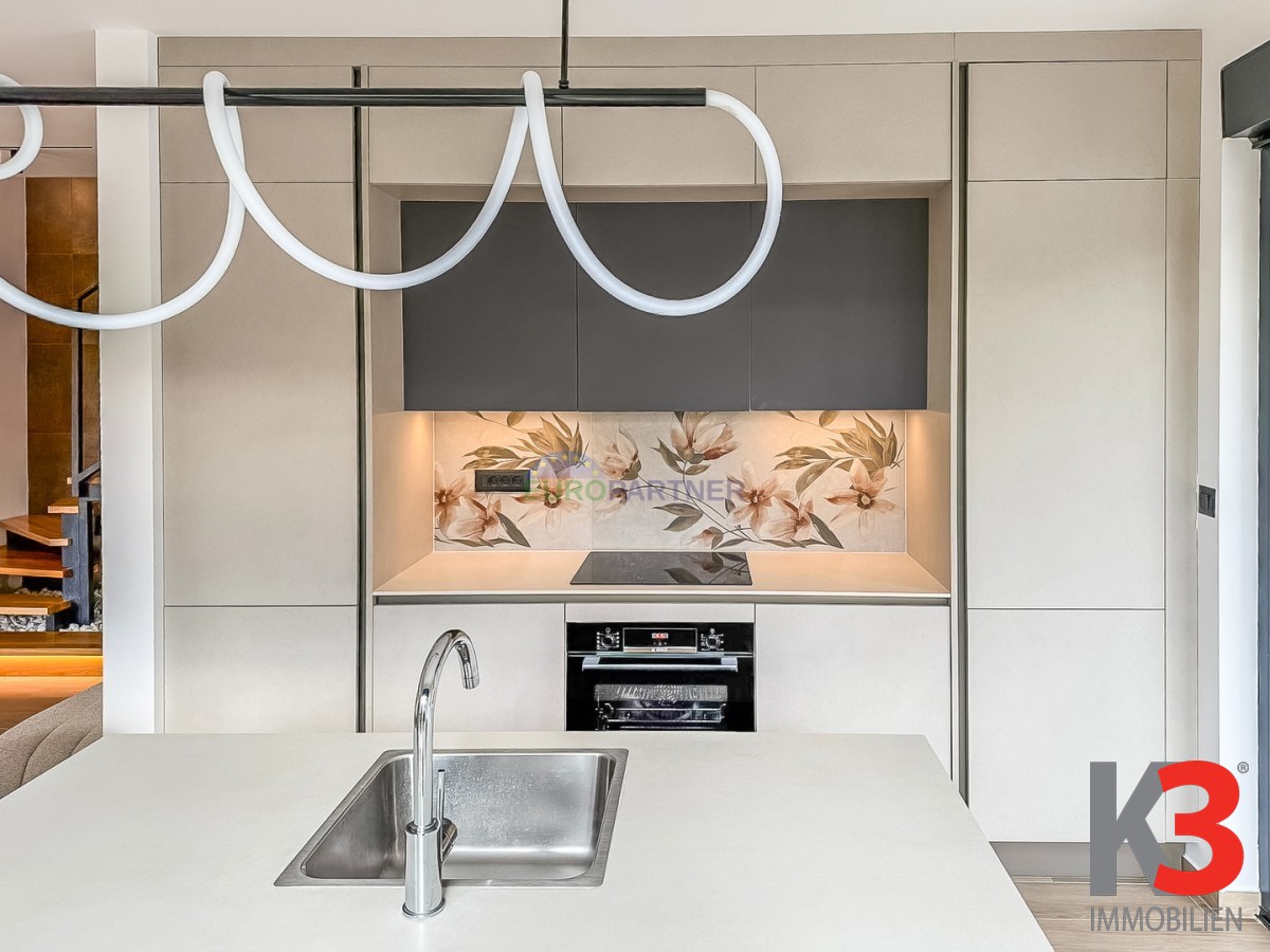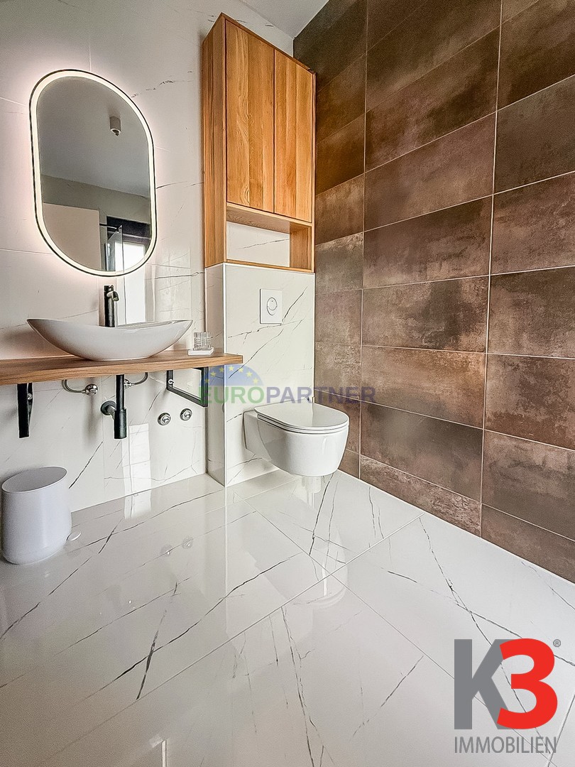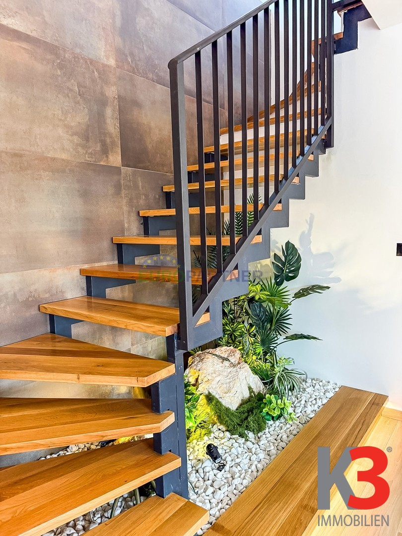 Im Obergeschoss befinden sich zwei komfortable Schlafzimmer, jeweils mit eigenem Bad, ein zusätzlicher Abstellraum und eine geräumige Terrasse, die zum Entspannen einlädt. Das Haus ist mit sorgfältig ausgewählten Designermöbeln ausgestattet, die die Eleganz und den modernen Charakter der Räume unterstreichen.