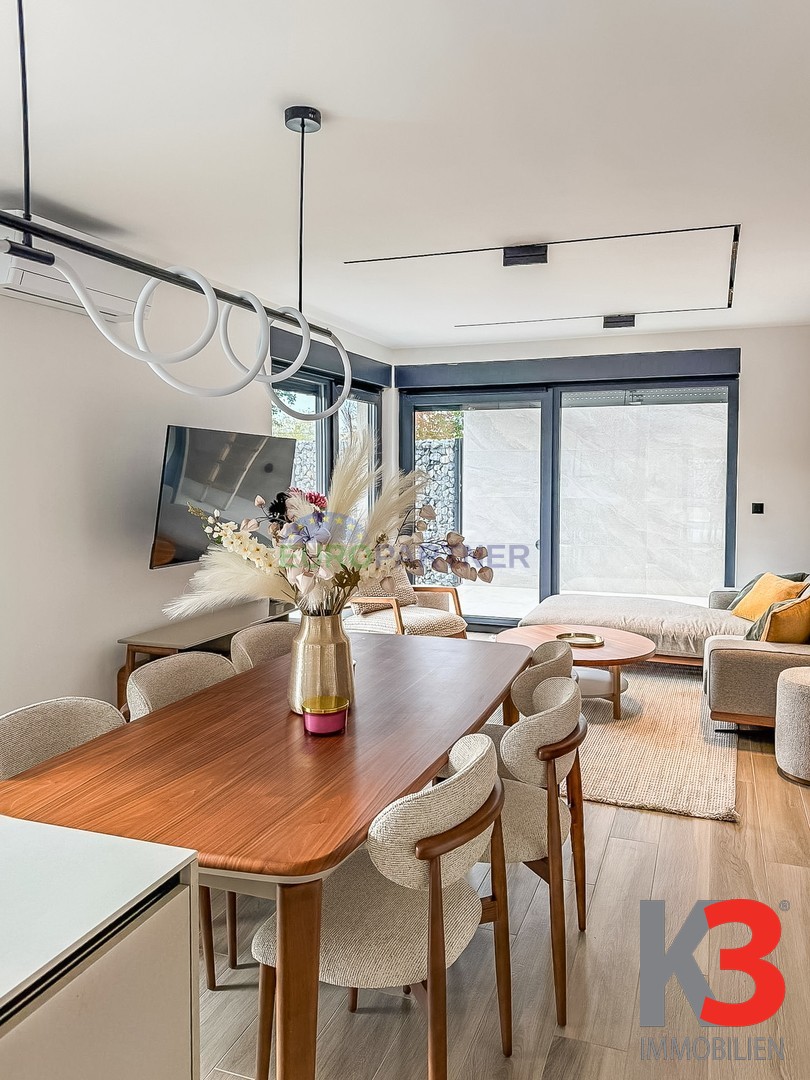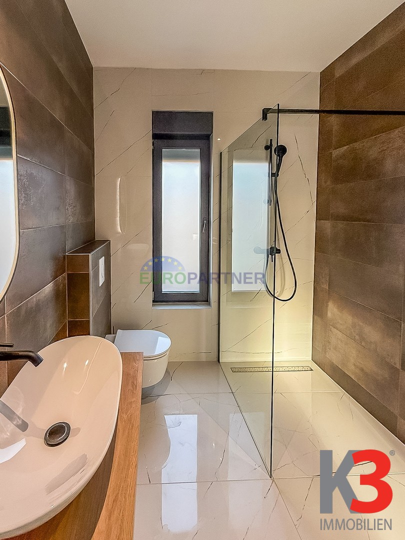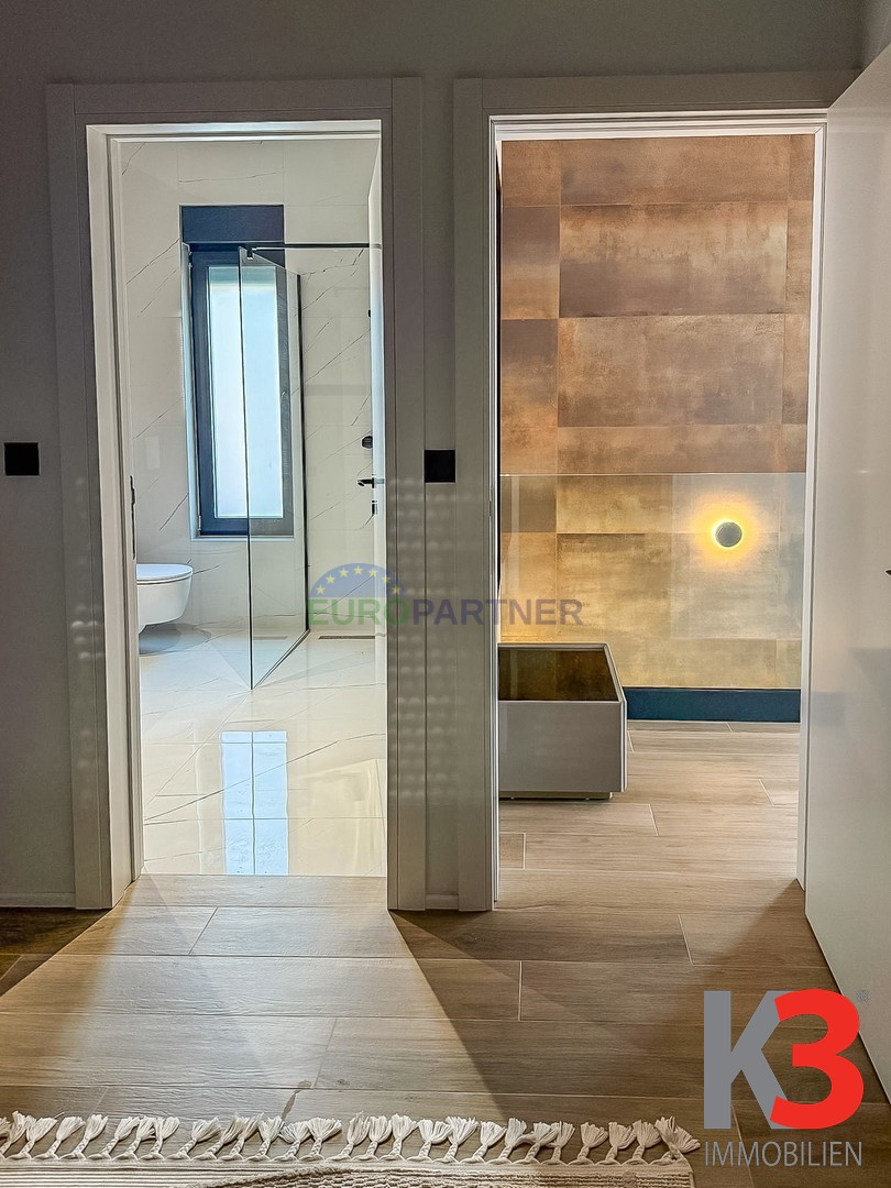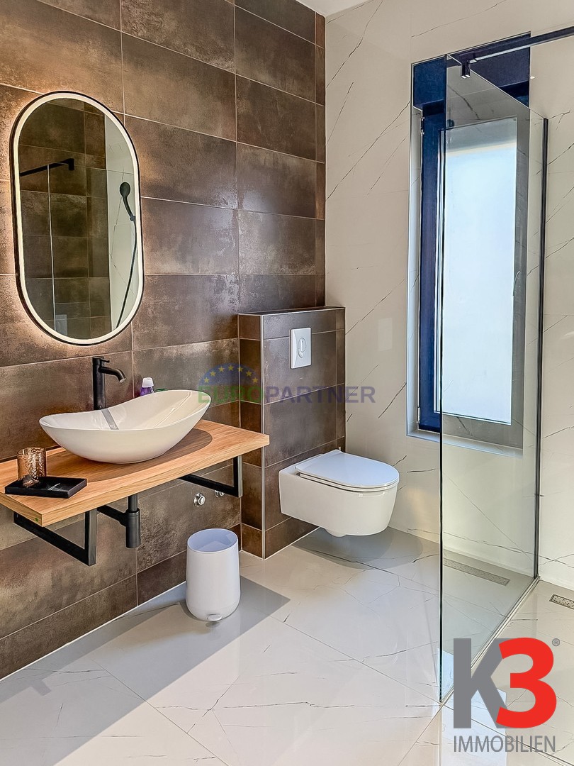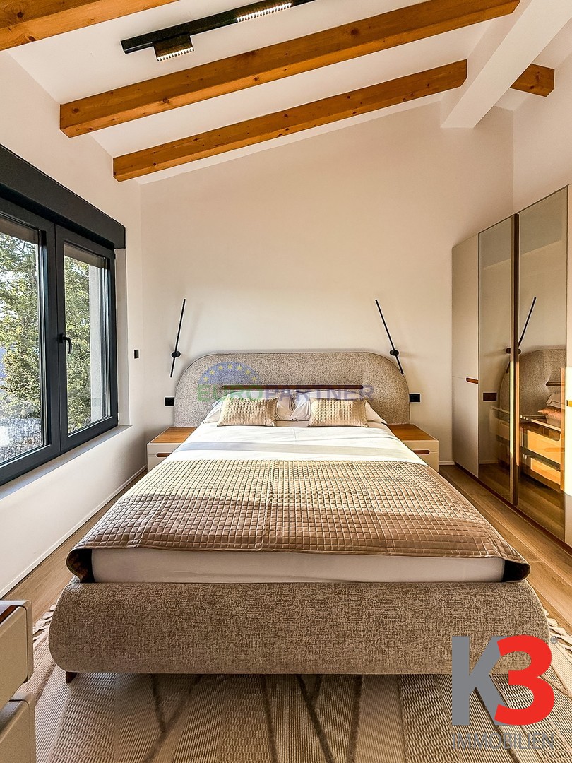 Im Obergeschoss befinden sich zwei komfortable Schlafzimmer, jeweils mit eigenem Bad, ein zusätzlicher Abstellraum und eine geräumige Terrasse, die zum Entspannen einlädt. Das Haus ist mit sorgfältig ausgewählten Designermöbeln ausgestattet, die die Eleganz und den modernen Charakter der Räume unterstreichen.