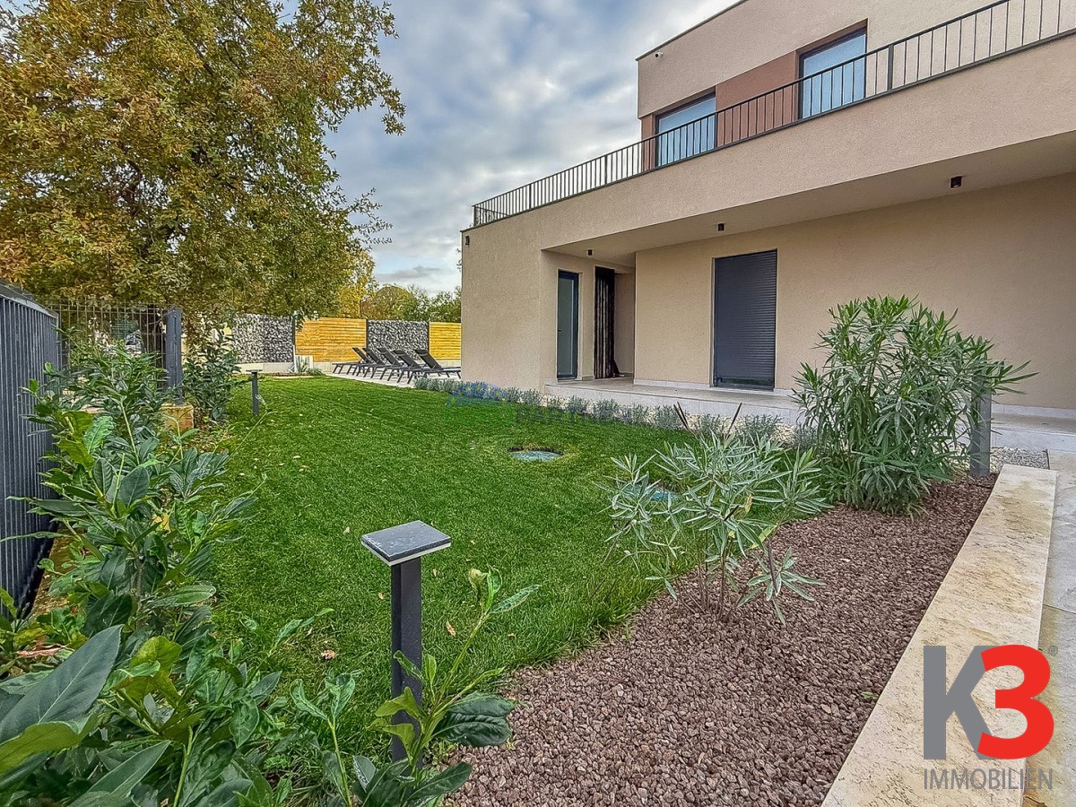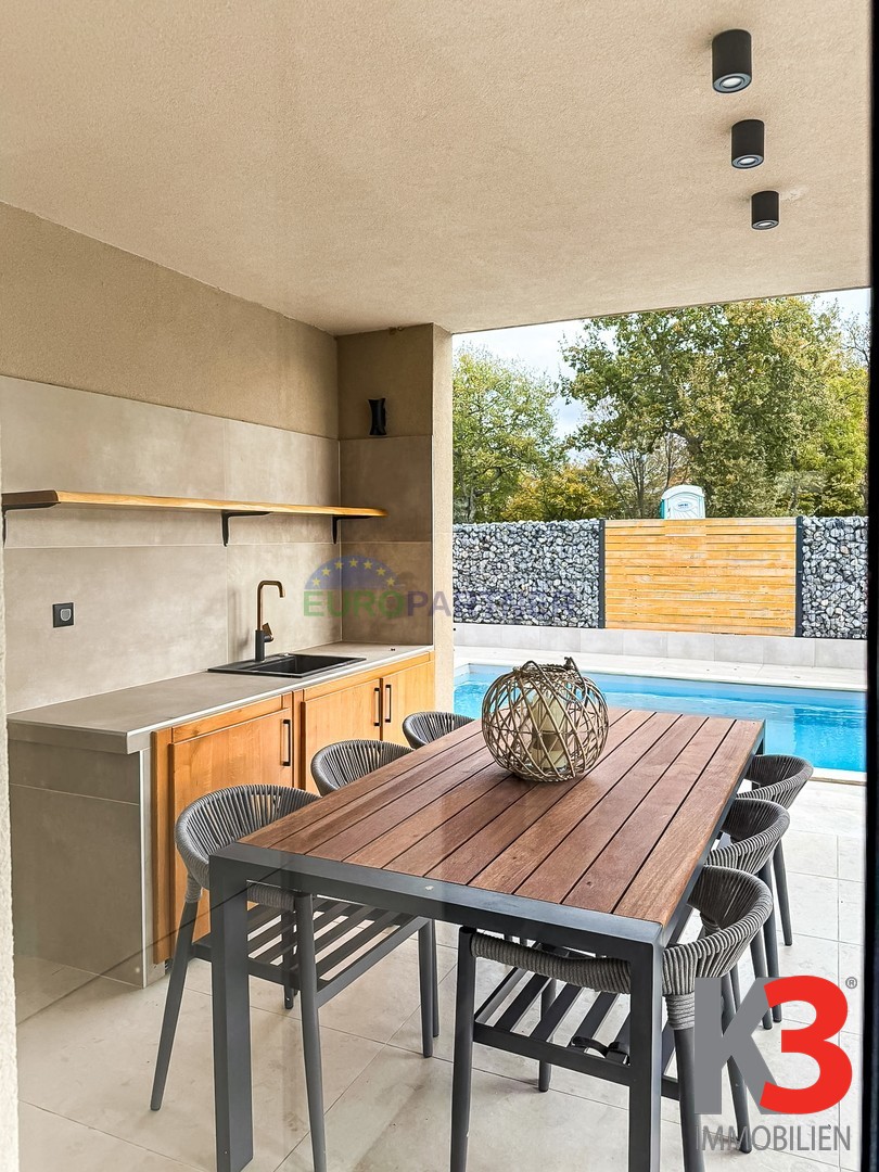Vom Wohnzimmer aus gelangt man auf eine überdachte Terrasse mit Sommerküche und Sauna – ideal zum ganzjährigen Genießen und geselligen Beisammensein. Im wunderschön angelegten Garten befindet sich ein Swimmingpool mit Liegewiese. Die gesamte Anlage ist mit mediterranen Pflanzen bepflanzt, die ein typisch istrisches und heimeliges Gefühl vermitteln.