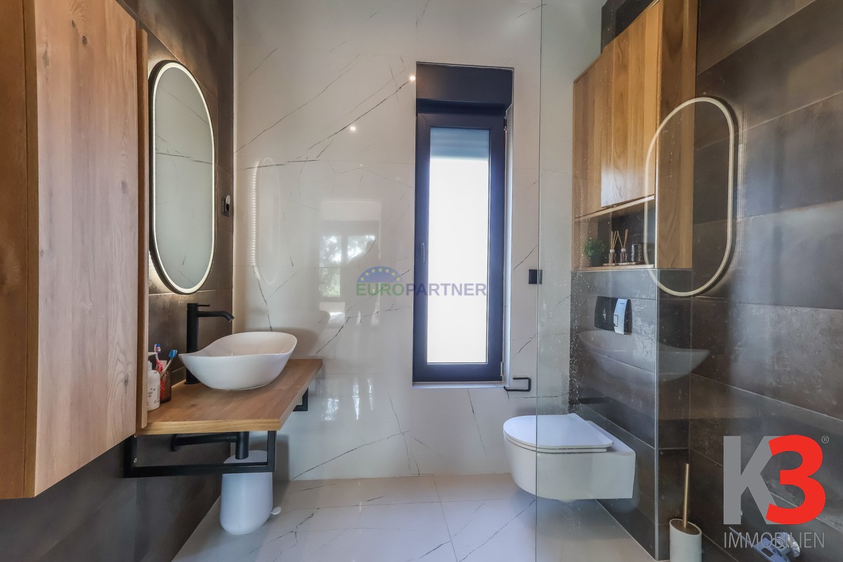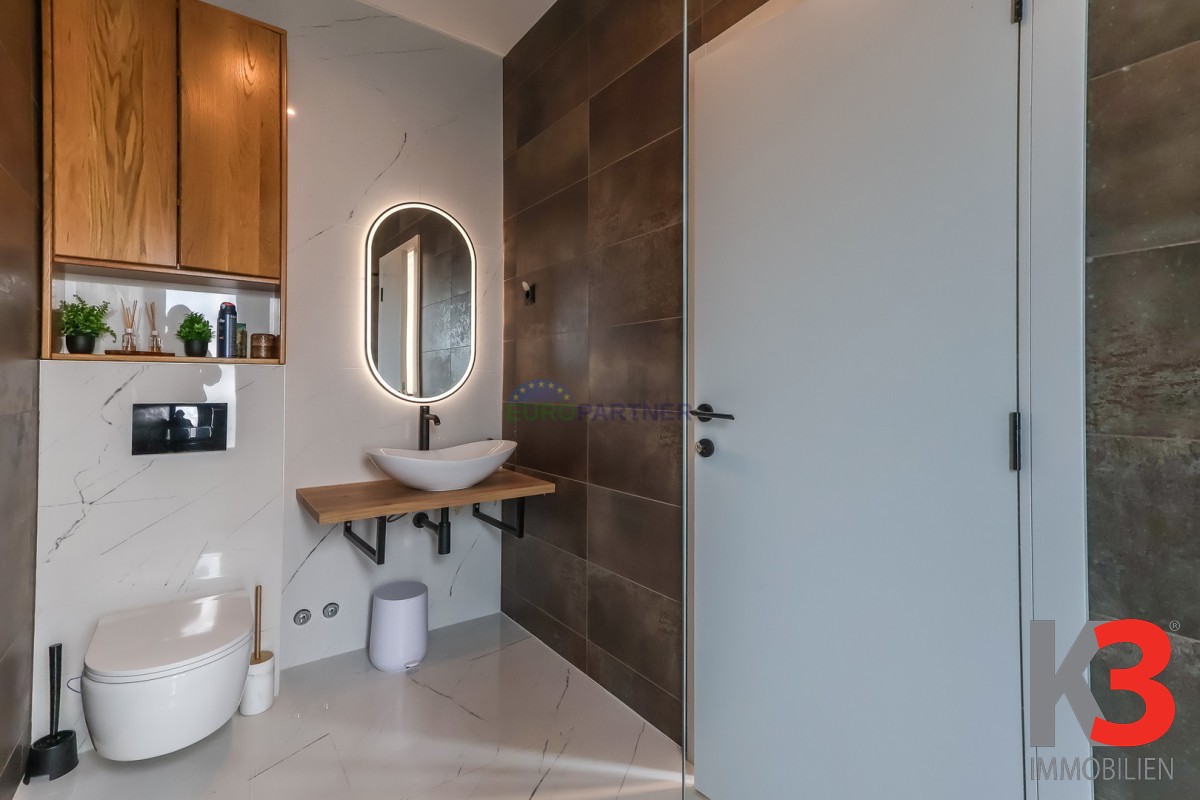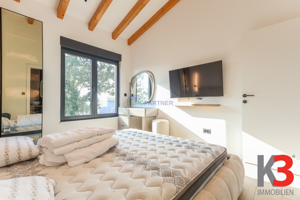 Im Obergeschoss befinden sich zwei modern eingerichtete Schlafzimmer, jeweils mit eigenem eleganten Badezimmer, sowie eine großzügige Terrasse – perfekt für den Morgenkaffee oder zum Entspannen bei Sonnenuntergang. Ein Abstellraum ist ebenfalls vorhanden. Das Haus verfügt zudem über eine Sauna und ist somit ein ideales Anwesen für alle, die Wellness und Genuss in vollen Zügen genießen möchten.