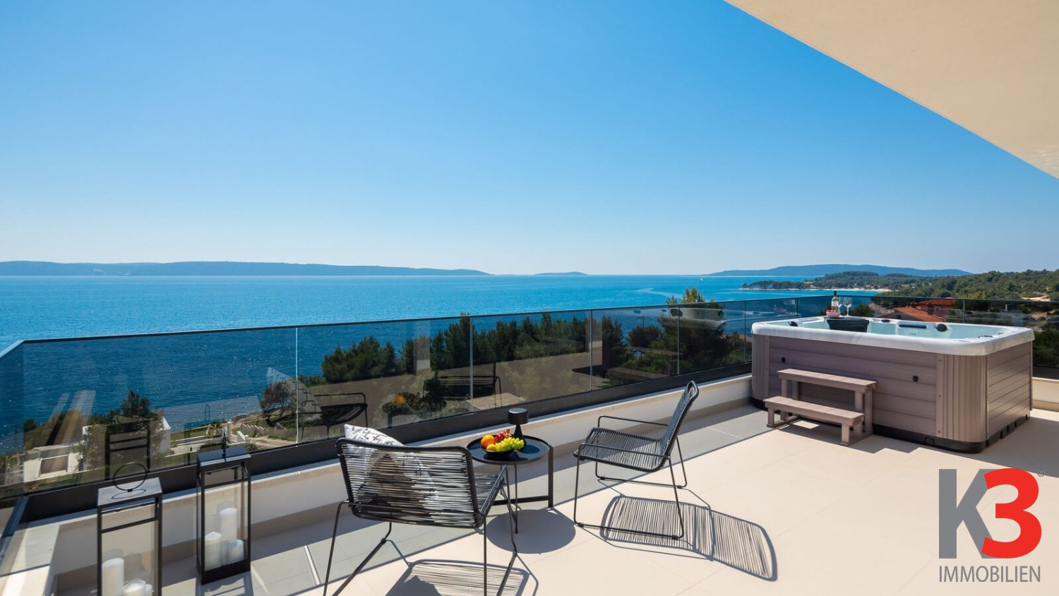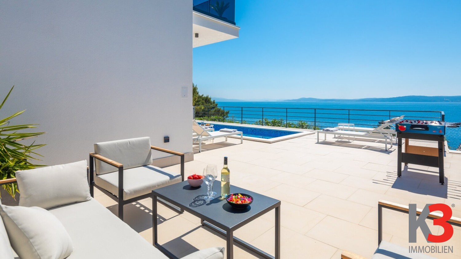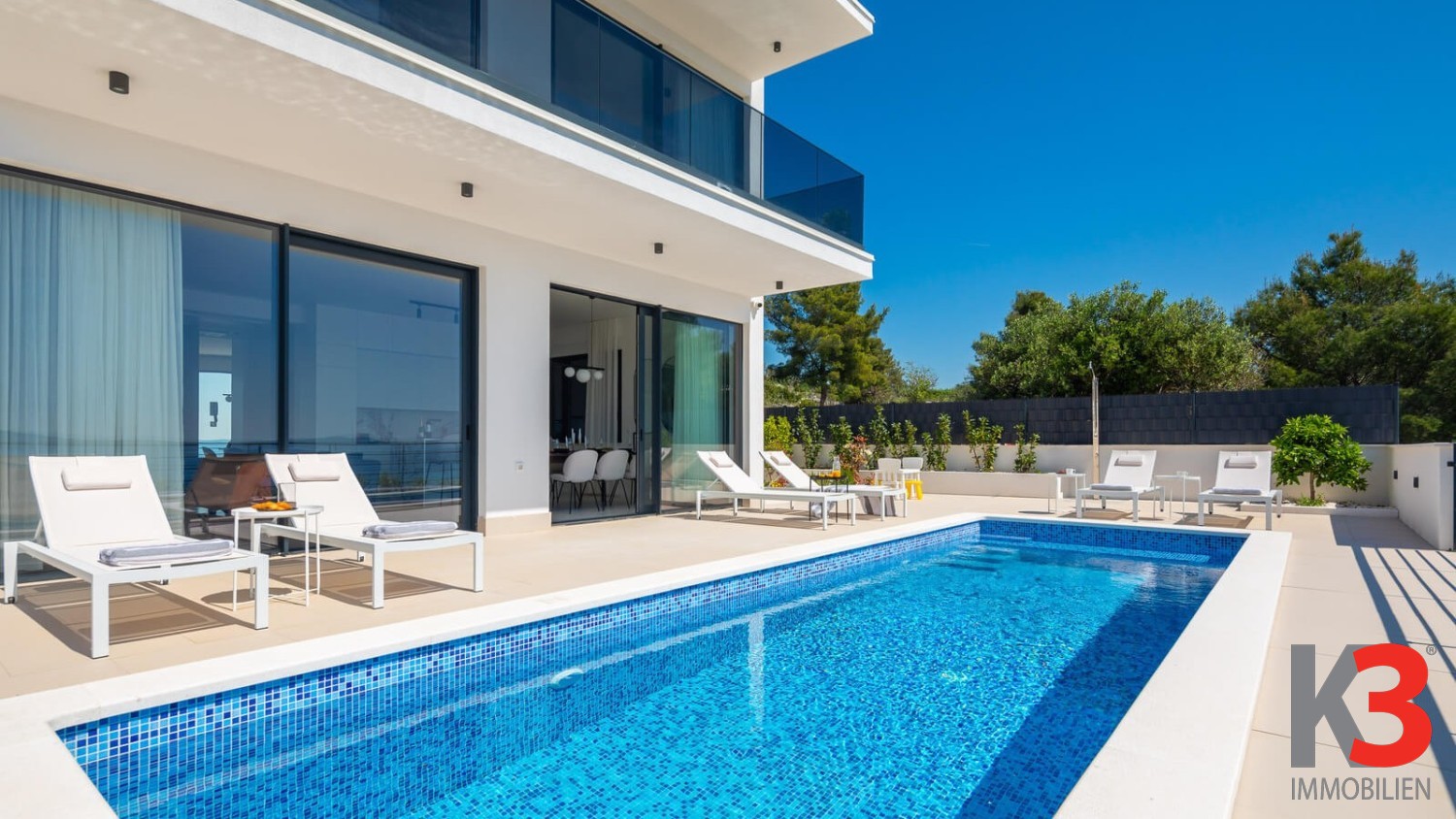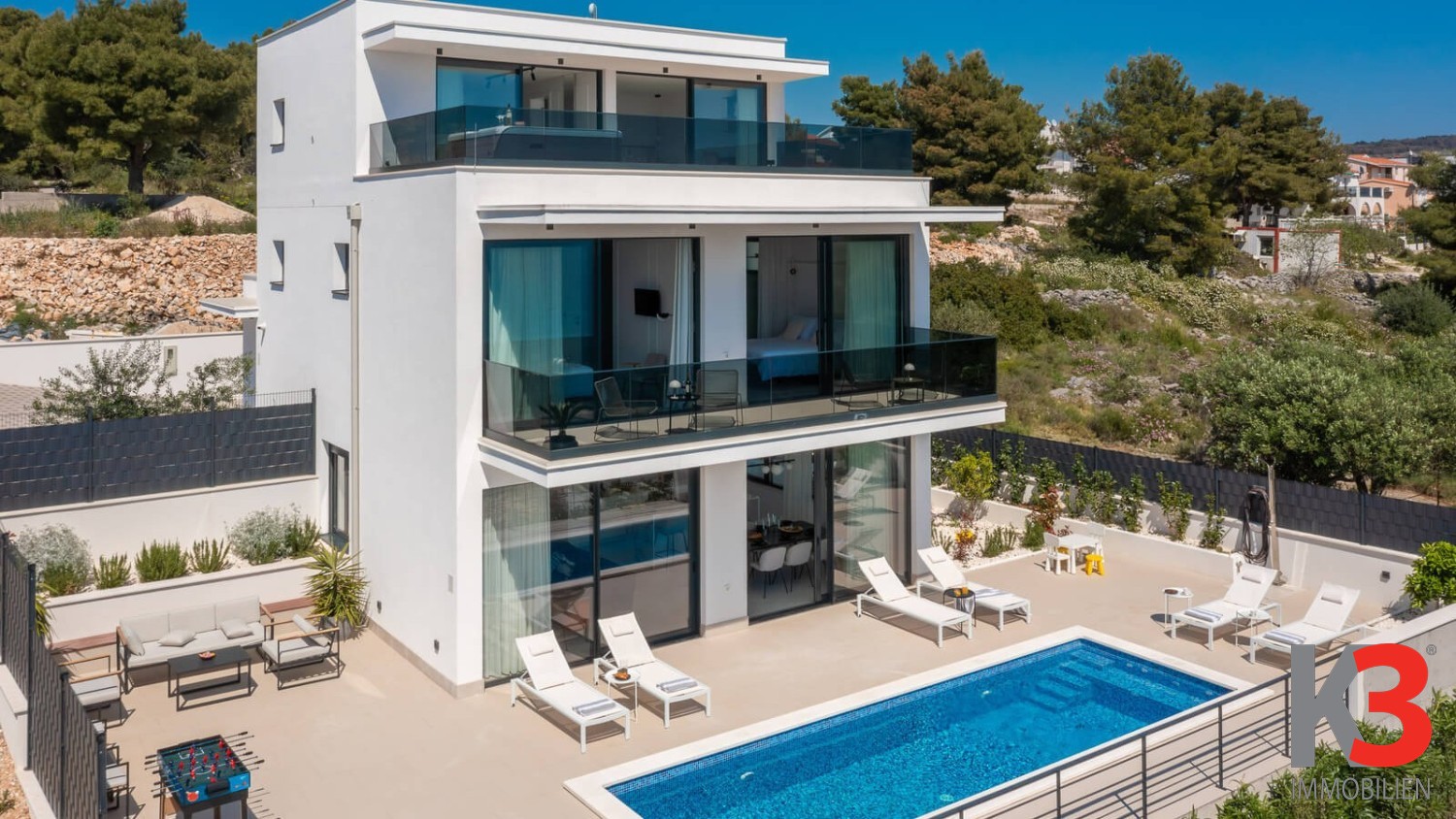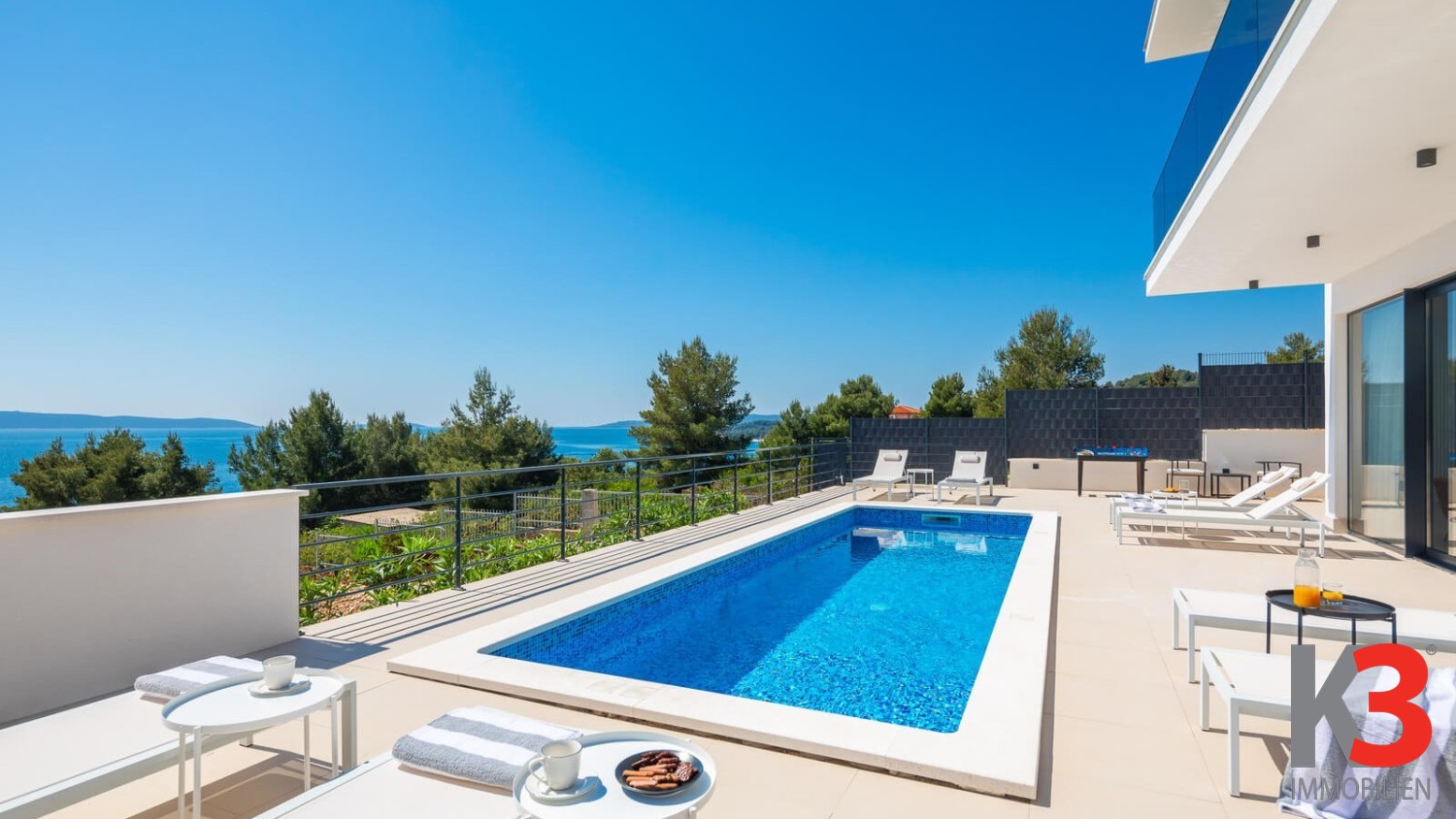 Eine luxuriöse Villa mit Pool steht zum Verkauf, nahe dem Meer im ruhigen Ort Okrug Gornji auf der Insel Čiovo in Mitteldalmatien. Die Villa wurde 2024 auf einem vollständig umzäunten Grundstück von 300 m² erbaut. Die Villa selbst erstreckt sich über 200 m² und umfasst drei Etagen. Im Erdgeschoss befinden sich ein Wohnzimmer und eine voll ausgestattete Küche, die auf eine Außenterrasse führen, wo sich der Pool, umgeben von Sonnenliegen und Loungesesseln, befindet. Auf der Rückseite der Villa gibt es einen Grill und einen Außentisch zum Essen. Die Villa verfügt über fünf Schlafzimmer, jedes mit eigenem Badezimmer. Das Hauptschlafzimmer auf der obersten Etage verfügt über eine große private Terrasse mit einem Jacuzzi, von dem aus man einen herrlichen Blick auf das Meer hat.