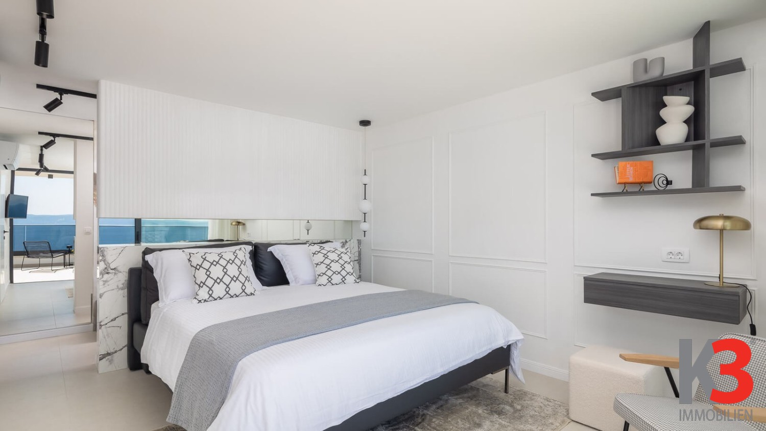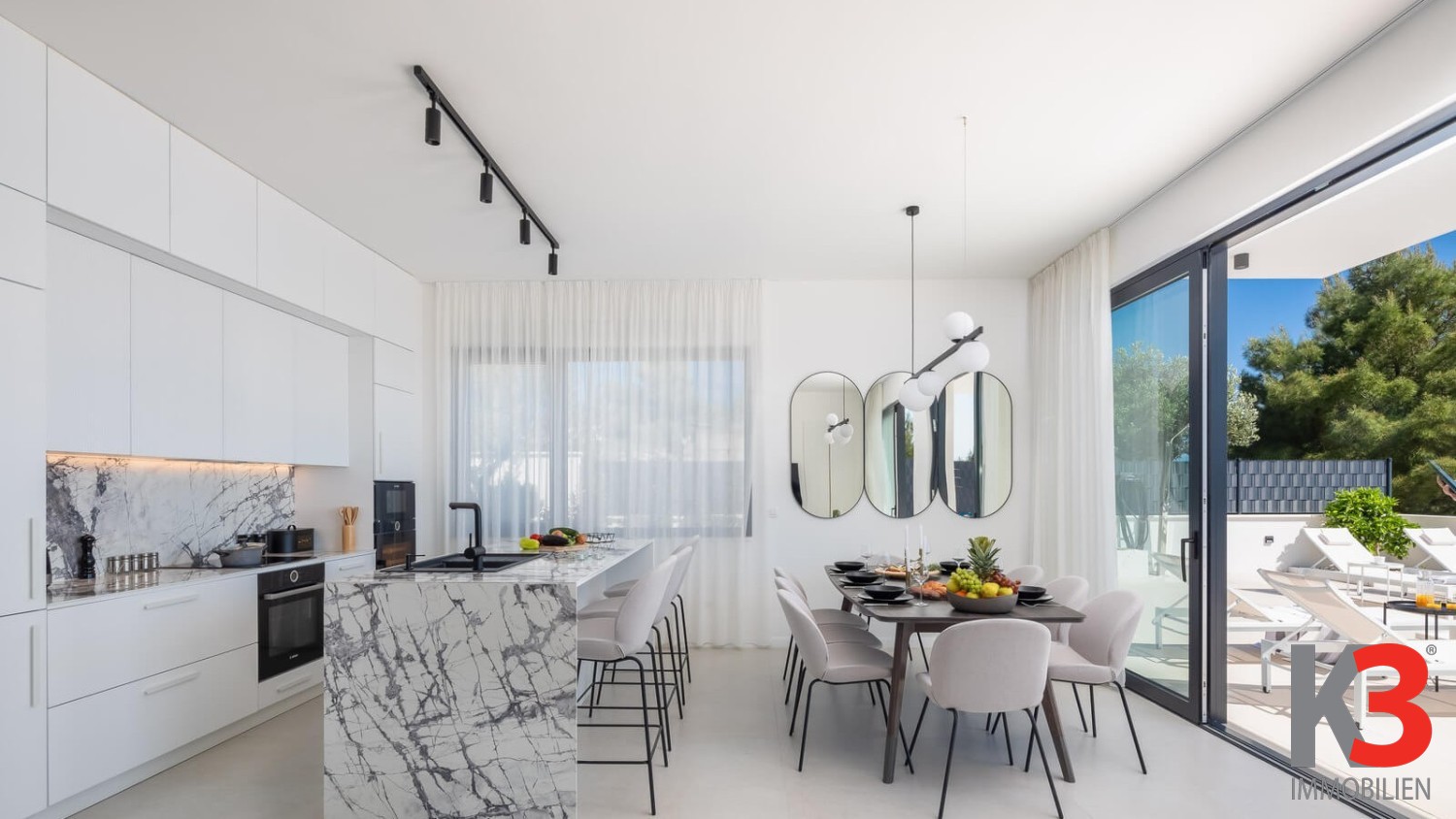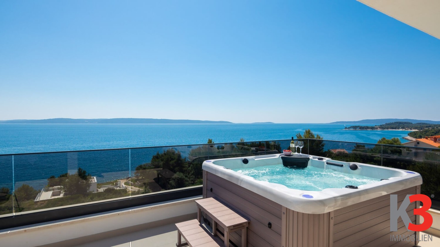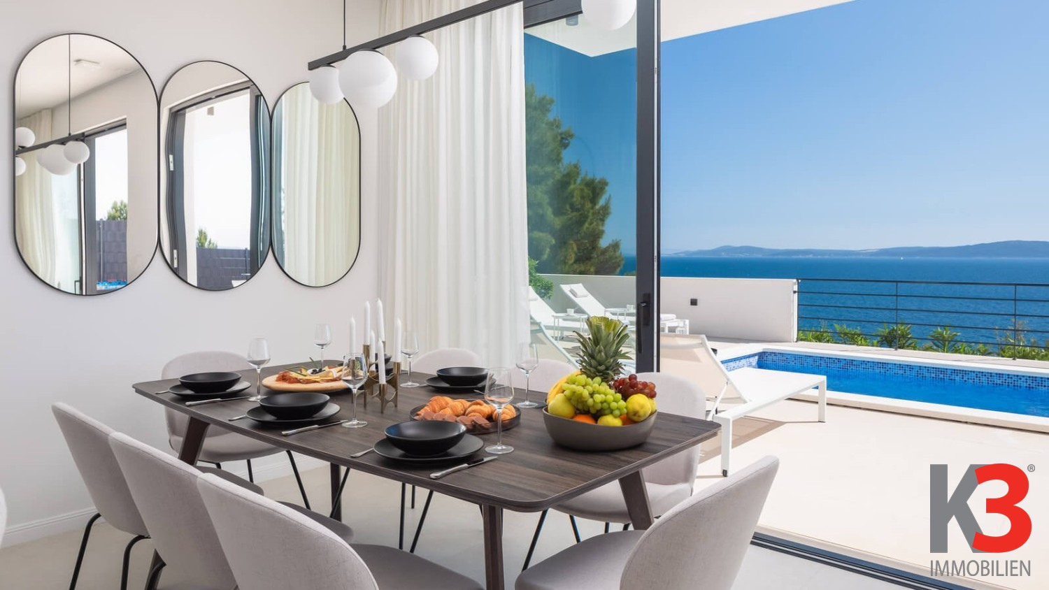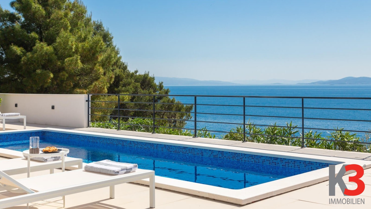 Eine luxuriöse Villa mit Pool steht zum Verkauf, nahe dem Meer im ruhigen Ort Okrug Gornji auf der Insel Čiovo in Mitteldalmatien. Die Villa wurde 2024 auf einem vollständig umzäunten Grundstück von 300 m² erbaut. Die Villa selbst erstreckt sich über 200 m² und umfasst drei Etagen. Im Erdgeschoss befinden sich ein Wohnzimmer und eine voll ausgestattete Küche, die auf eine Außenterrasse führen, wo sich der Pool, umgeben von Sonnenliegen und Loungesesseln, befindet. Auf der Rückseite der Villa gibt es einen Grill und einen Außentisch zum Essen. Die Villa verfügt über fünf Schlafzimmer, jedes mit eigenem Badezimmer. Das Hauptschlafzimmer auf der obersten Etage verfügt über eine große private Terrasse mit einem Jacuzzi, von dem aus man einen herrlichen Blick auf das Meer hat.