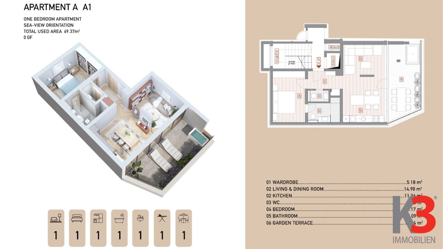 Es besteht aus einem Wohn- und Essbereich, einer Küche, einem Schlafzimmer mit eigenem Bad, einem Ankleideraum, einer großen Terrasse und einem Gäste-WC.