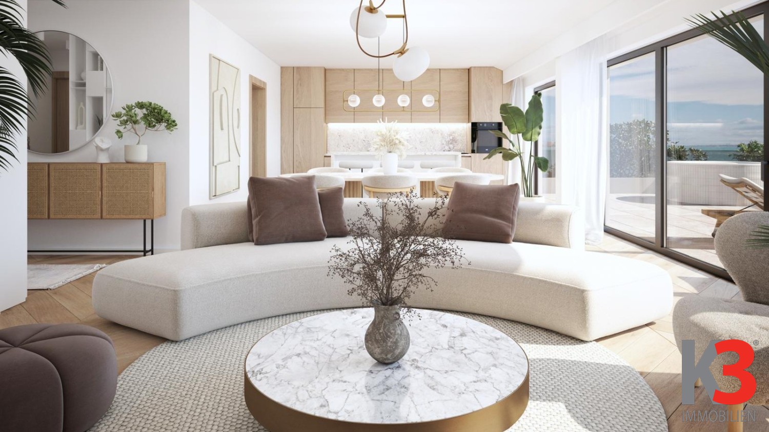 Es besteht aus einem Wohn- und Essbereich, einer Küche, einem Schlafzimmer mit eigenem Bad, einem Ankleideraum, einer großen Terrasse und einem Gäste-WC.