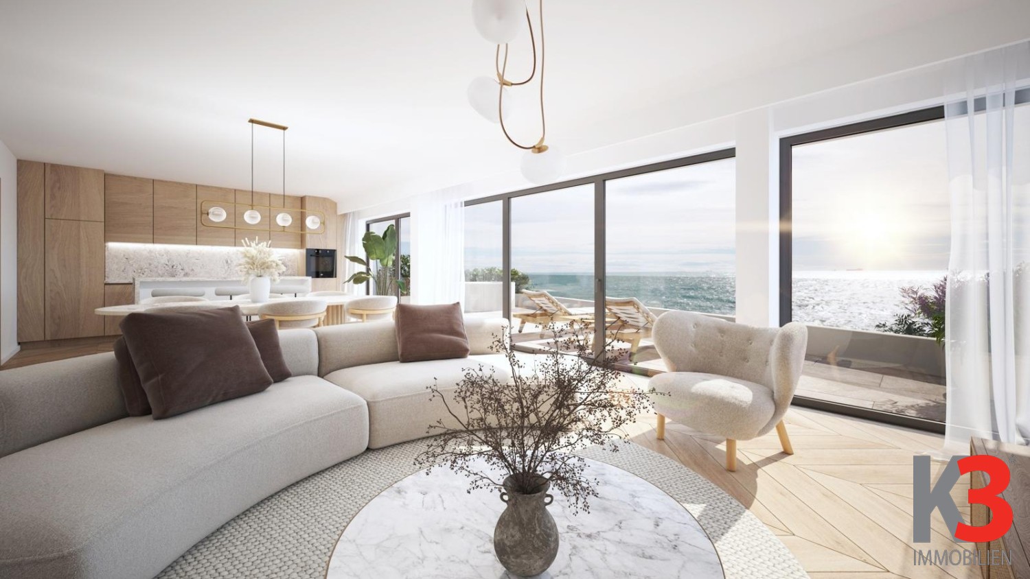 Es besteht aus einem Wohn- und Essbereich, einer Küche, einem Schlafzimmer mit eigenem Bad, einem Ankleideraum, einer großen Terrasse und einem Gäste-WC.