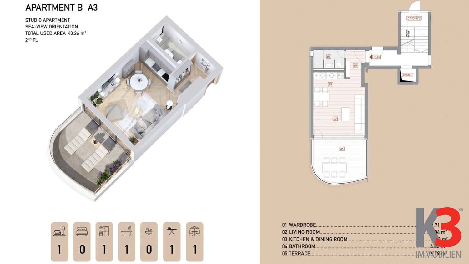 Es besteht aus einem Wohn- und Essbereich, einer Küche, einem Schlafzimmer mit eigenem Bad, einem Ankleideraum, einer großen Terrasse und einem Gäste-WC.