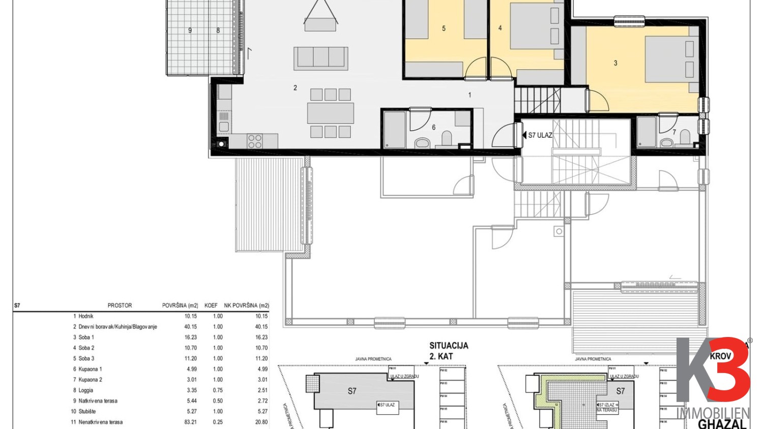 Sie besteht aus einem Wohnzimmer mit Essbereich und Küche, drei Schlafzimmern, zwei Badezimmern, einer Loggia, zwei überdachten Terrassen und einem Garten.