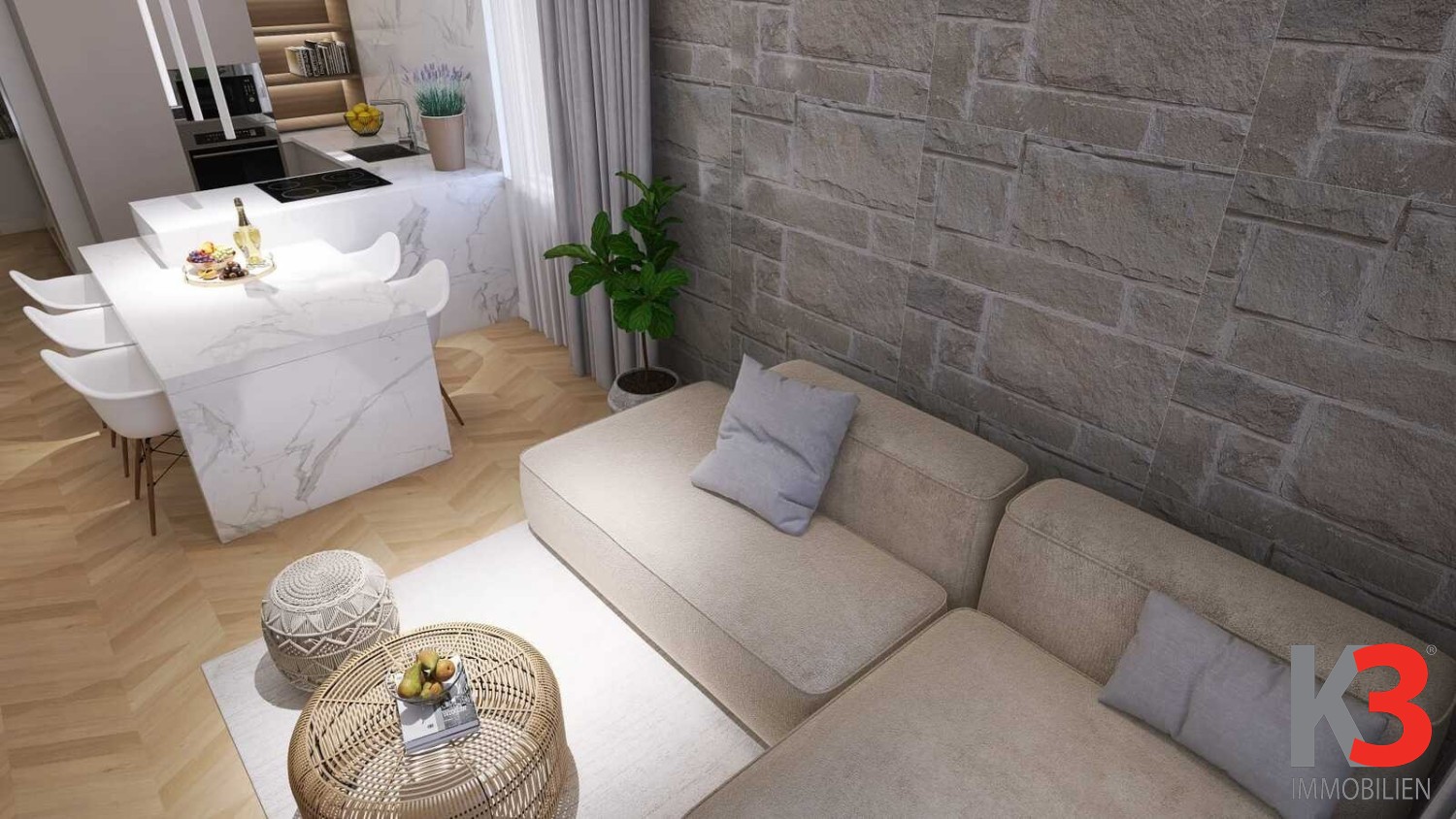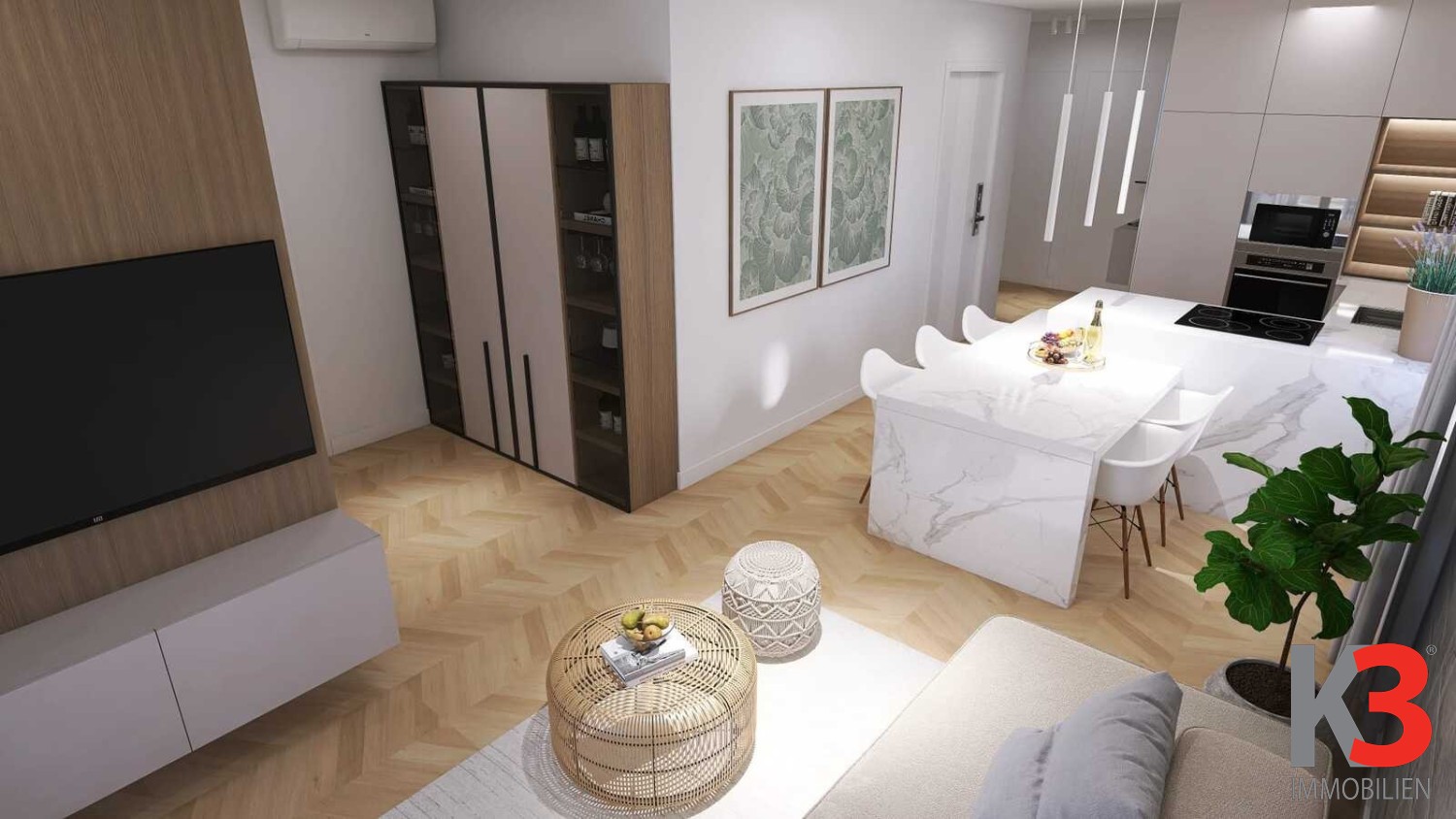 Die Wohnung besteht aus einem Wohnzimmer mit Küche und Essbereich, drei Schlafzimmern, zwei Badezimmern und einem Eingangsbereich.