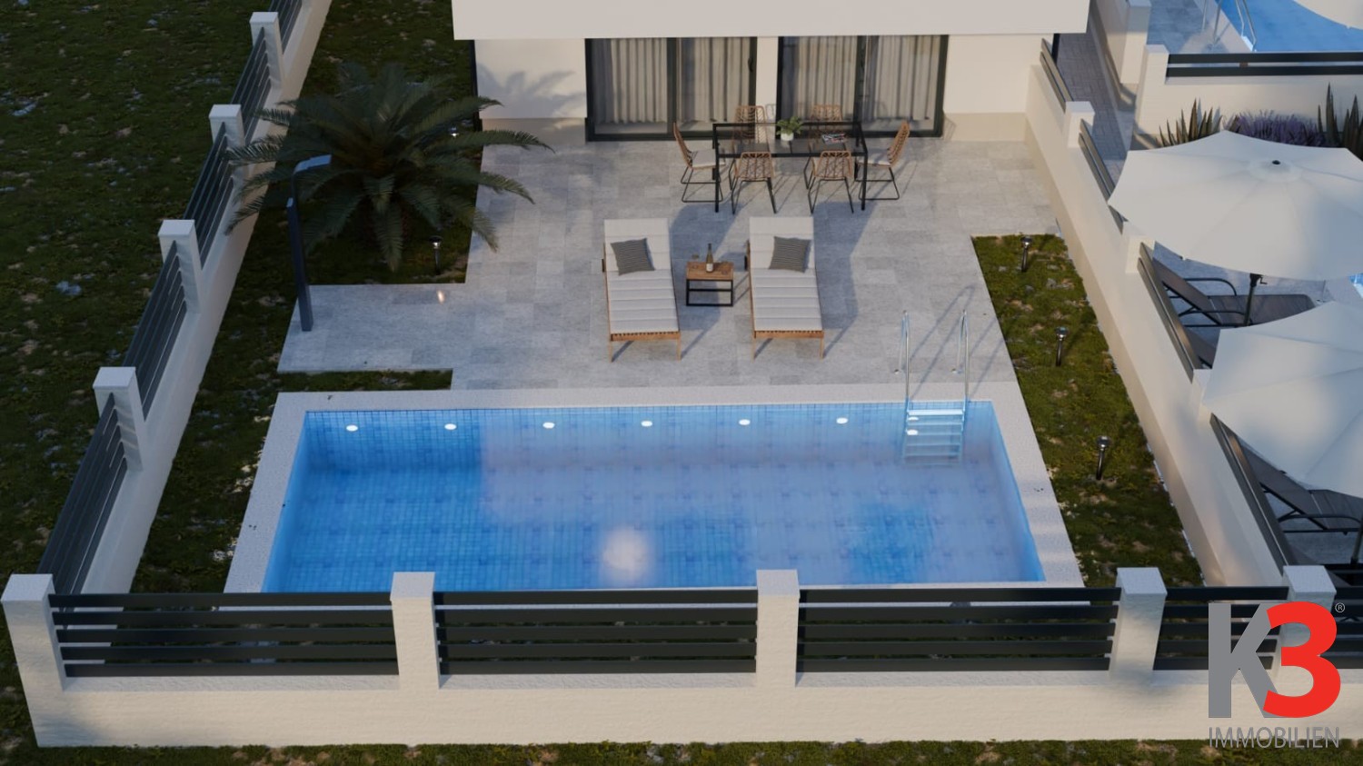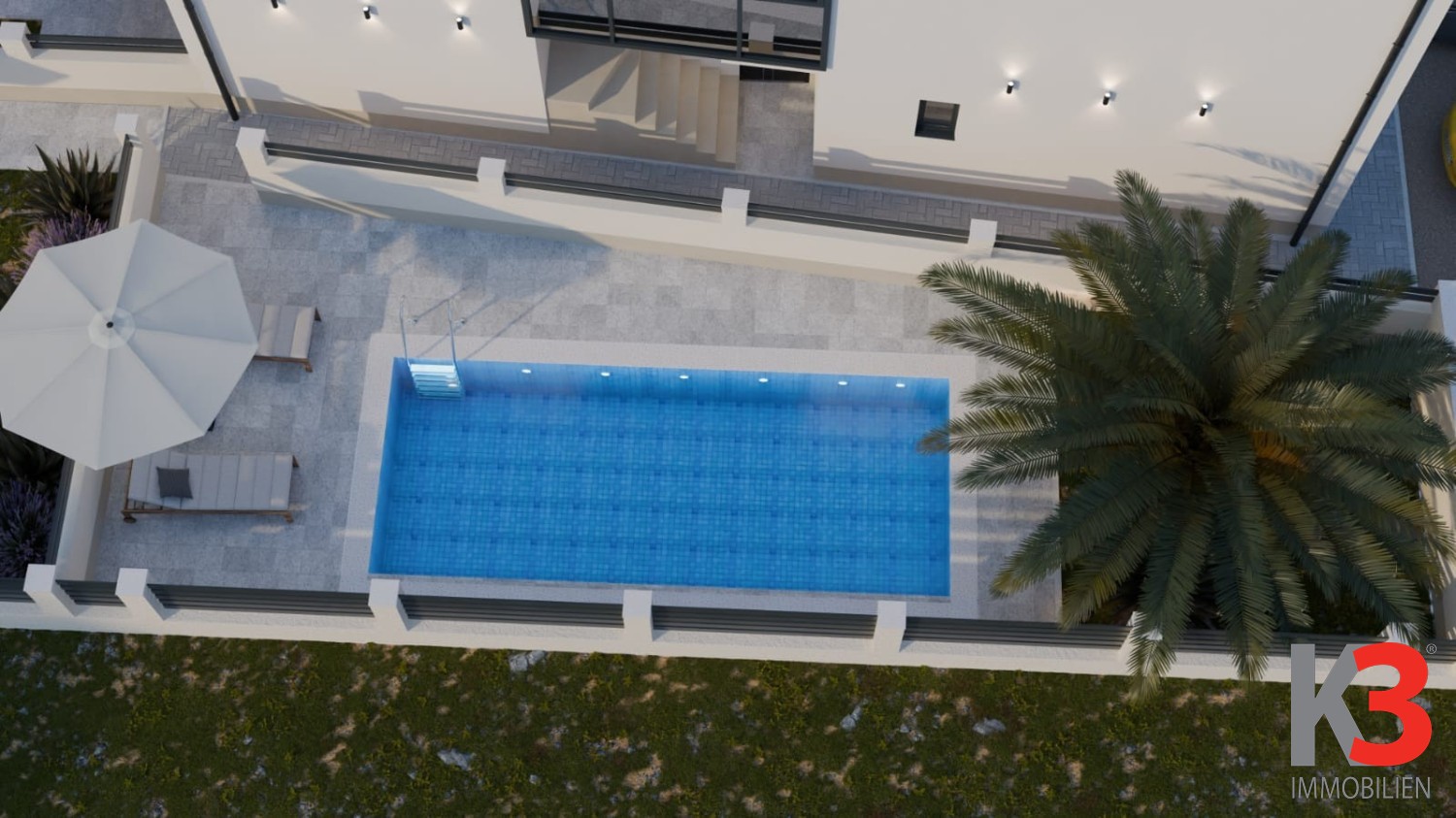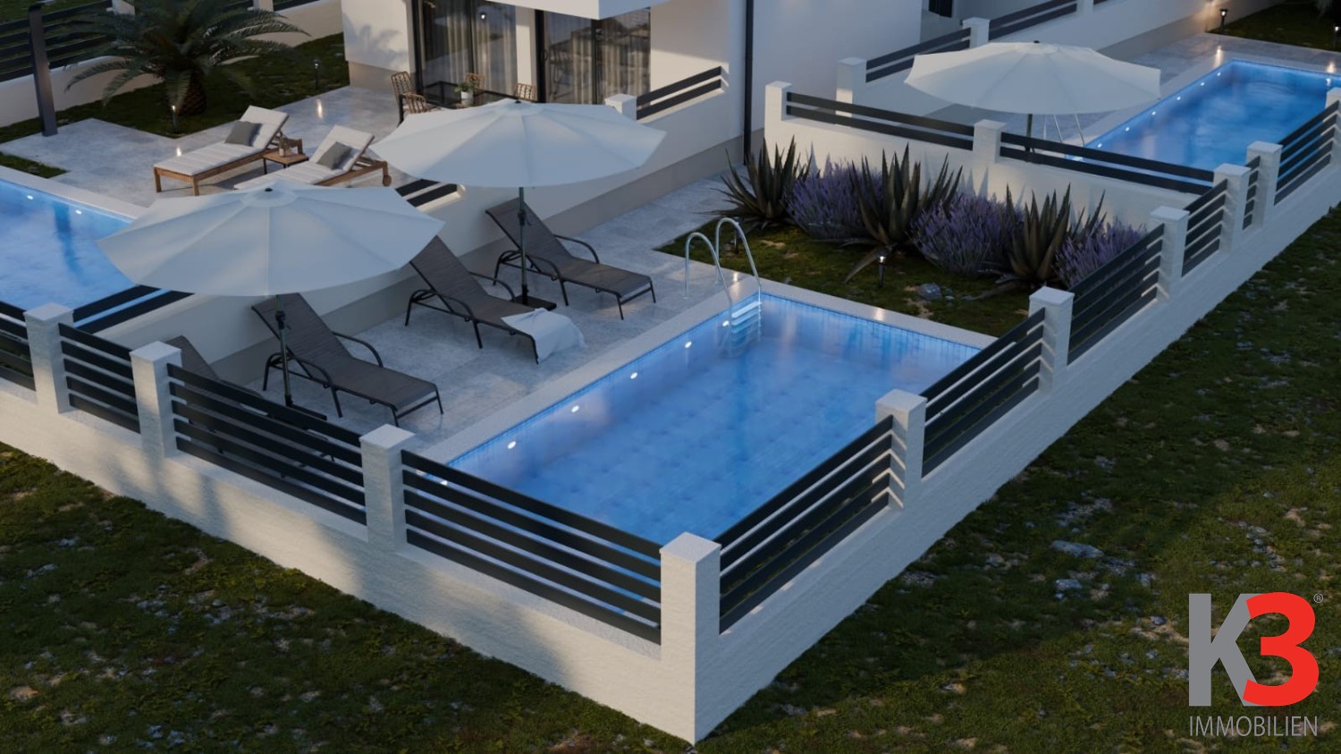 Sie befindet sich im ersten Stock eines kleinen Gebäudes mit insgesamt drei Wohneinheiten. Zur Wohnung gehört ein Garten (60 m2) mit der Möglichkeit, einen Pool zu installieren (alle Anschlüsse sind bereits vorhanden), sowie zwei private Parkplätze.