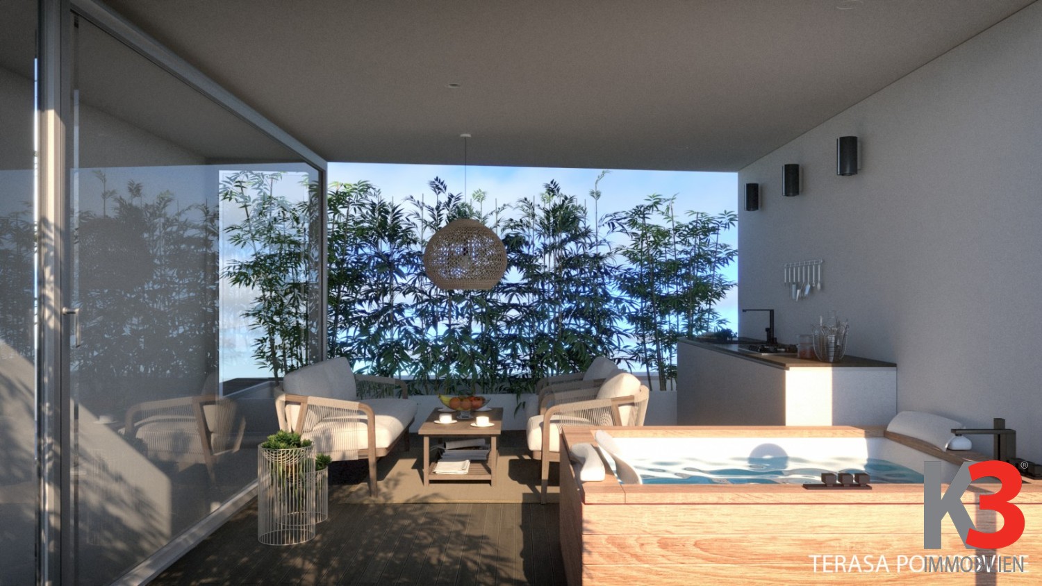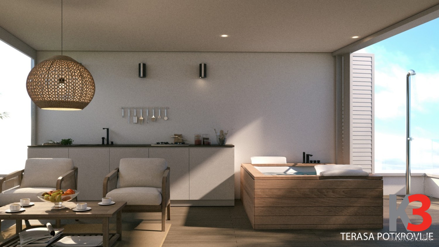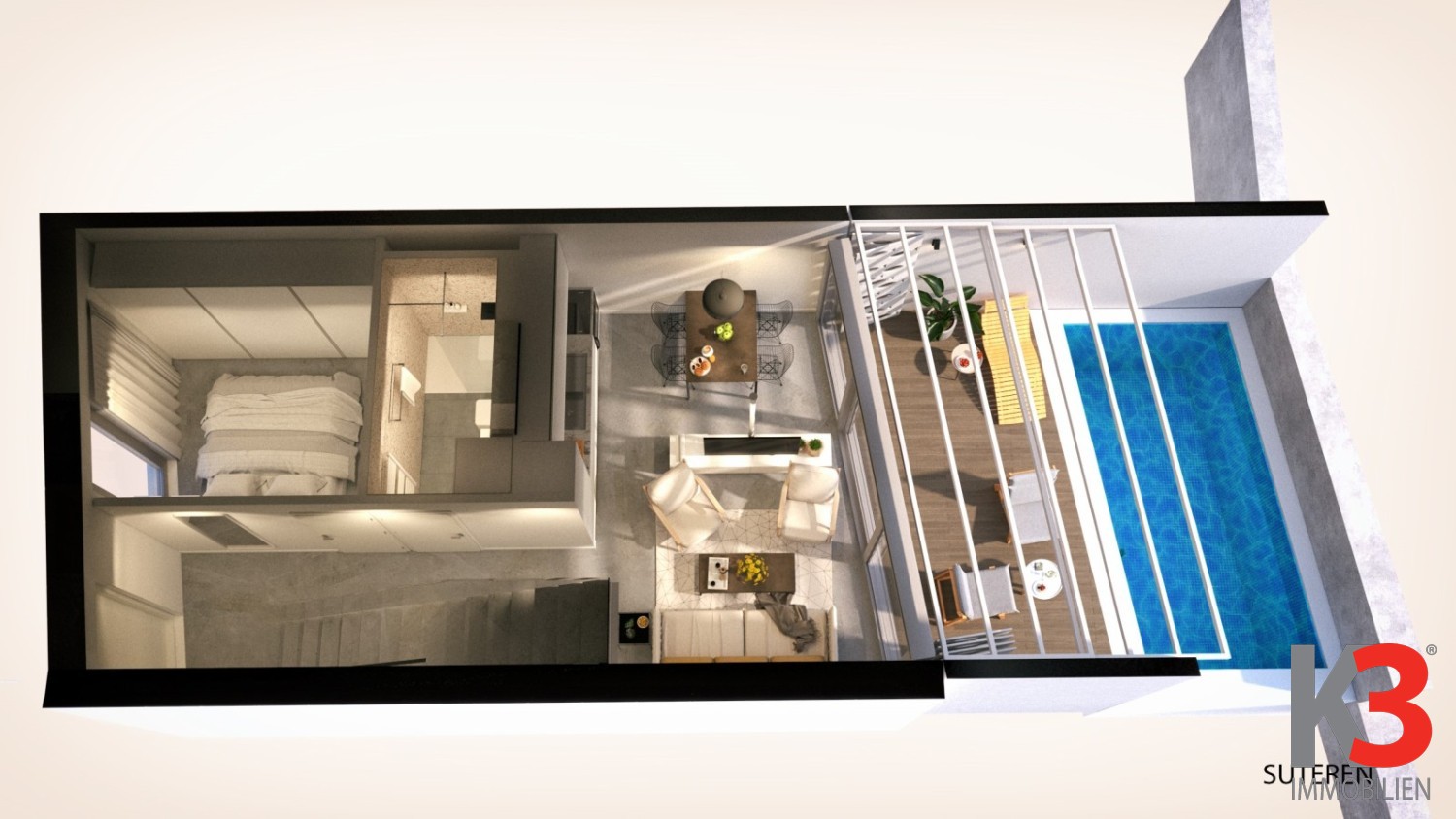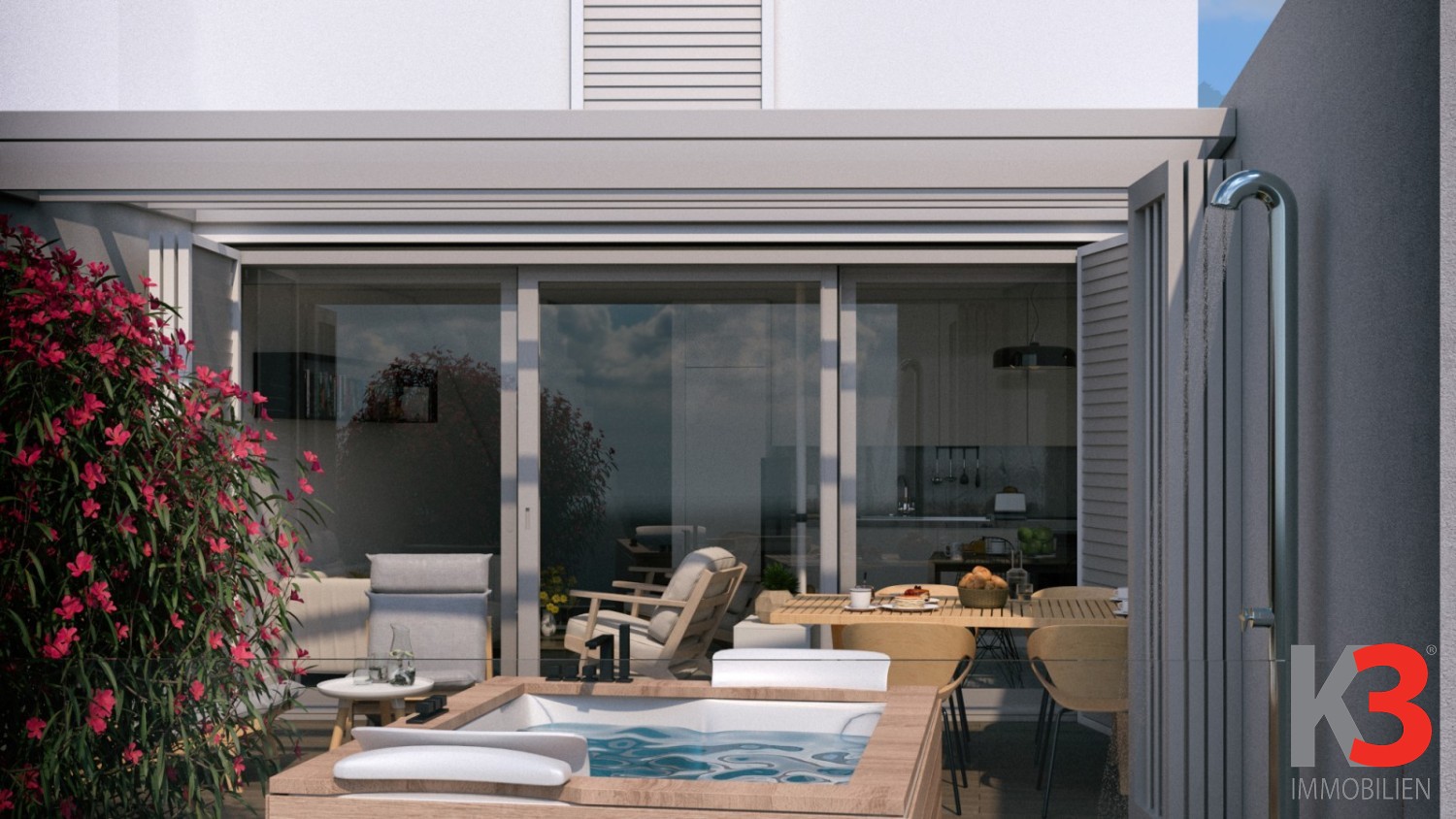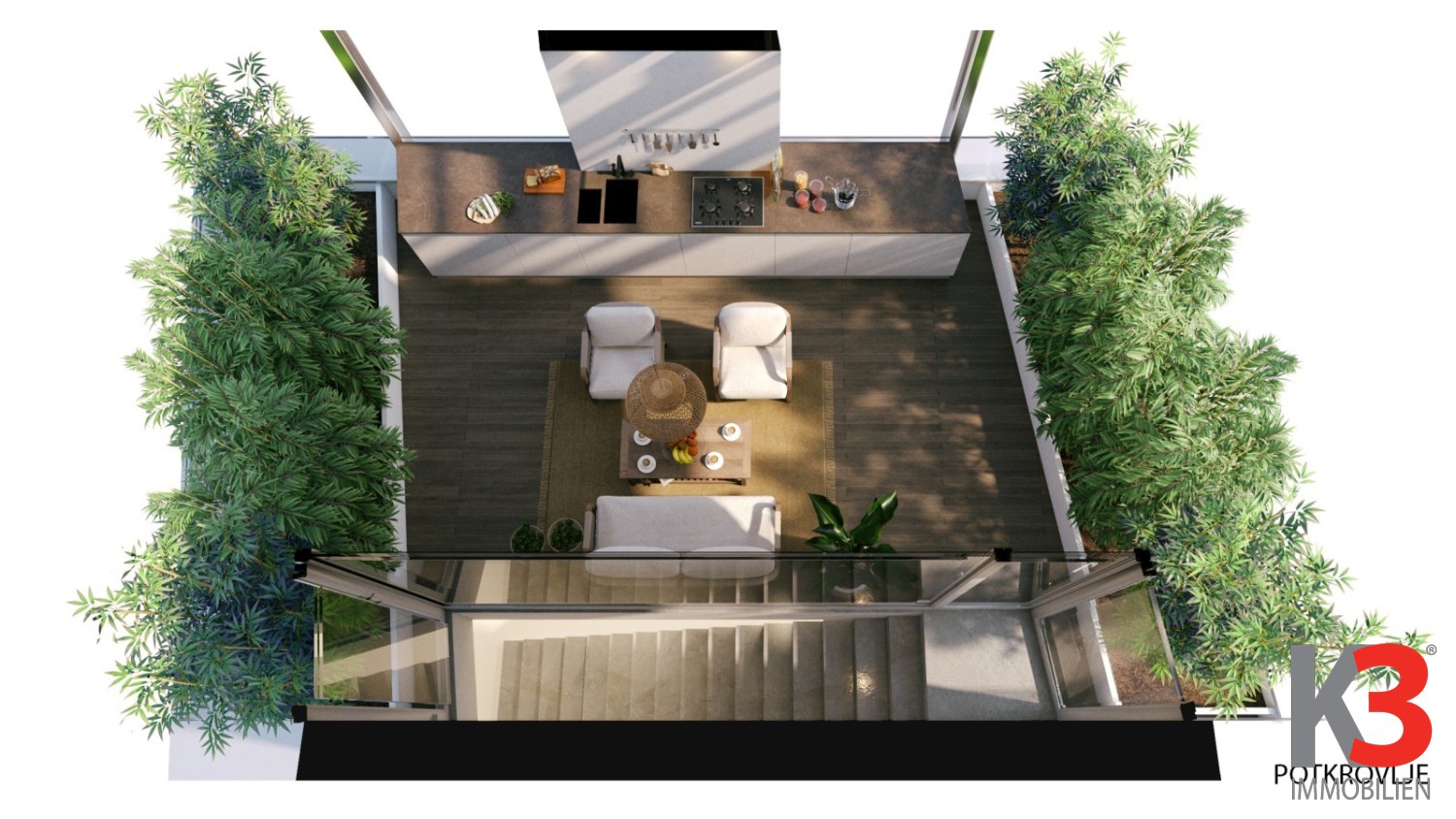 Etage 4: Loggia mit voll ausgestatteter Küche und Wohn-/Essbereich, verglast, Außendusche, Gründach, Treppe.