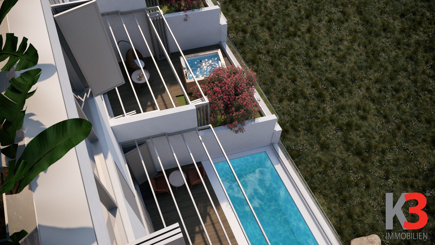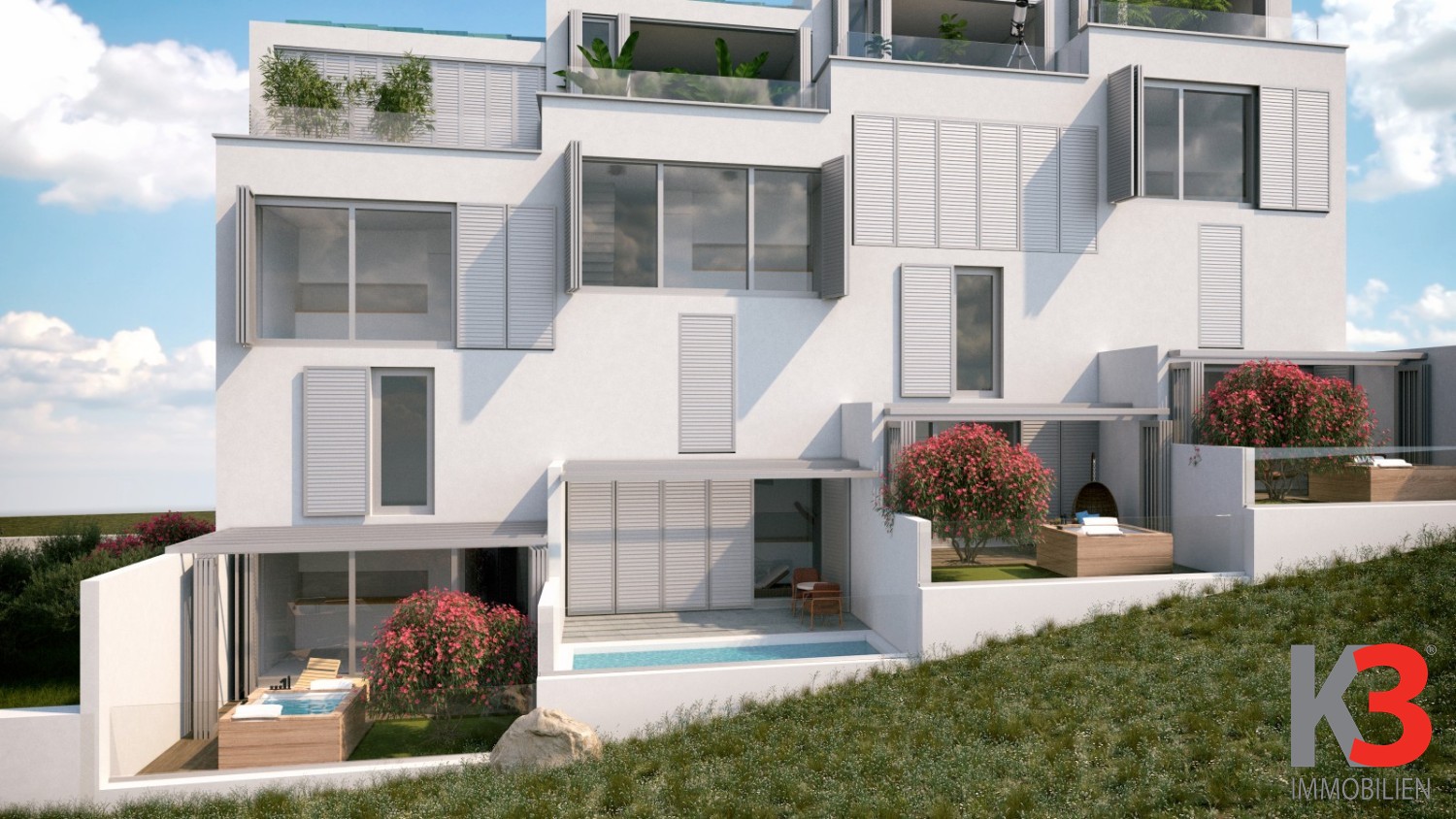 Das gesamte Projekt wurde nach höchsten Standards mit Premium-Materialien errichtet und gehört zur Kategorie nZEB (Gebäude mit nahezu null Energiebedarf). Jede Wohnung verfügt über einen eigenen Eingang über einen überdachten Bereich mit Außentreppen. Auf der Westseite befinden sich Gärten und Terrassen mit Whirlpools, je nach Wunsch des Käufers.