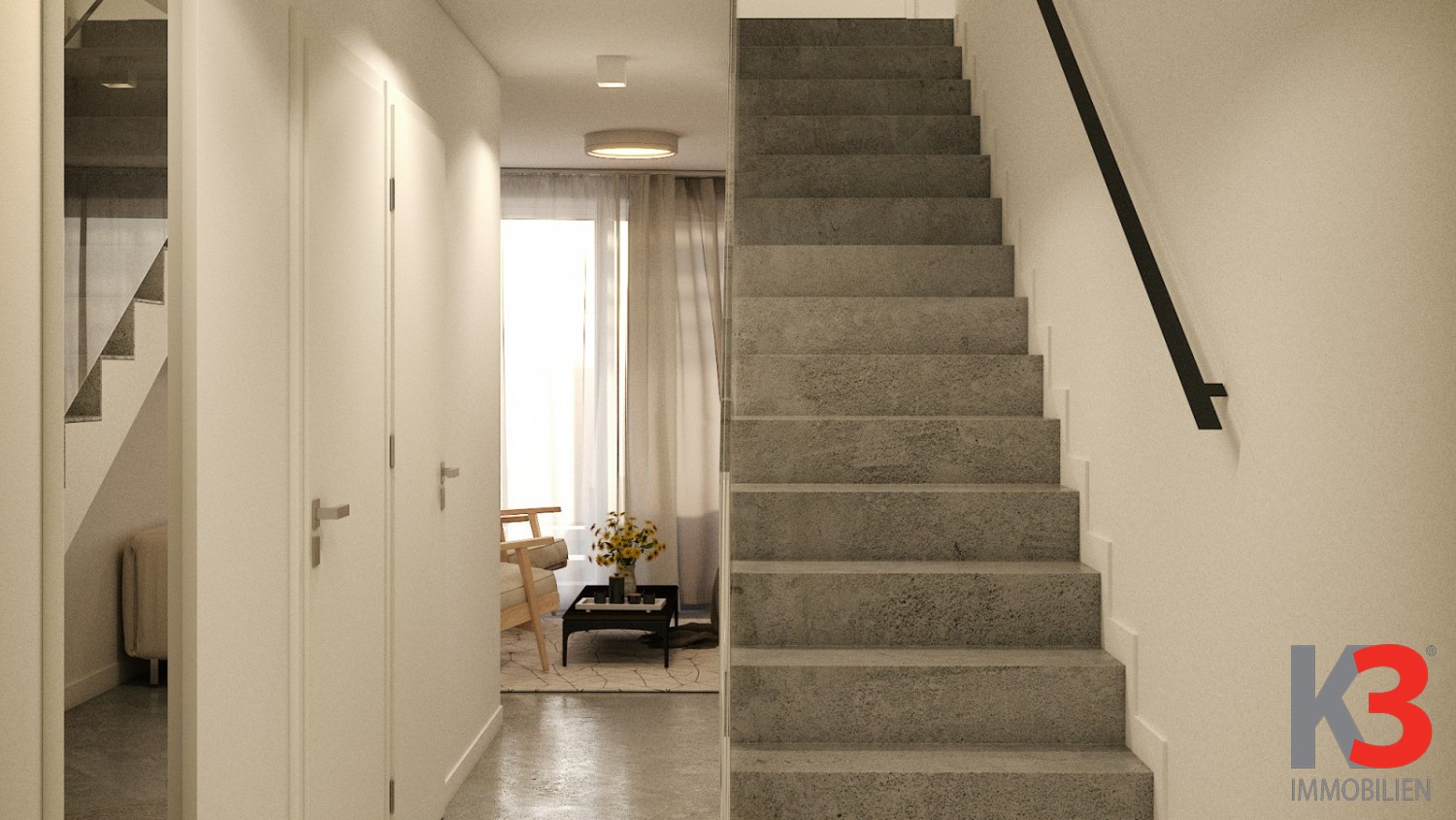 Etage 3: Wohnzimmer mit Küche und Essbereich, Schlafzimmer, Badezimmer, Flur, Treppe.