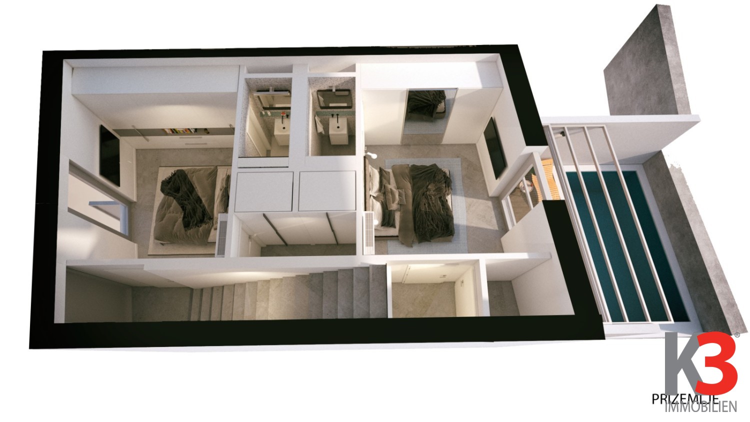 Etage 2: Zwei Schlafzimmer, zwei Badezimmer, Flur, Treppe, Abstellraum, Podest.