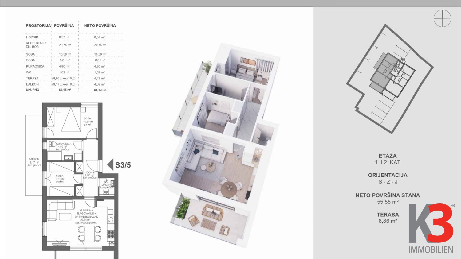Es besteht aus einem Wohnzimmer mit Küche und Essbereich, zwei Schlafzimmern, einem Badezimmer, einem separaten WC, einer Terrasse, einem Balkon und einem Flur.