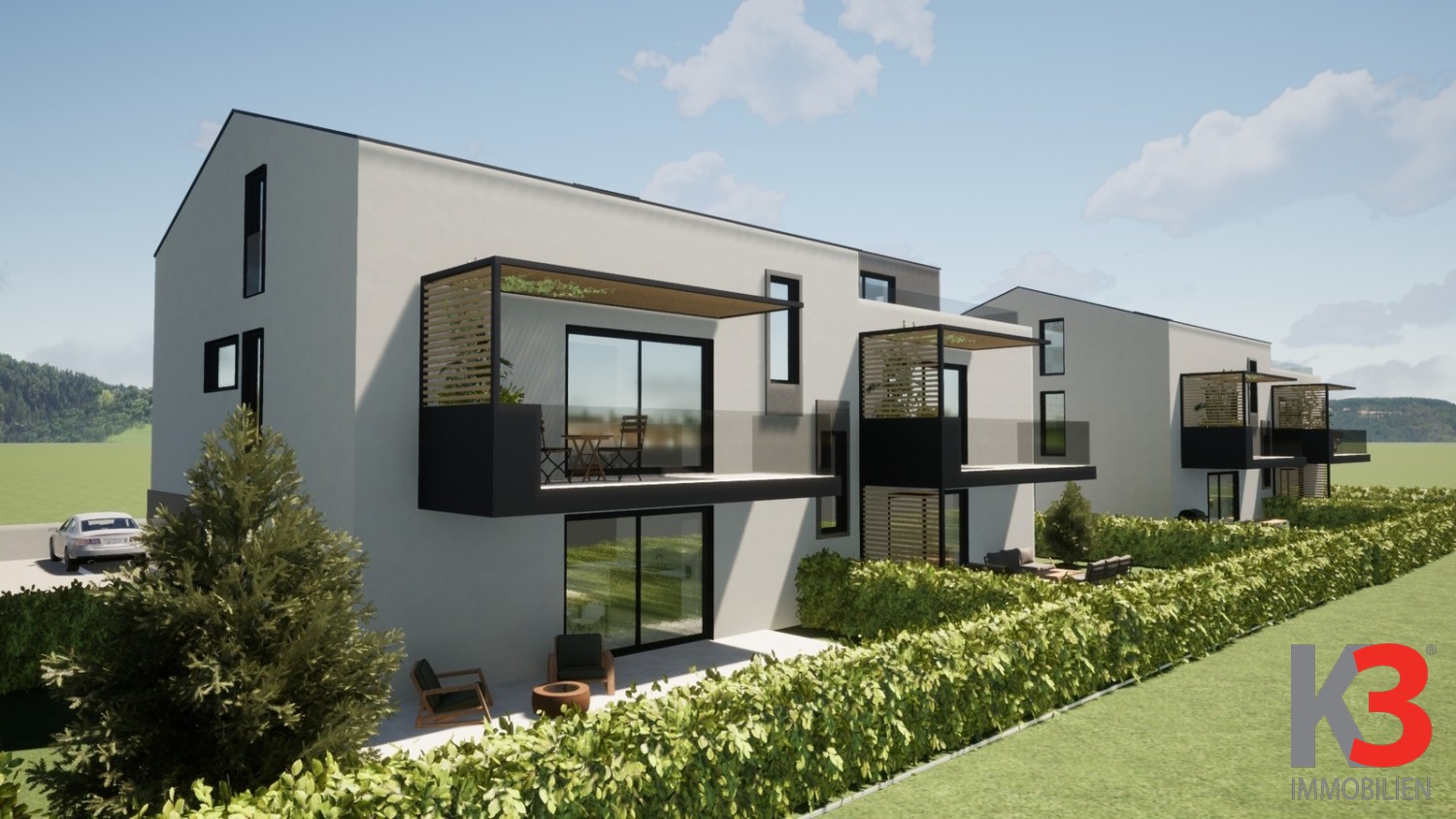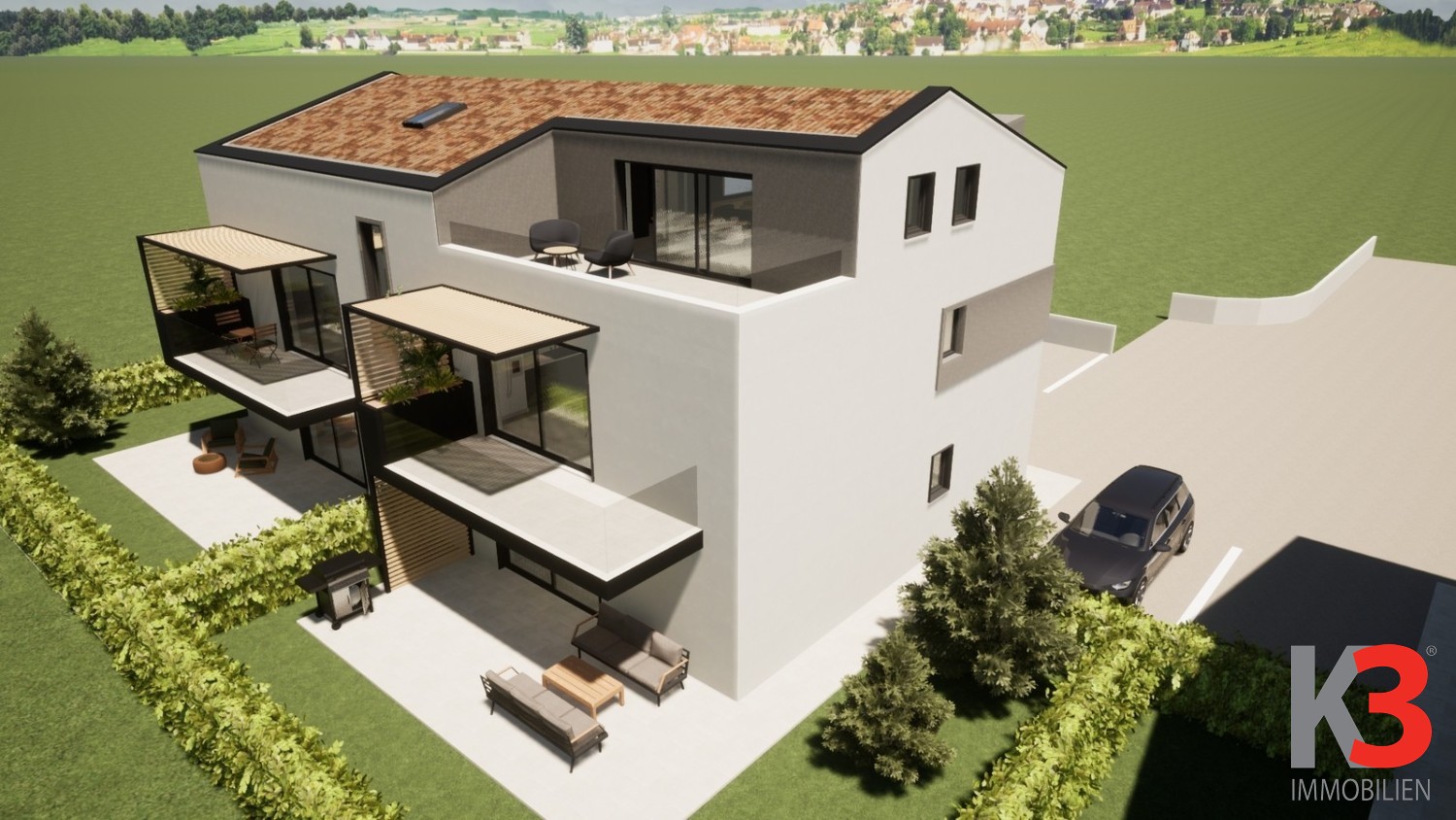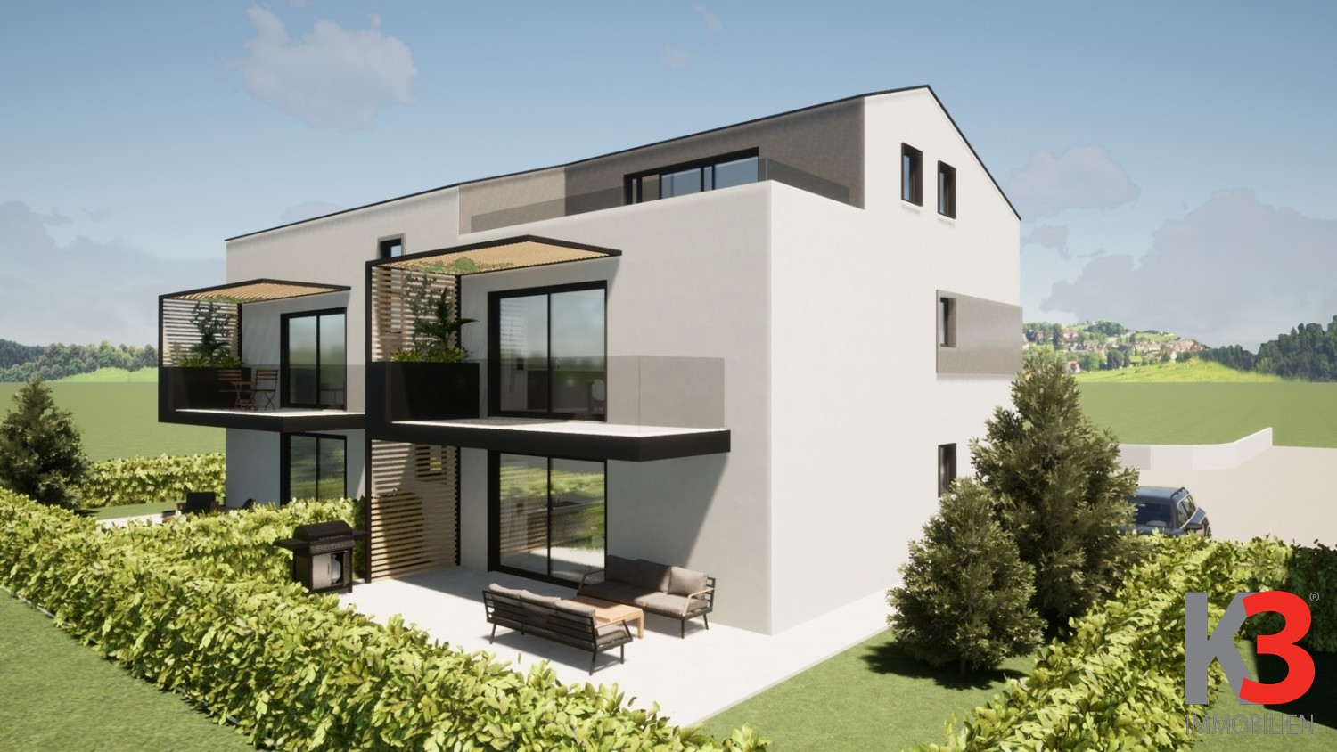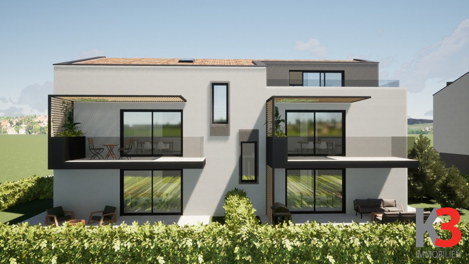 Die Wohnung befindet sich im Erdgeschoss eines modernen Neubaus und öffnet sich zu einer überdachten Terrasse und einem Garten. Dieser Bereich ist perfekt, um Sommerabende zu genießen.