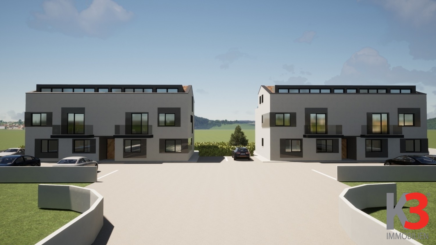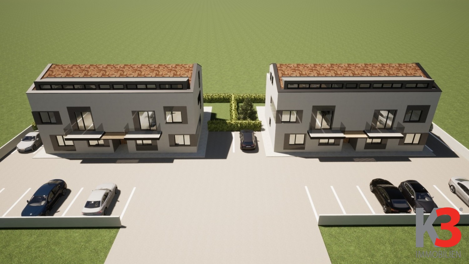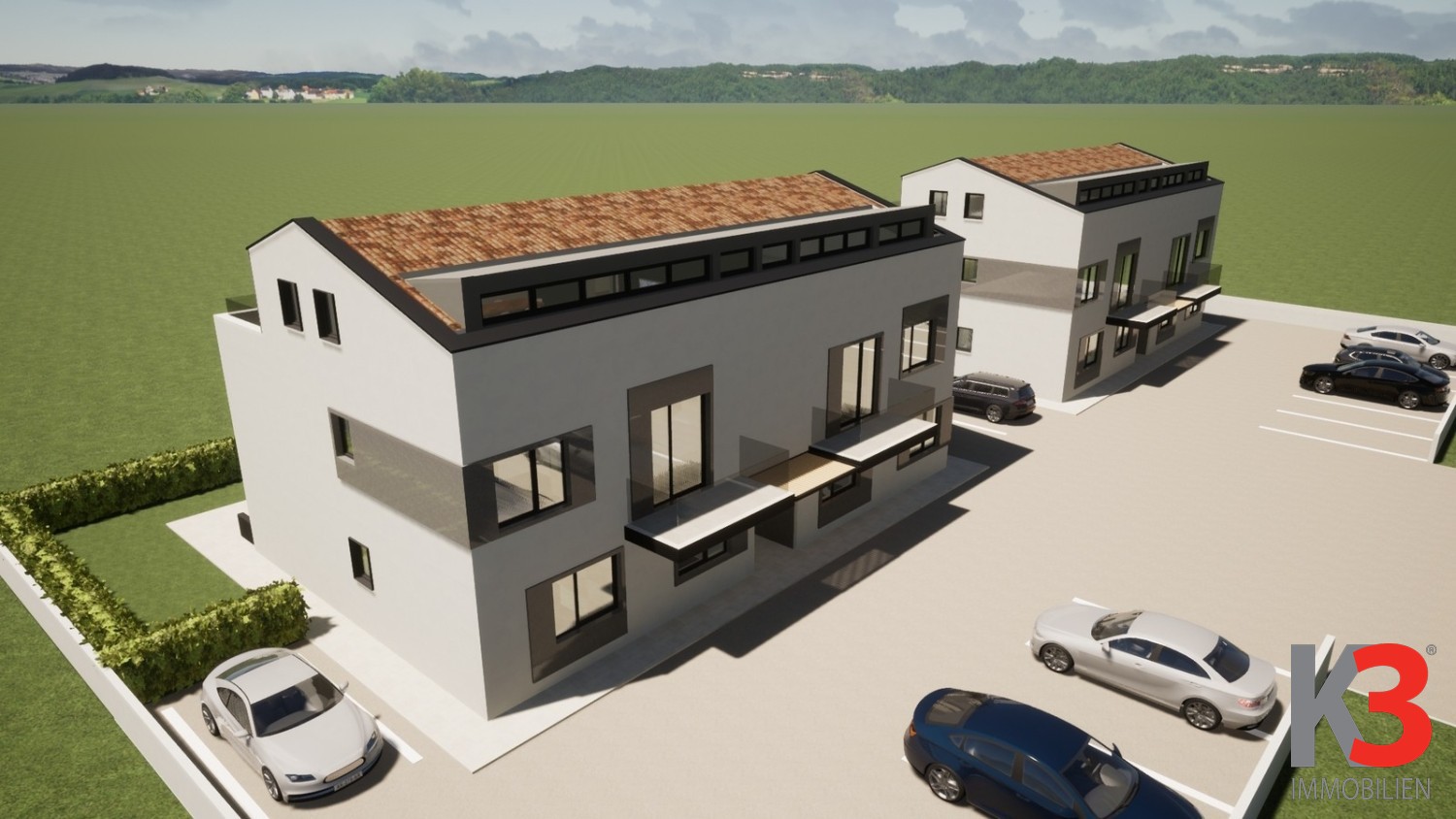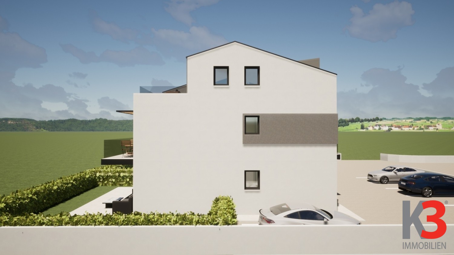 Die Wohnung befindet sich im Erdgeschoss eines modernen Neubaus und öffnet sich zu einer überdachten Terrasse und einem Garten. Dieser Bereich ist perfekt, um Sommerabende zu genießen.