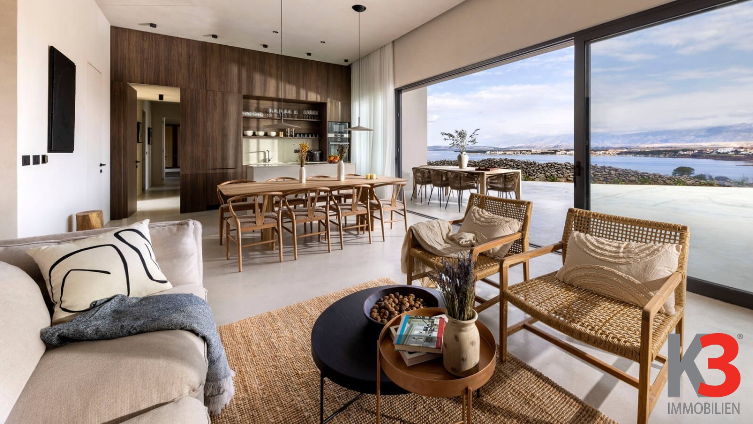 Zum Verkauf: Moderne Luxusvilla mit atemberaubendem Meerblick in Povljana auf der Insel Pag. Diese luxuriöse Immobilie wurde 2024 erbaut und liegt nur 400 Meter vom Meer entfernt. Das Haus zeichnet sich durch einen modernen Baustil mit dominanten Betonelementen aus. Es verfügt über 341 m² Wohnfläche, die sich auf einer einzigen Etage befinden, und liegt auf einem 1400 m² großen Grundstück. Das geräumige Wohnzimmer ist mit einer voll ausgestatteten Küche verbunden und führt durch Glaswände auf eine große Terrasse. Auf der Terrasse befindet sich ein Außenpool mit herrlichem Meerblick. Darüber hinaus bietet das Haus vier Schlafzimmer mit jeweils eigenem Badezimmer und Platz für bis zu acht Personen. Parkplätze sind auf dem Grundstück vorhanden, einschließlich einer Ladestation für Elektroautos.