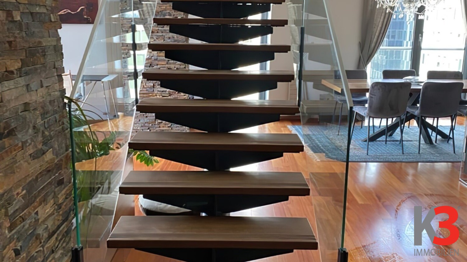 Die Wohnung erstreckt sich über die fünfte und sechste Etage eines neunstöckigen Gebäudes aus dem Jahr 2010.