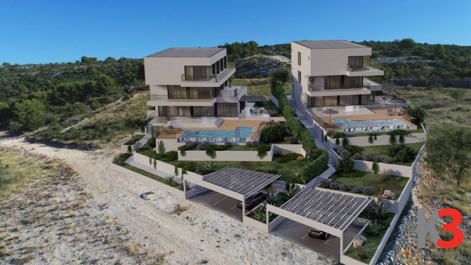 In Rogoznica steht eine im Bau befindliche Luxusvilla mit Swimmingpool und wunderschönem Meerblick zum Verkauf. Für die Villa liegt eine Baugenehmigung vor, geplanter Baubeginn ist der 10.2024, die Fertigstellung Ende 2025. Die Villa erstreckt sich über 3 Etagen, die jeweils einen Grundriss von ca. 130 m2 haben, verfügt über viele Terrassen, ein Außenpool und ein Parkplatz für Autos. Im Erdgeschoss der Villa wird es ein Wohnzimmer geben, das mit der Küche und dem Esszimmer verbunden ist, einen Wellnessraum mit Toilette und eine zusätzliche Toilette.