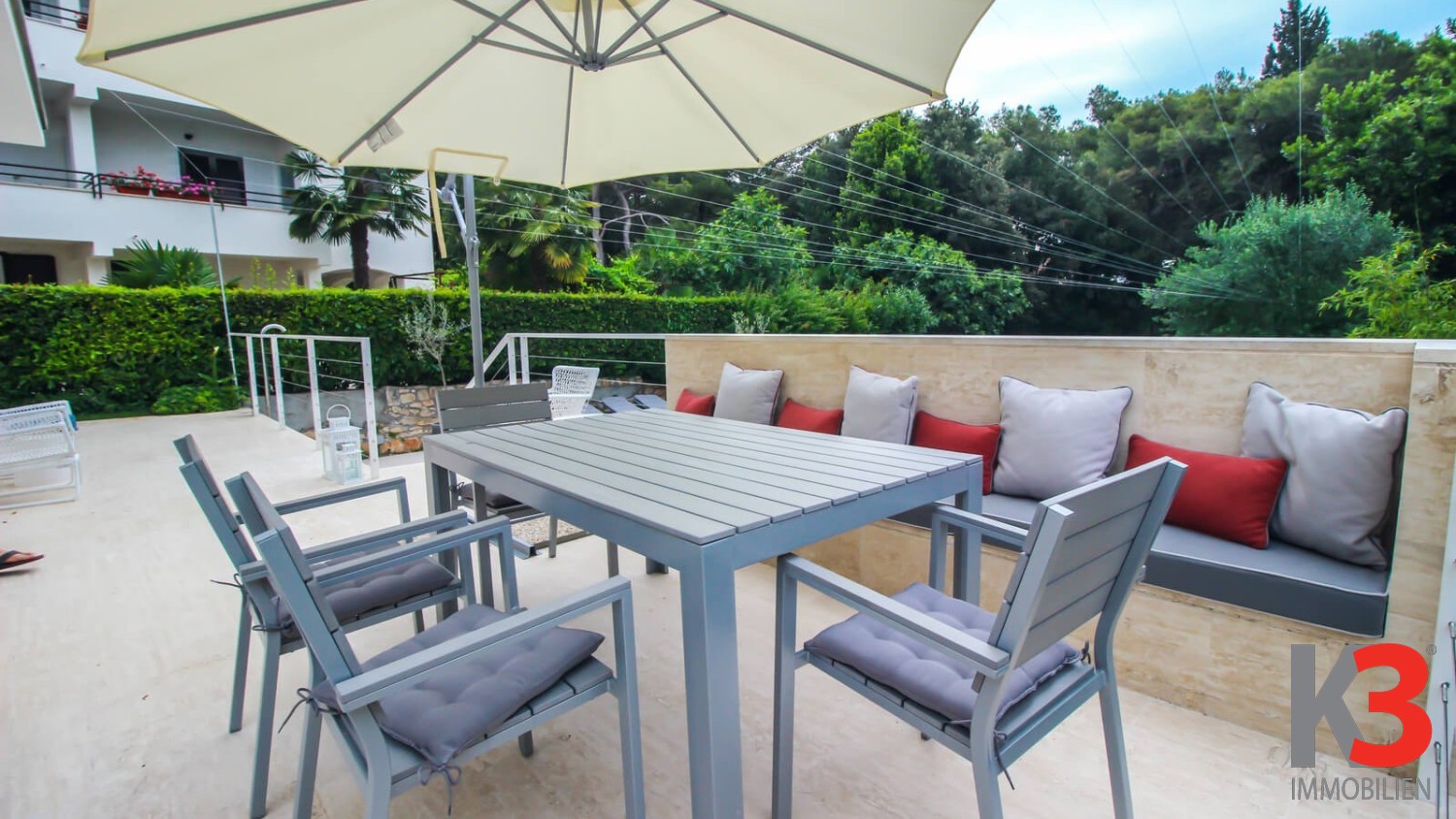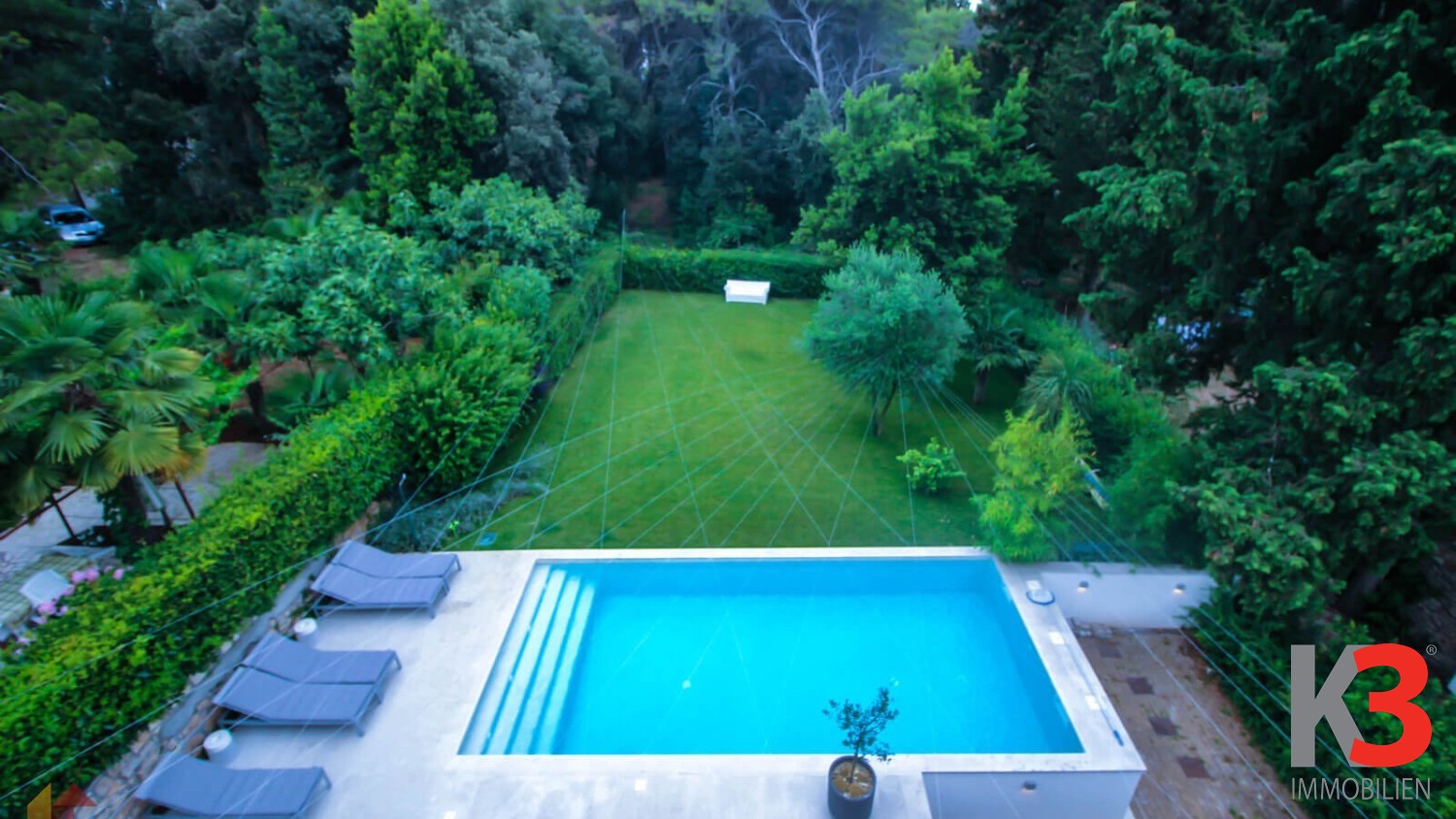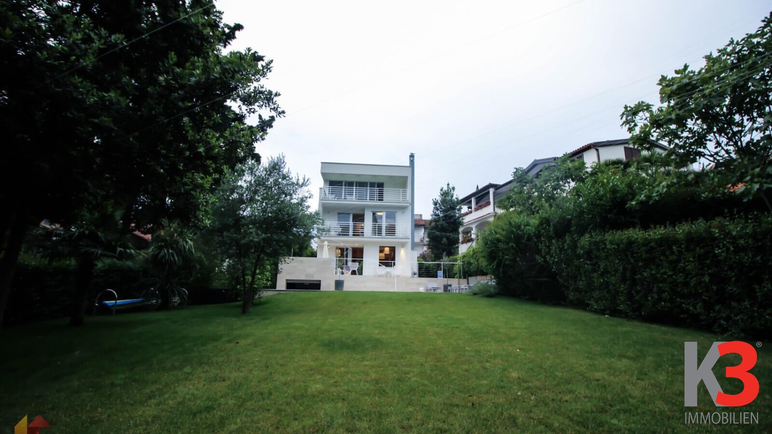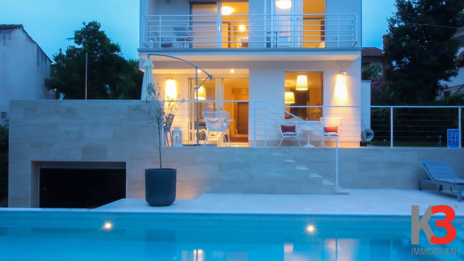 Ein luxuriöses Haus mit Pool steht in Rovinj, im Stadtteil Borik, in der Nähe des Meeres zum Verkauf. Das Haus befindet sich auf einem vollständig eingezäunten Grundstück von 700 m² und bietet Platz für 3 Autos. Das Haus wurde 2014 erbaut, hat eine Wohnfläche von 250 m² und erstreckt sich über 3 Etagen. Vor dem Haus befindet sich ein schön angelegter Garten mit viel Grün und einem Außenpool, umgeben von Sonnenliegen.
