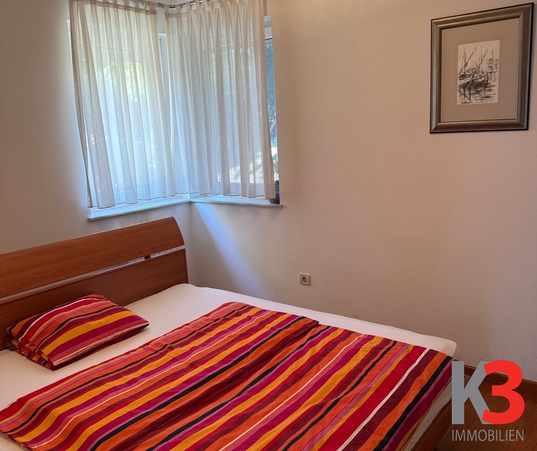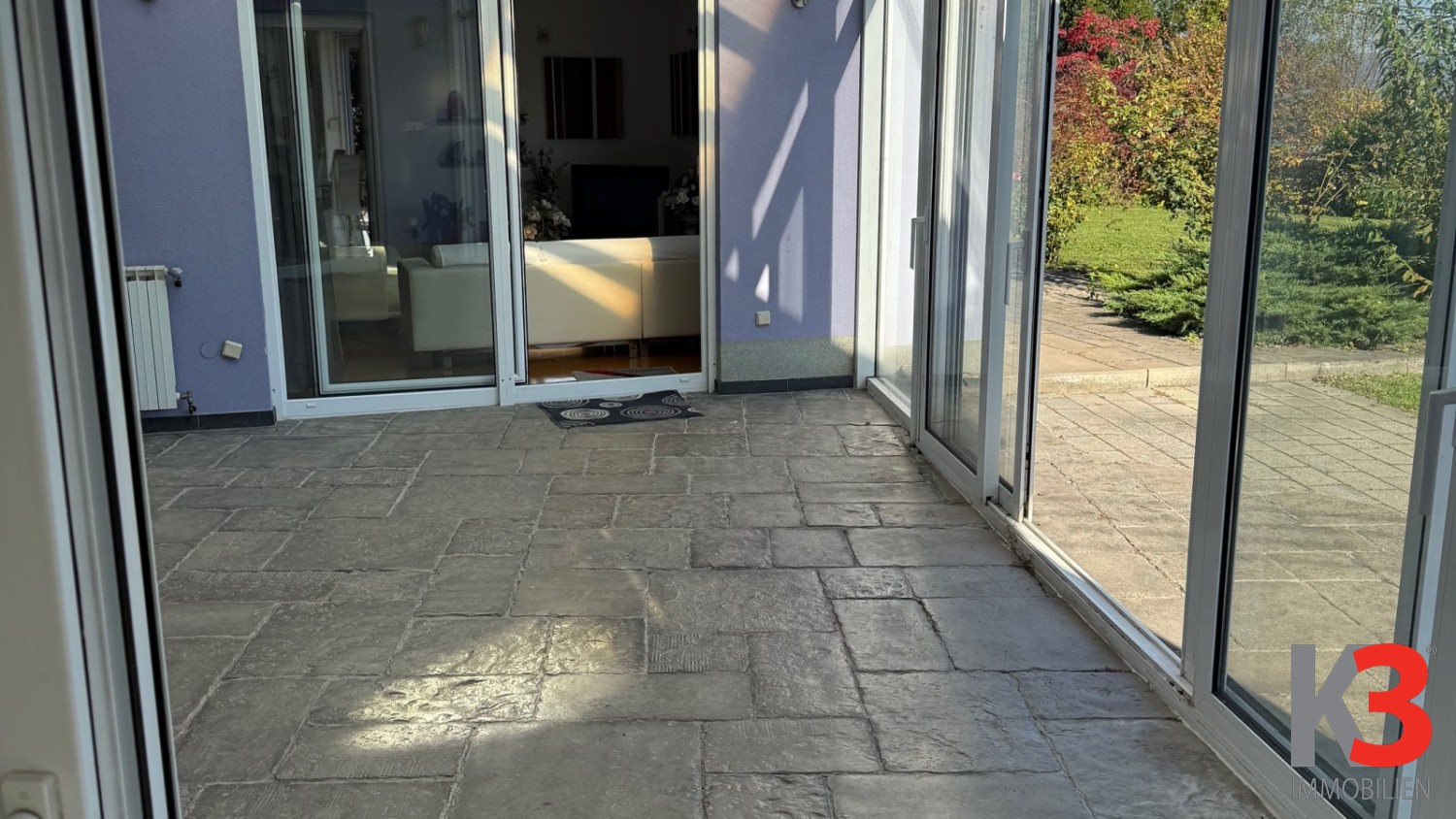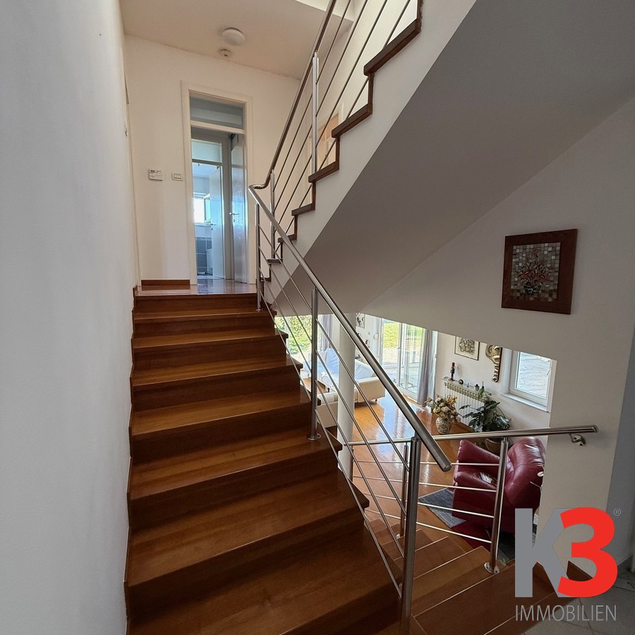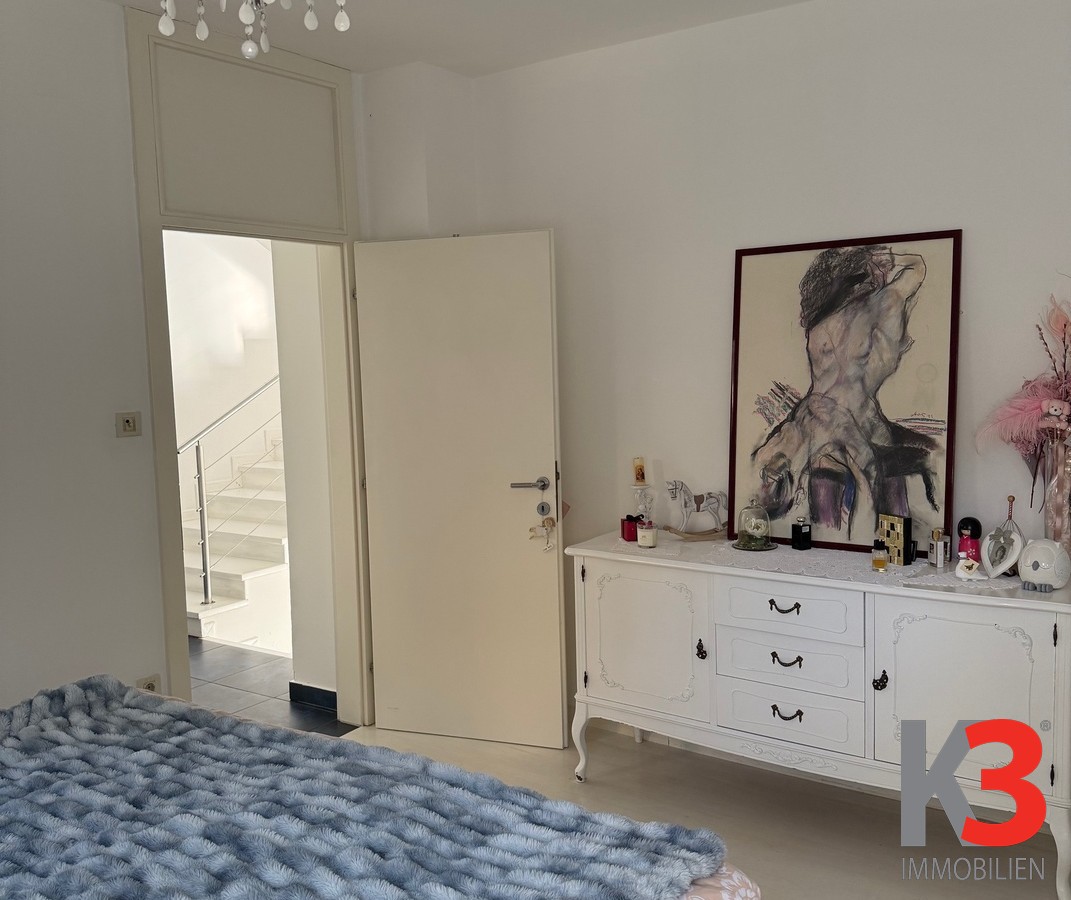 Im Keller befindet sich ein großer Abstellraum, der vom Wohnzimmer aus zugänglich ist, und über eine weitere Treppe gelangt man auf die Hofseite.