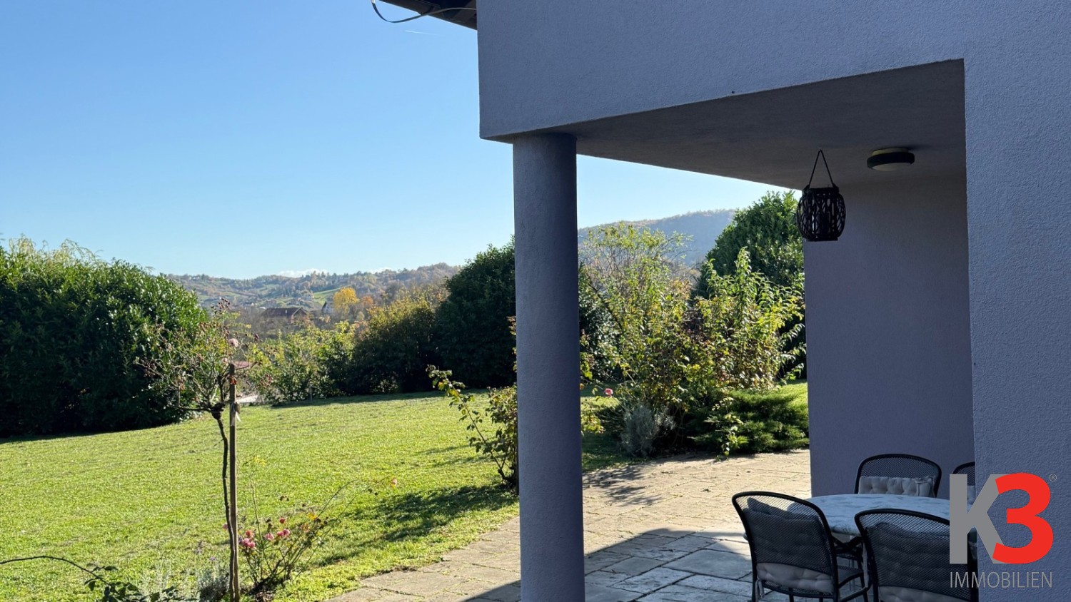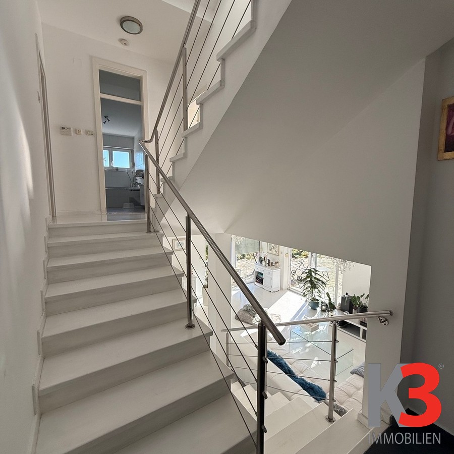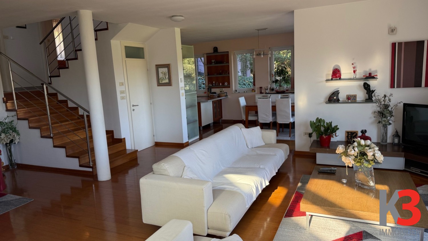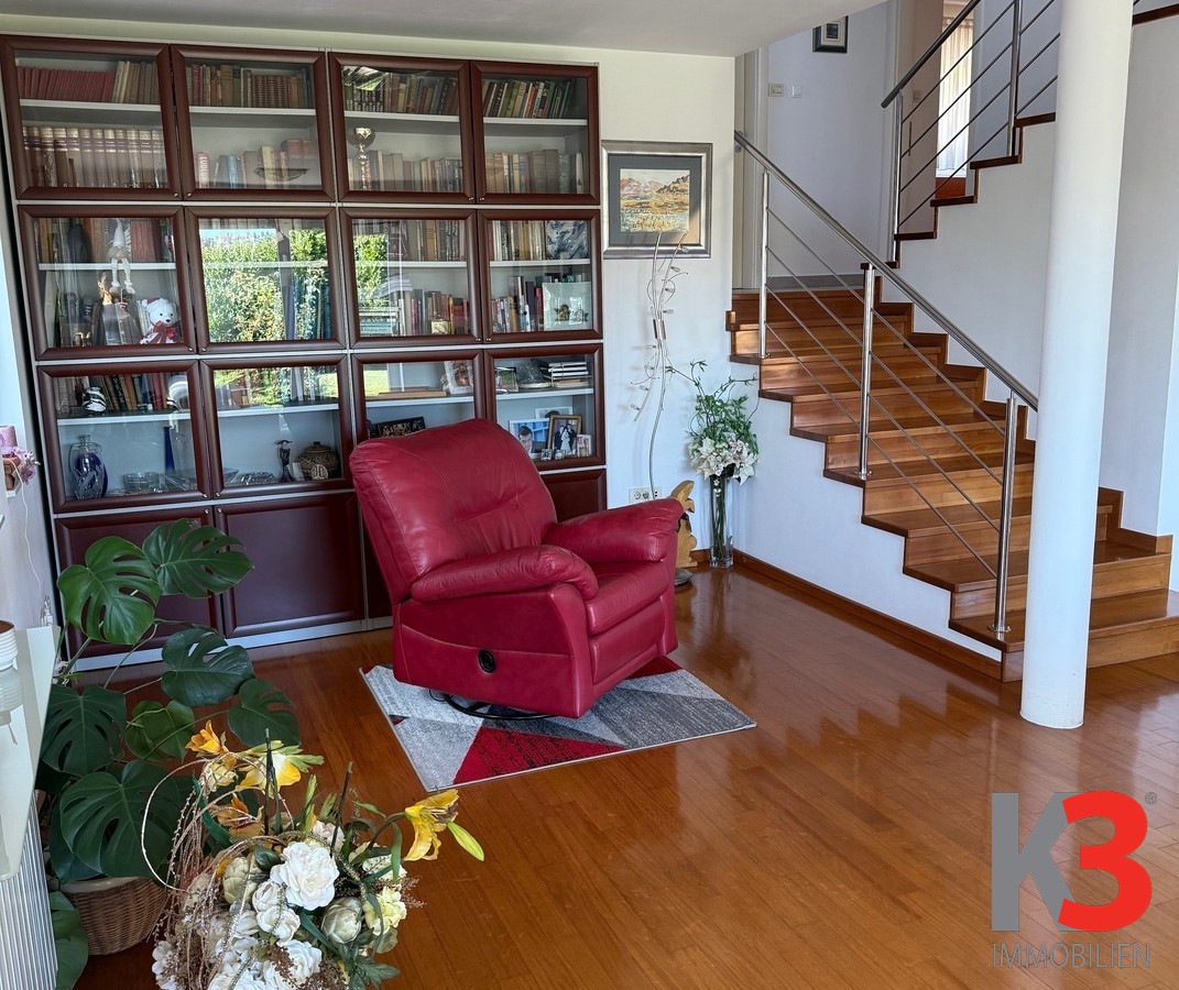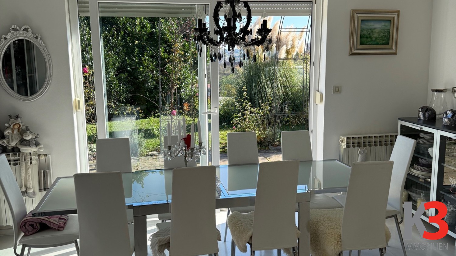 Das großzügige Wohnzimmer öffnet sich durch große Glasfronten zu den Terrassen und dem Grünbereich und schafft so eine harmonische Verbindung zwischen Innen- und Außenbereich. Der offene Küchenbereich fügt sich nahtlos an den Essbereich an und bietet einen fließenden, funktionalen Raum – ideal für den Alltag und gesellige Momente.