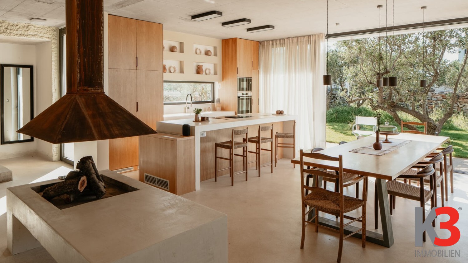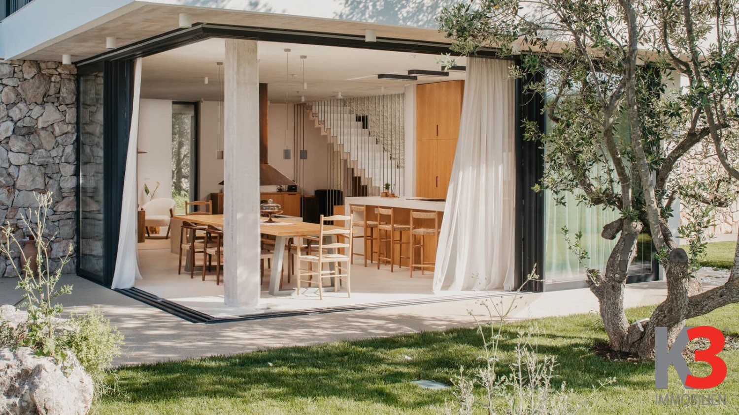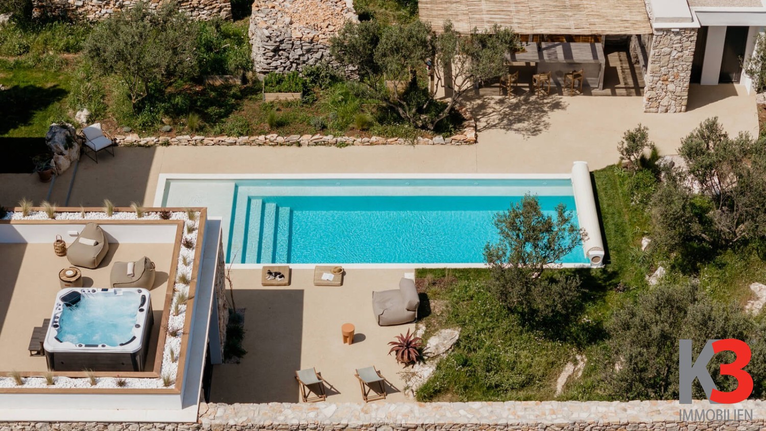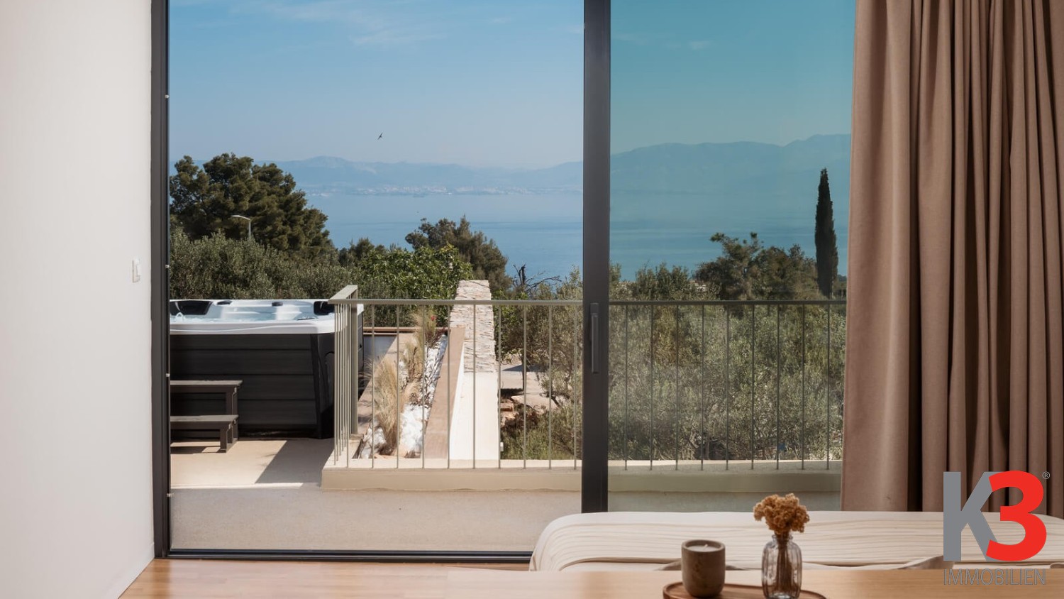 Die Villa ist 270 m² groß, verfügt über 4 Schlafzimmer und 3 Badezimmer. Im Erdgeschoss befinden sich ein geräumiges, minimalistisch eingerichtetes Wohnzimmer mit einem Olivenbaum und eine voll ausgestattete Küche, die auf eine Terrasse mit einem Außenpool führt. Am Pool gibt es eine überdachte Außenküche, eine Sauna und Sonnenliegen. Die Schlafzimmer im Obergeschoss haben Zugang zu einer großen Terrasse mit Jacuzzi, die einen herrlichen Panoramablick auf das Meer bietet. Auf dem Anwesen gibt es ausreichend Parkplätze, und auf der Rückseite der Villa befindet sich eine Garage für zwei Fahrzeuge.