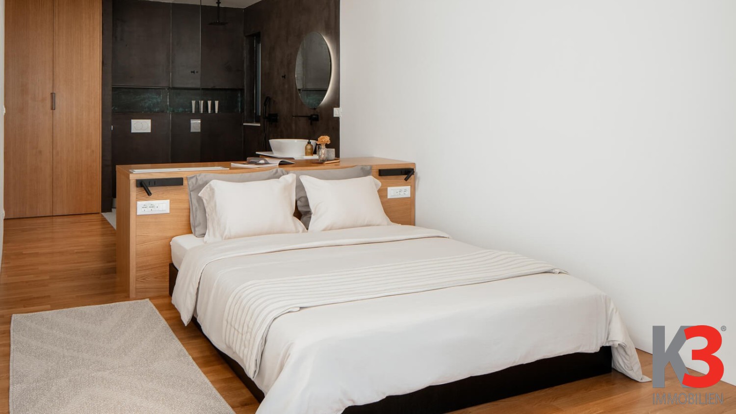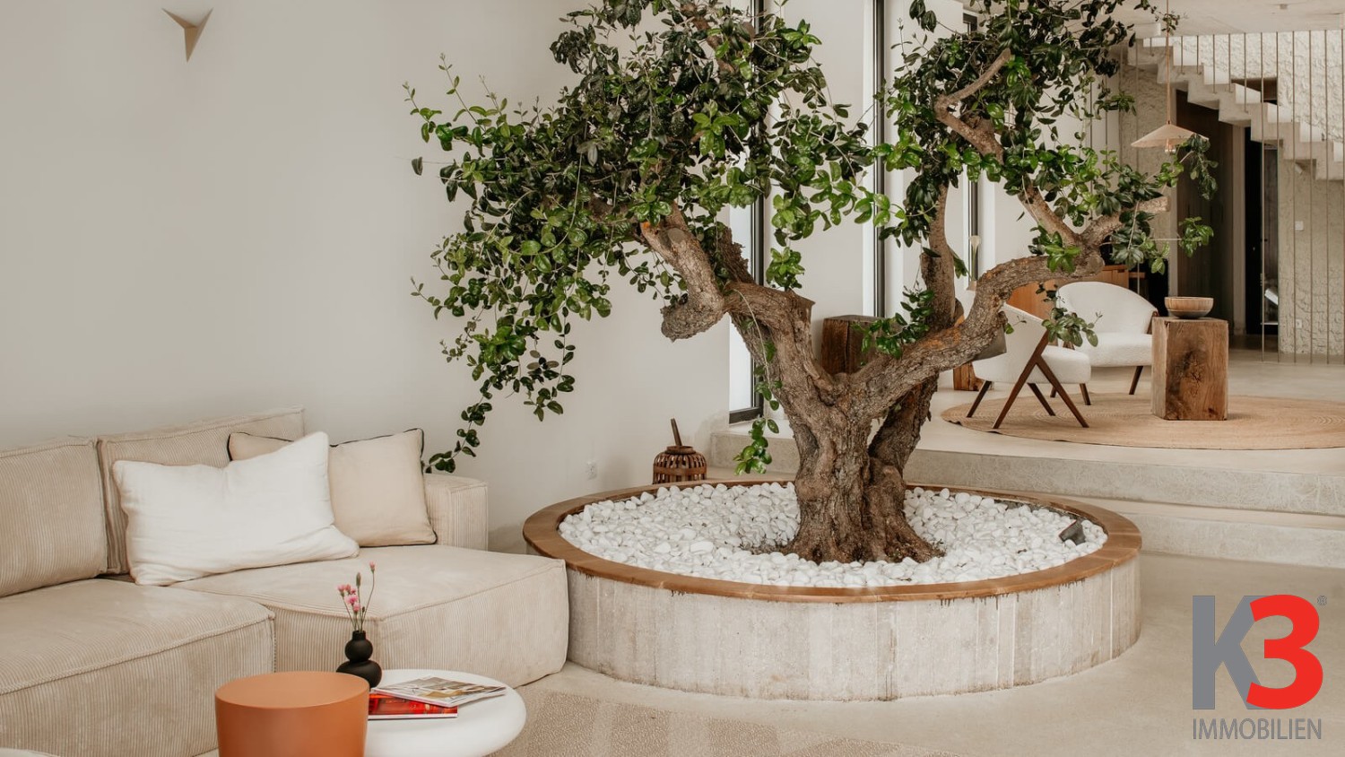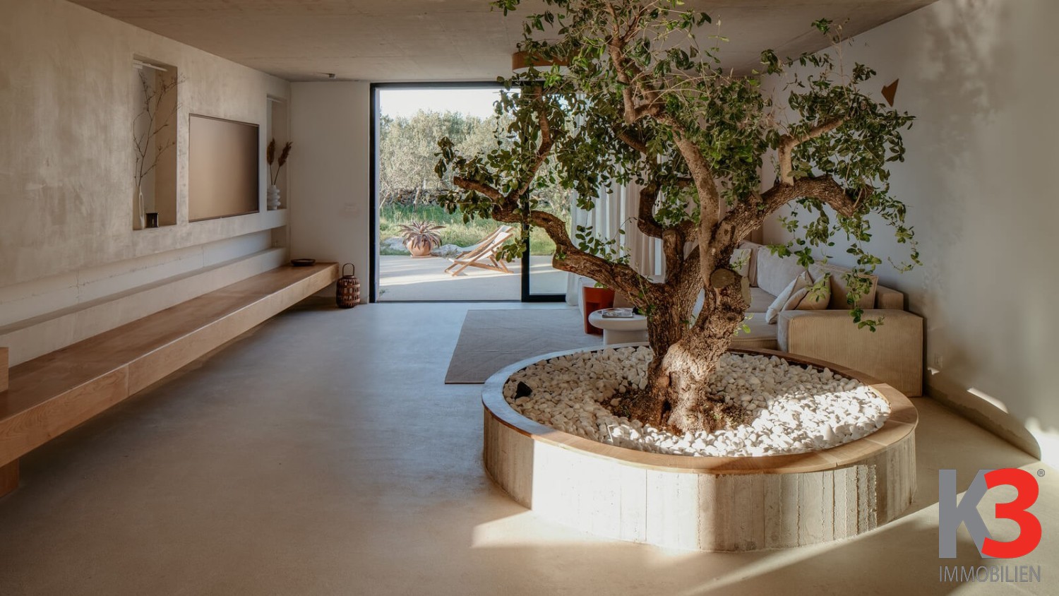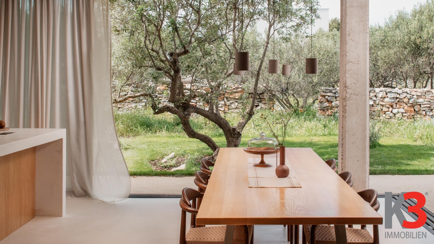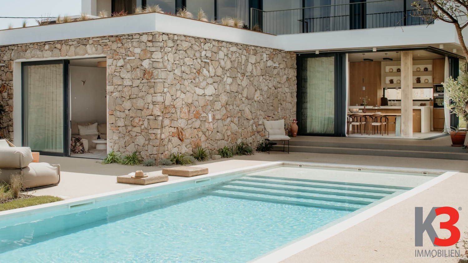 Die Villa ist 270 m² groß, verfügt über 4 Schlafzimmer und 3 Badezimmer. Im Erdgeschoss befinden sich ein geräumiges, minimalistisch eingerichtetes Wohnzimmer mit einem Olivenbaum und eine voll ausgestattete Küche, die auf eine Terrasse mit einem Außenpool führt. Am Pool gibt es eine überdachte Außenküche, eine Sauna und Sonnenliegen. Die Schlafzimmer im Obergeschoss haben Zugang zu einer großen Terrasse mit Jacuzzi, die einen herrlichen Panoramablick auf das Meer bietet. Auf dem Anwesen gibt es ausreichend Parkplätze, und auf der Rückseite der Villa befindet sich eine Garage für zwei Fahrzeuge.