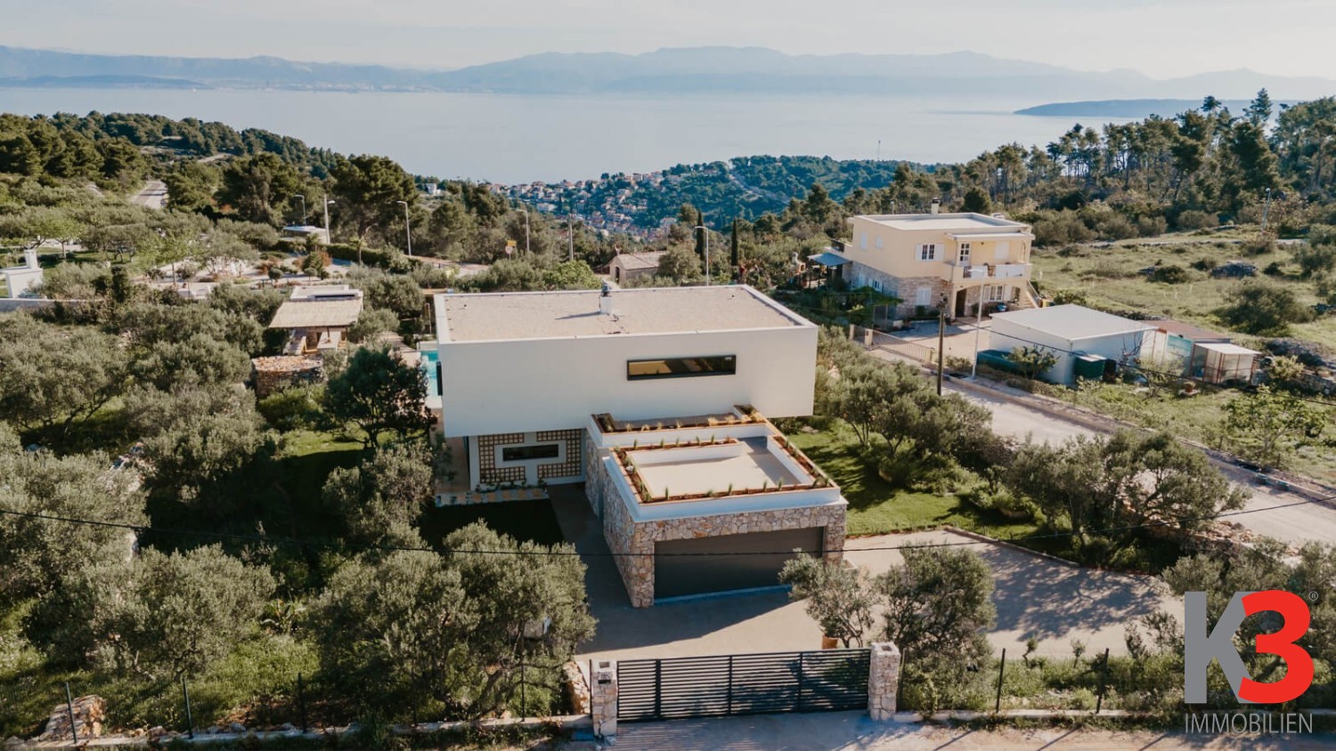 Luxuriöse Villa mit atemberaubendem Meerblick auf der Insel Šolta in Dalmatien zu verkaufen. Diese moderne Villa befindet sich im ruhigen Dorf Gornje Selo und bietet einen Panoramablick auf das Meer Richtung Split. Die Villa wurde 2024 auf einem vollständig eingezäunten Grundstück von 1.800 m² errichtet und vereint gekonnt moderne und traditionelle Materialien mit Stein- und Betonwänden.