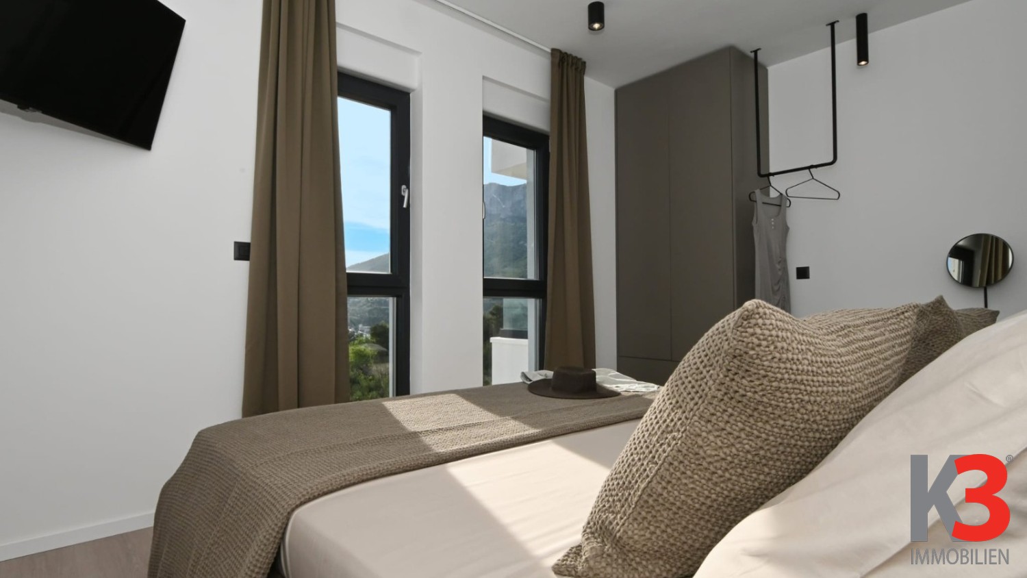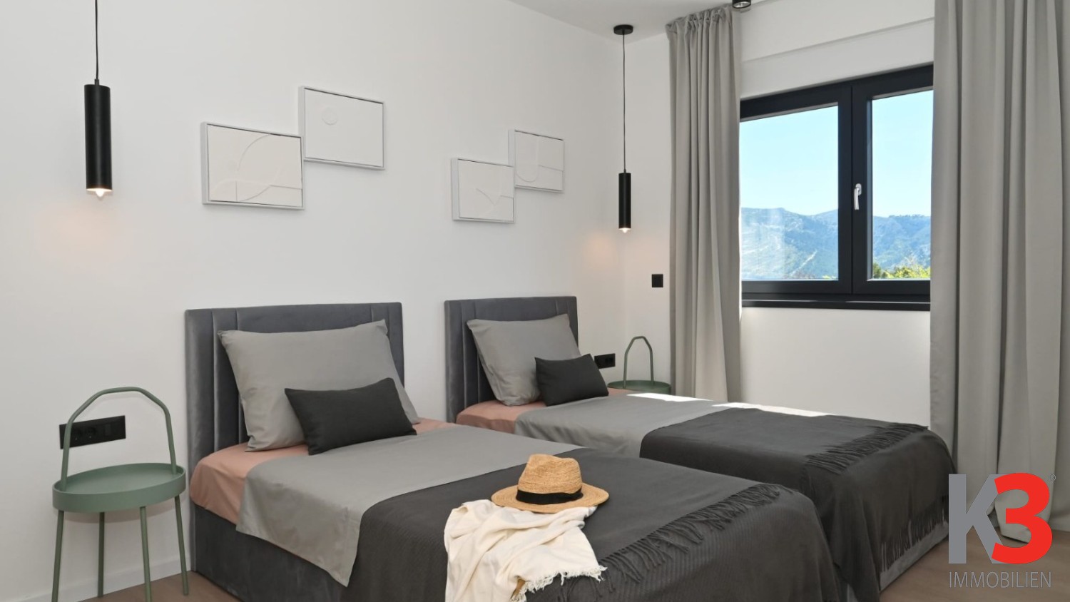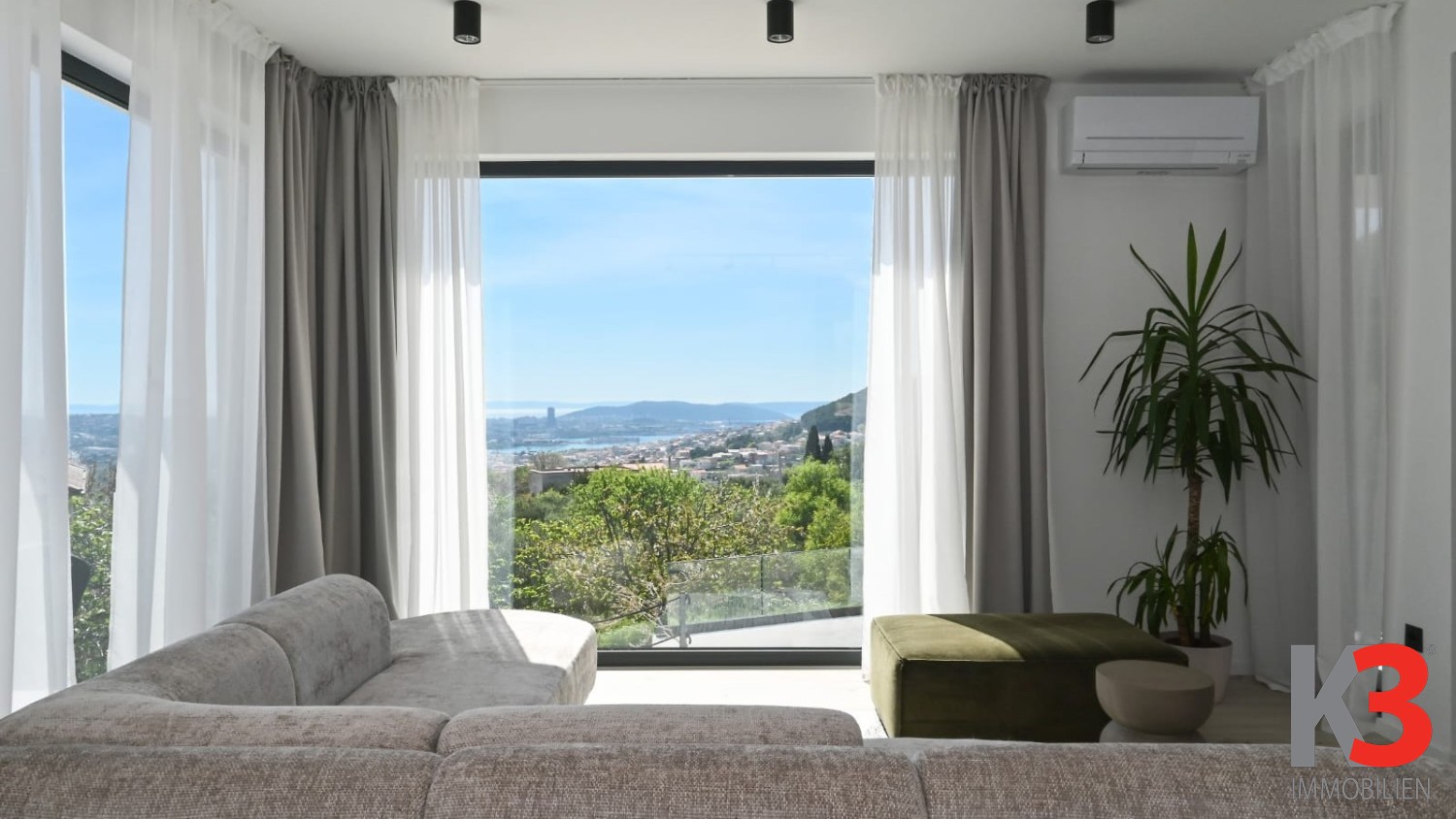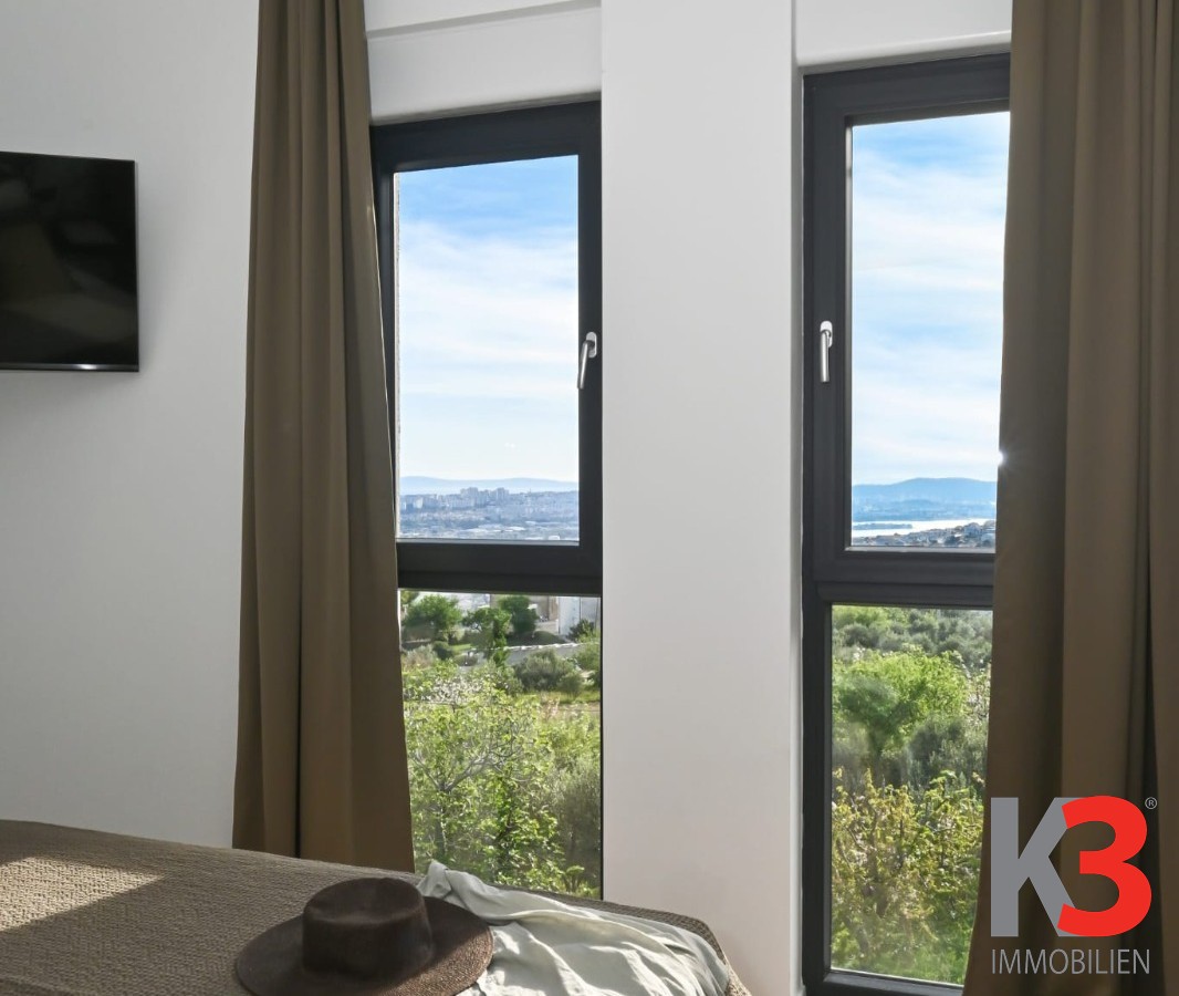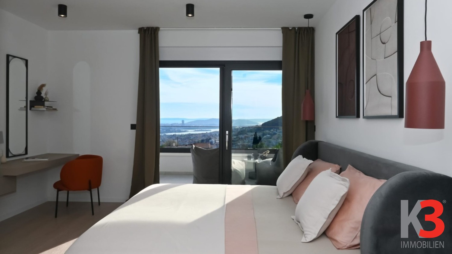 Das erste Stockwerk besteht aus drei Schlafzimmern, die jeweils mit Panoramablick ausgestattet sind. Das Hauptschlafzimmer verfügt über ein eigenes Badezimmer und eine Terrasse. Stellen Sie sich vor, Sie wachen im Bett auf und genießen den atemberaubenden Blick auf Split und seine Inseln. Alle Schlafzimmer sind mit sorgfältig ausgewählten Materialien ausgestattet und verfügen über einen TV und eine Klimaanlage.