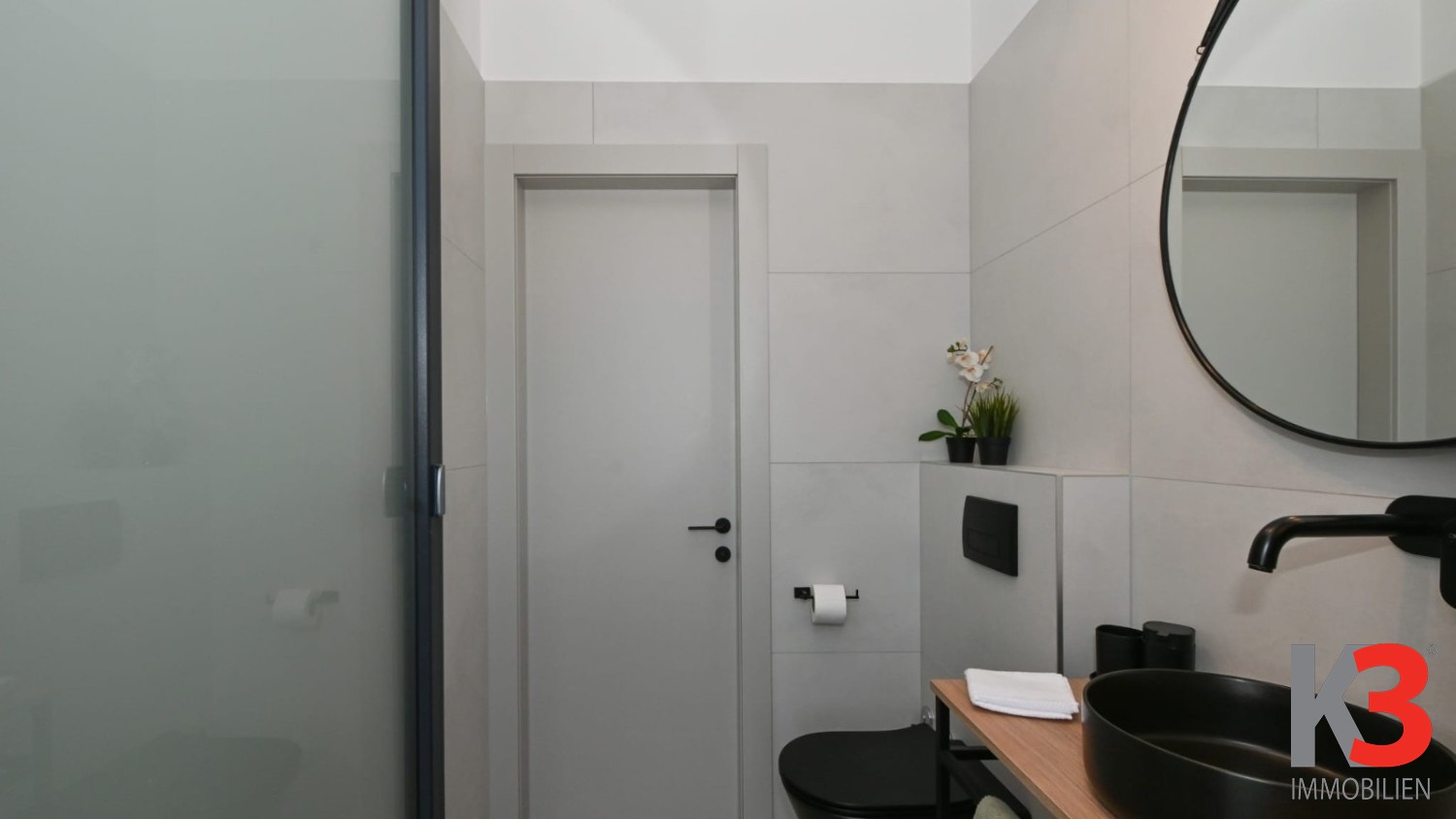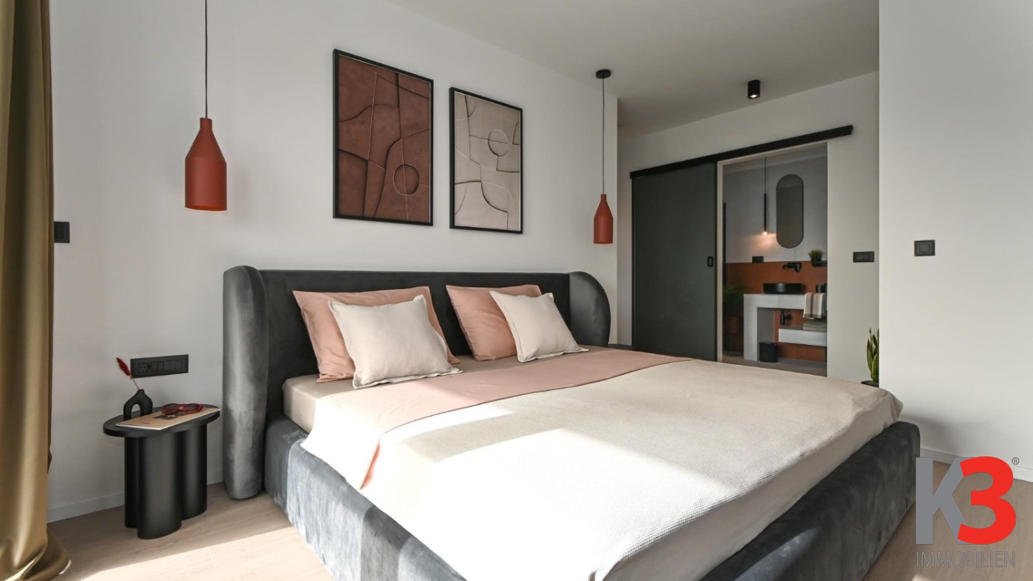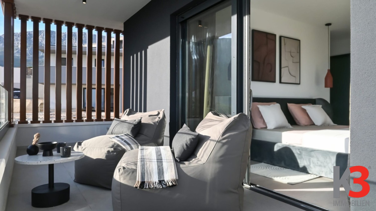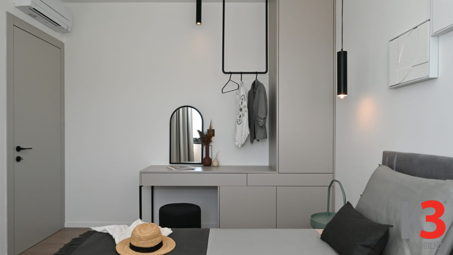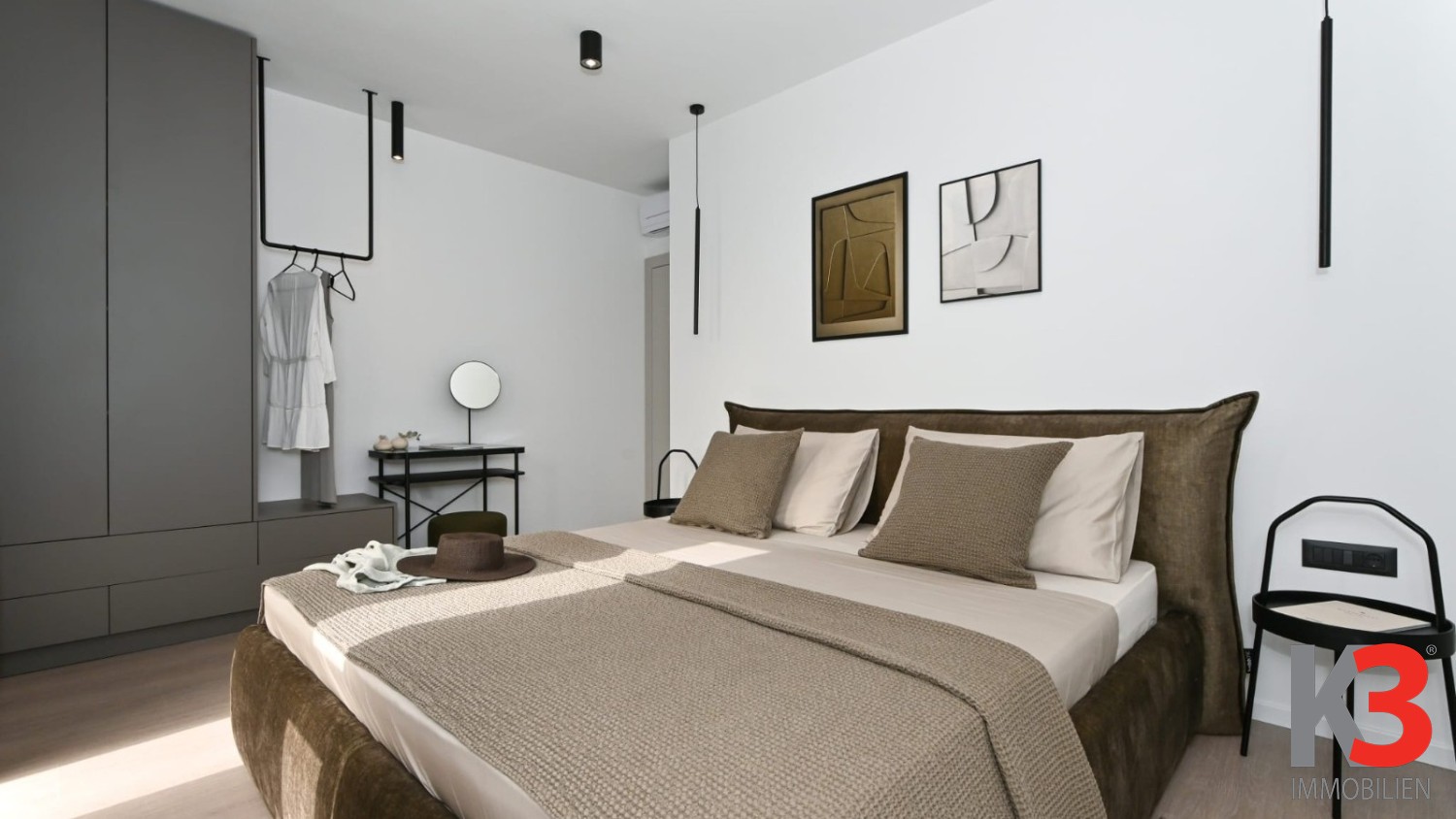 Das erste Stockwerk besteht aus drei Schlafzimmern, die jeweils mit Panoramablick ausgestattet sind. Das Hauptschlafzimmer verfügt über ein eigenes Badezimmer und eine Terrasse. Stellen Sie sich vor, Sie wachen im Bett auf und genießen den atemberaubenden Blick auf Split und seine Inseln. Alle Schlafzimmer sind mit sorgfältig ausgewählten Materialien ausgestattet und verfügen über einen TV und eine Klimaanlage.
