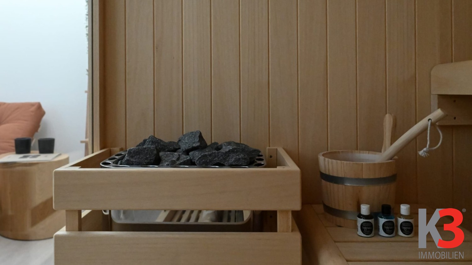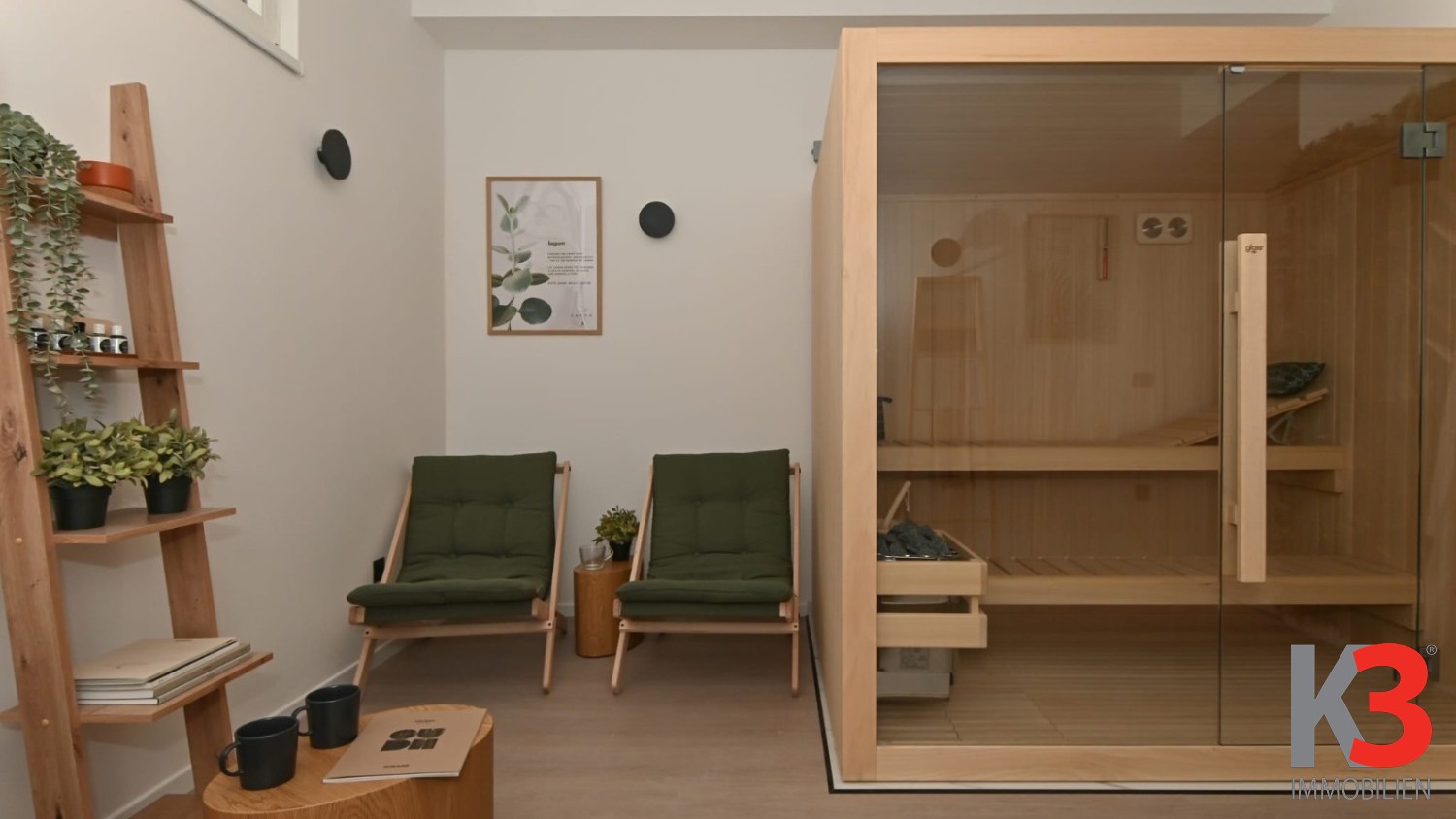 Zusätzlich gibt es einen wunderschönen Wellnessbereich, ausgestattet mit einer organischen finnischen Sauna und einer Futon-Lounge für maximalen Komfort beim Entspannen. Der Wellnessraum ist in Erdtönen mit grünen und hölzernen Akzenten gestaltet, wodurch ein Gefühl der Verbundenheit mit der natürlichen Umgebung entsteht – ein Ort, an dem Sie sich entspannen und wieder mit sich selbst in Einklang kommen können.