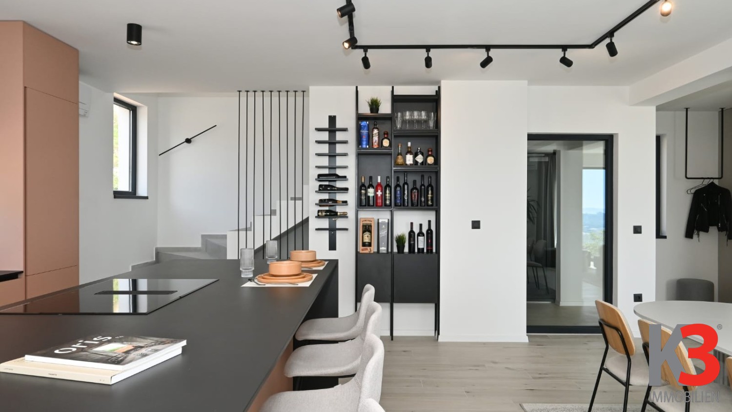 Das Erdgeschoss umfasst ein offenes Wohnzimmer, ein Essbereich und eine Küche. Das Wohnzimmer ist mit großen Glaswänden gestaltet, die einen wunderschönen Blick bieten. Genießen Sie den Abend mit dem Lichtermeer der Stadt im Hintergrund. Dieser Bereich bietet Komfort und Vielseitigkeit – Sie können entweder den Sonnenuntergang genießen oder sich auf die andere Seite des großen Sofas wenden und fernsehen. Die Küche ist mit hochwertigen Materialien und Geräten ausgestattet, ideal für die Zubereitung Ihrer kulinarischen Meisterwerke. Der großzügige Essbereich ist perfekt, um Mahlzeiten im Innenbereich zu genießen, und verfügt über eine maßgefertigte Bar, die Platz für zahlreiche Flaschen bietet, sowie einen Wein Kühlschrank, der auf die perfekte Temperatur eingestellt ist.