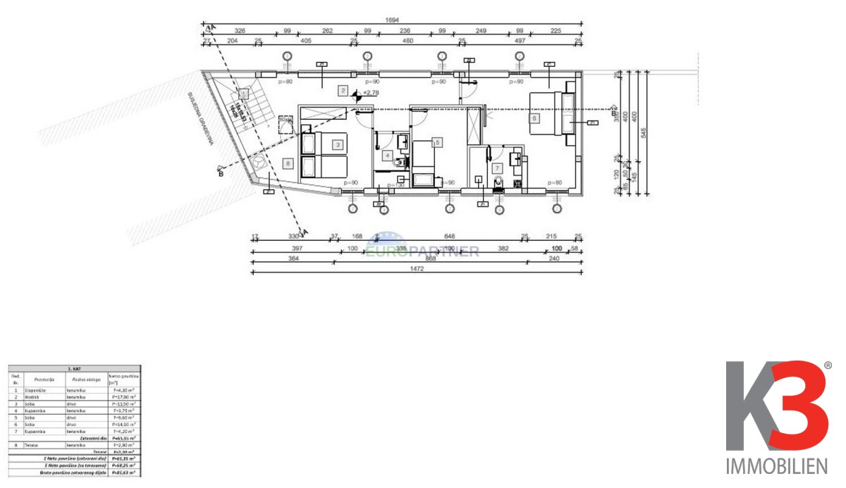 Das Projekt umfasst 3 Schlafzimmer, 2 Badezimmer, ein WC, ein Wohnzimmer und eine Küche, einen Balkon sowie eine Außenterrasse.