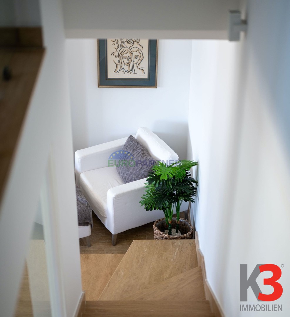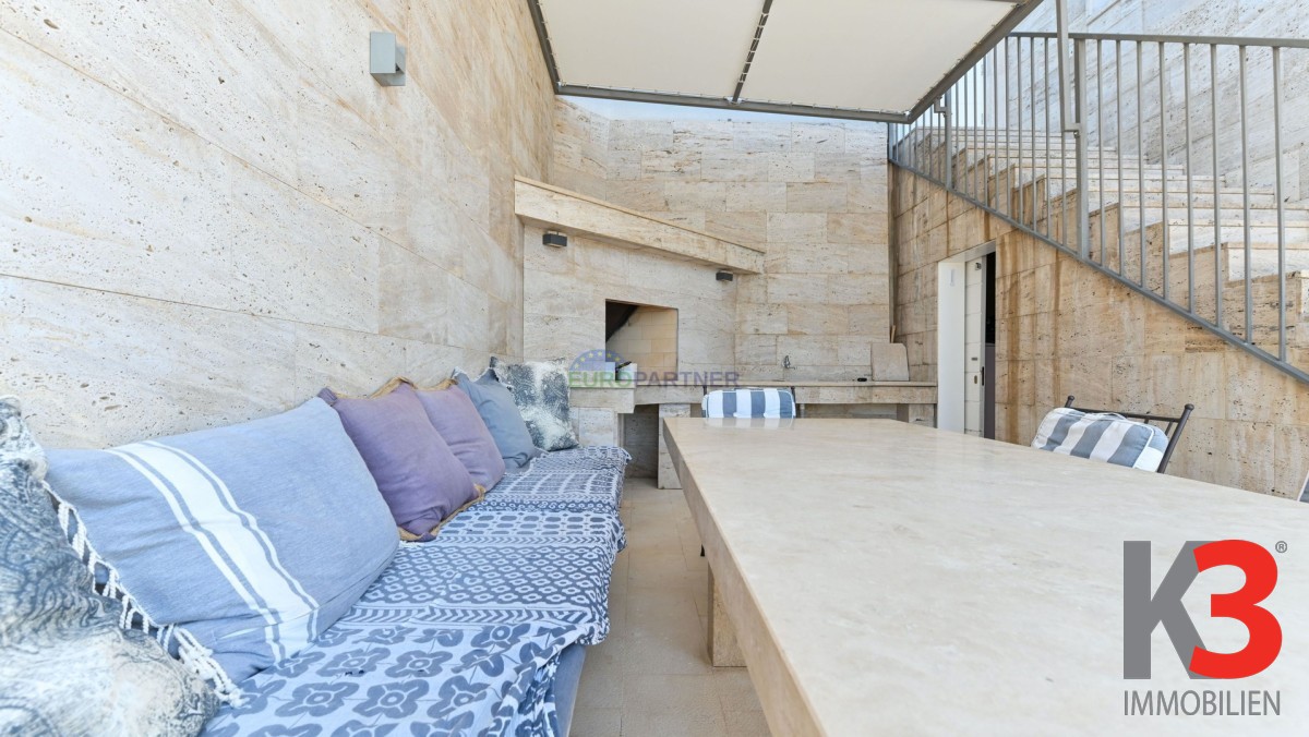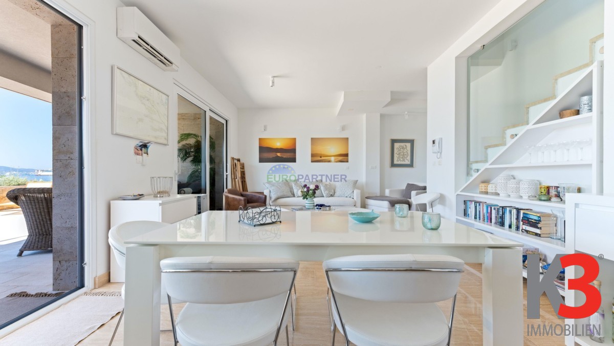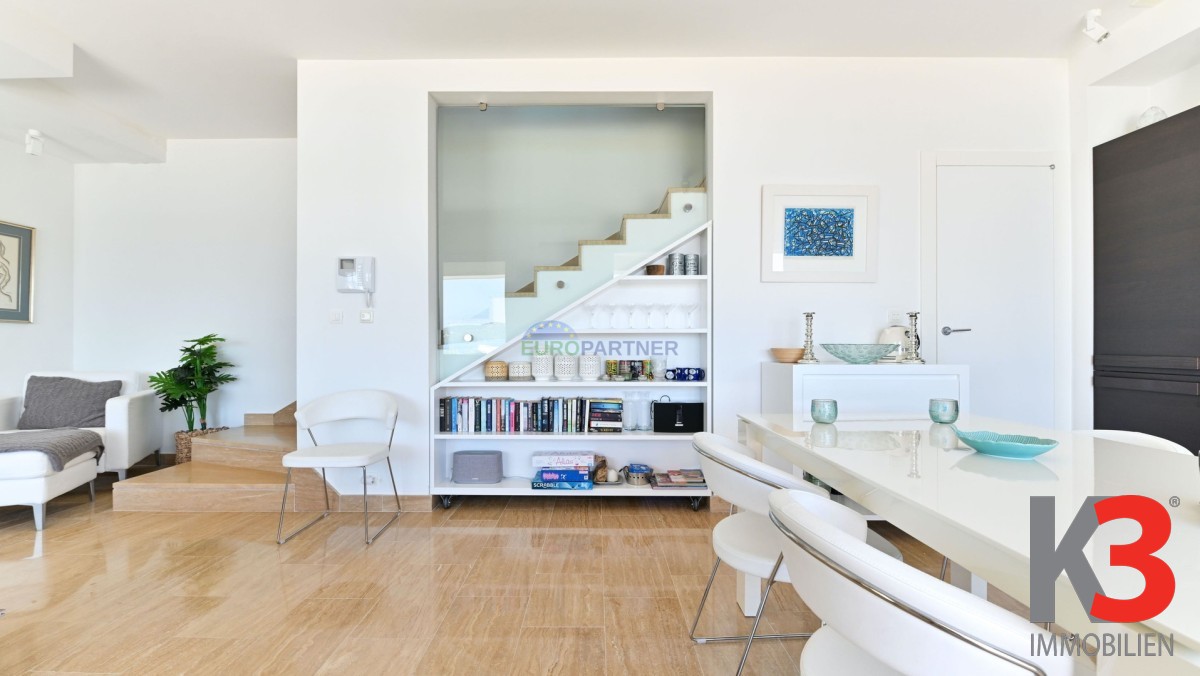 Im dritten Stock befinden sich ein weiterer Wohnbereich mit Küche und Esszimmer, ein WC sowie eine überdachte Terrasse – ideal zum Entspannen und Genießen des Meerblicks.