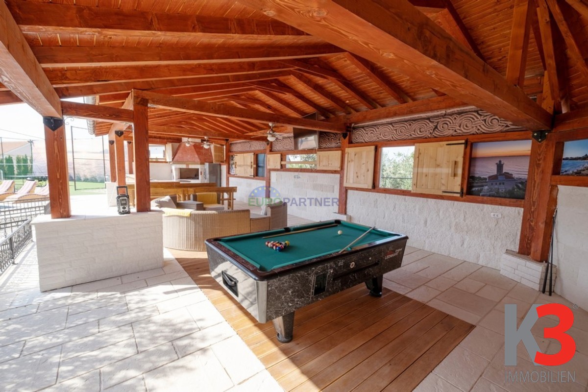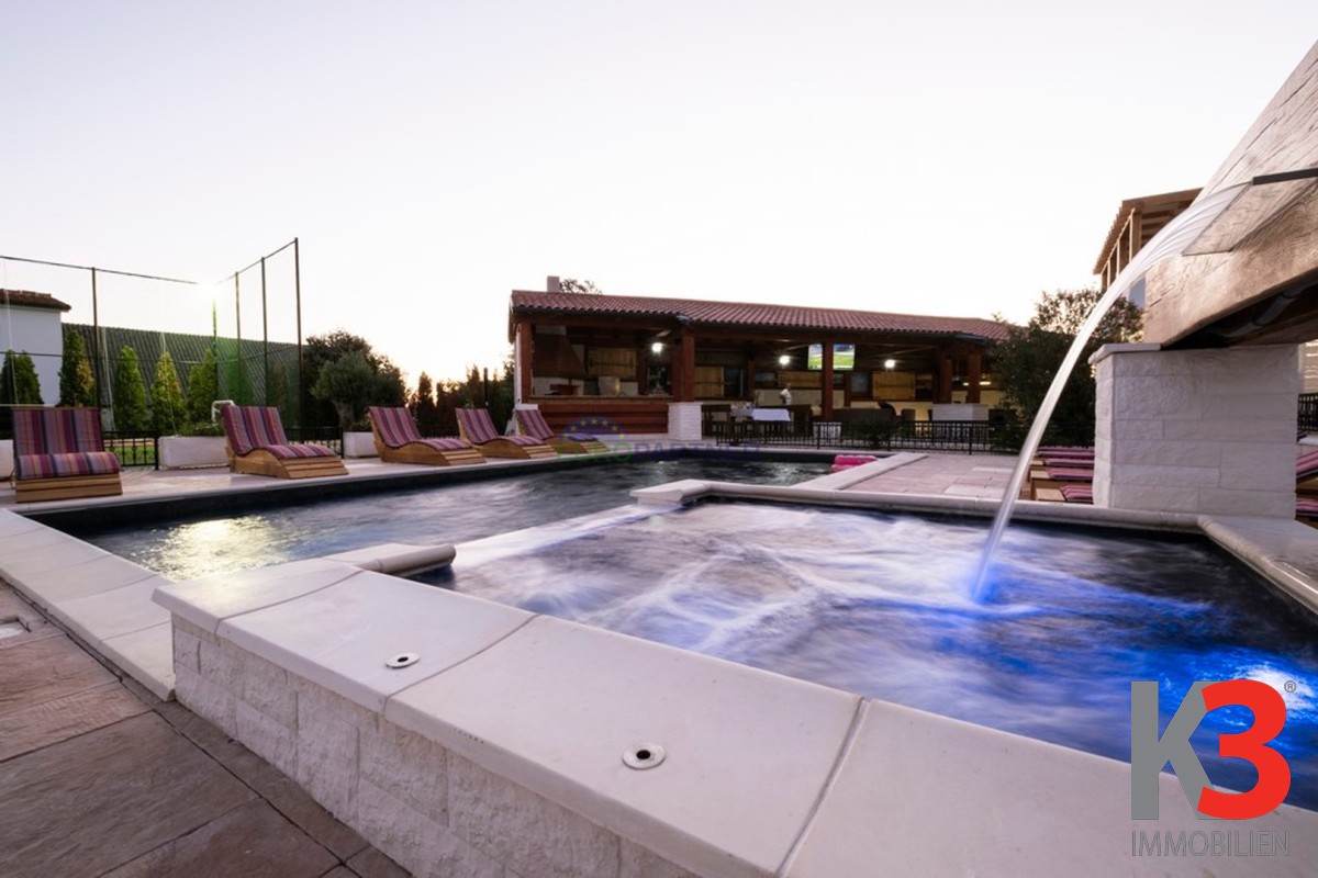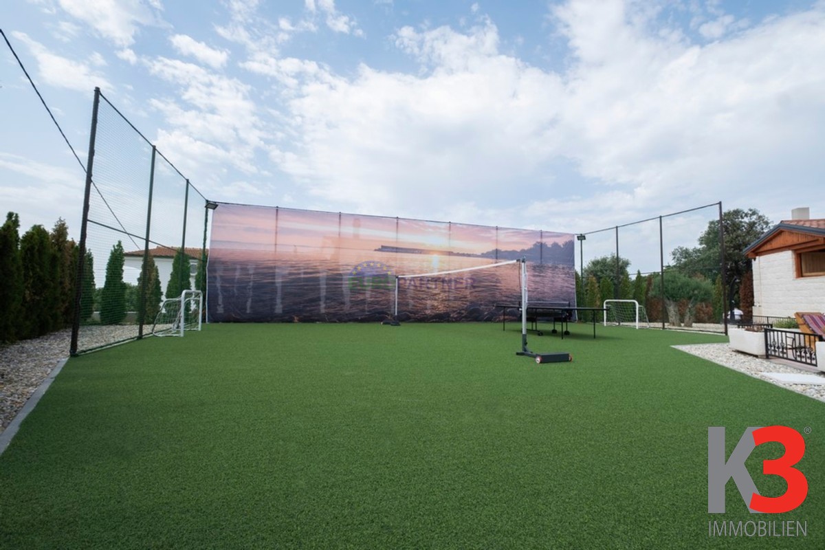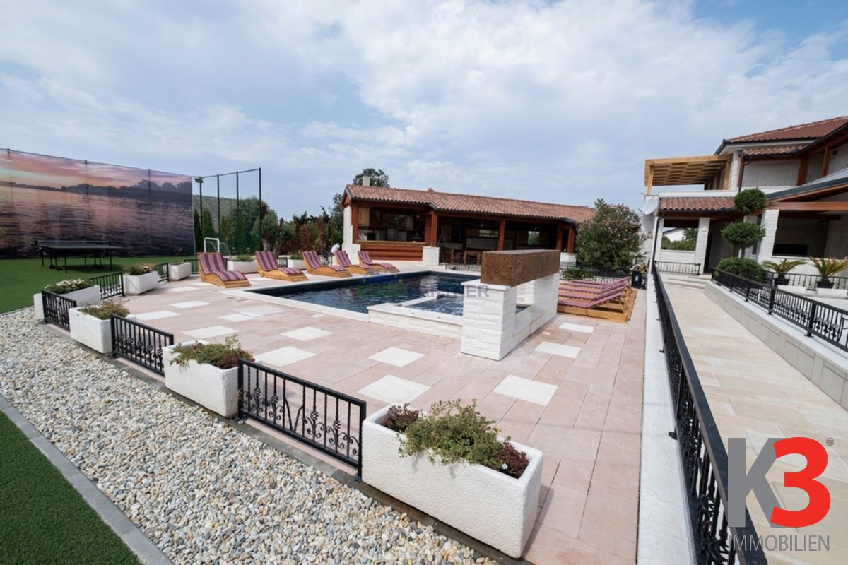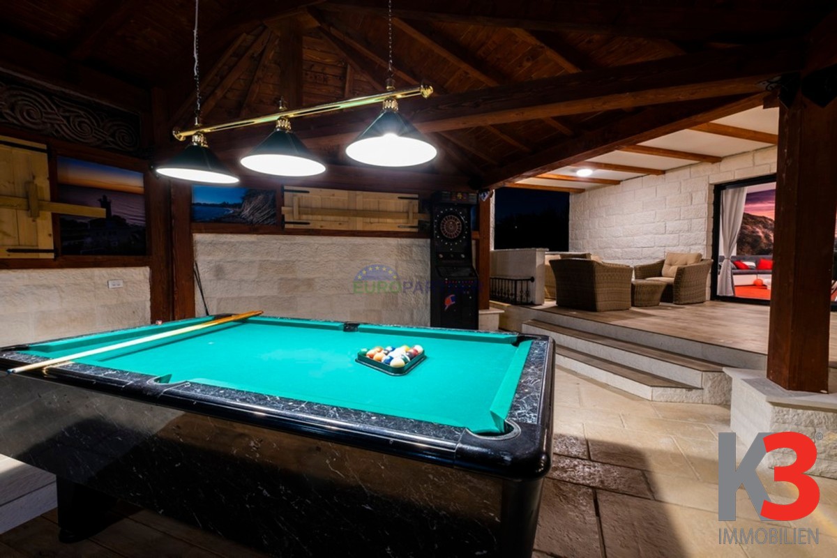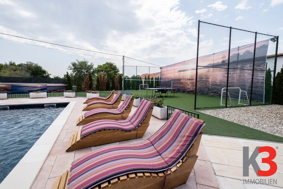 Bei der Gestaltung der Inhalte legte der Eigentümer den Schwerpunkt auf die Außeninhalte rund um das Haus. Die Größe des Gartens beträgt 1.370 m2. Wunderschön dekoriert und geräumig, ist es eng eingezäunt und durch Zypressen von der Nachbarschaft getrennt. Dort finden Sie einen beheizten Außenpool mit Gegenstromanlage, einen Außenwhirlpool für 4 Personen, eine Außendusche sowie eine Liegewiese rund um den Pool. Neben der Villa befindet sich eine Sommerküche mit Essbereich und Außenkamin. In der Fortsetzung des Hofes befindet sich ein Fußballplatz. Zu den weiteren Einrichtungen gehören Billard, Tischfußball und Tischtennis.