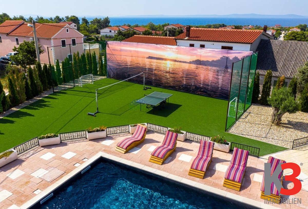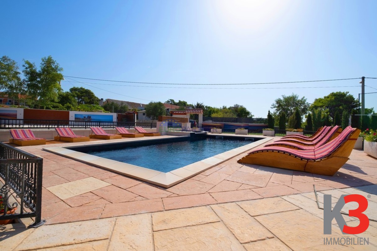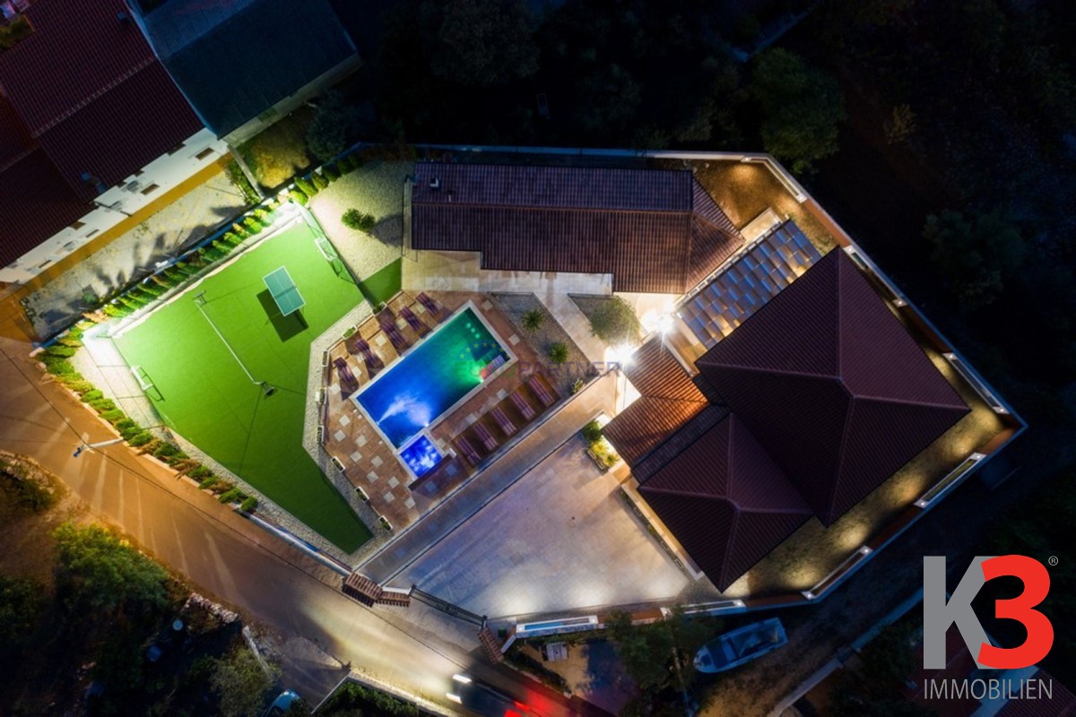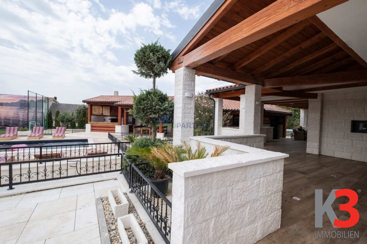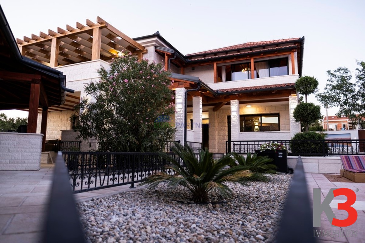 Bei der Gestaltung der Inhalte legte der Eigentümer den Schwerpunkt auf die Außeninhalte rund um das Haus. Die Größe des Gartens beträgt 1.370 m2. Wunderschön dekoriert und geräumig, ist es eng eingezäunt und durch Zypressen von der Nachbarschaft getrennt. Dort finden Sie einen beheizten Außenpool mit Gegenstromanlage, einen Außenwhirlpool für 4 Personen, eine Außendusche sowie eine Liegewiese rund um den Pool. Neben der Villa befindet sich eine Sommerküche mit Essbereich und Außenkamin. In der Fortsetzung des Hofes befindet sich ein Fußballplatz. Zu den weiteren Einrichtungen gehören Billard, Tischfußball und Tischtennis.
