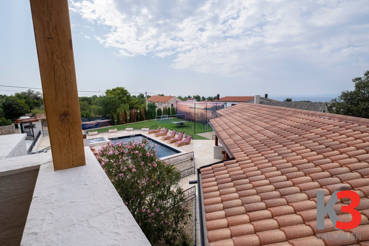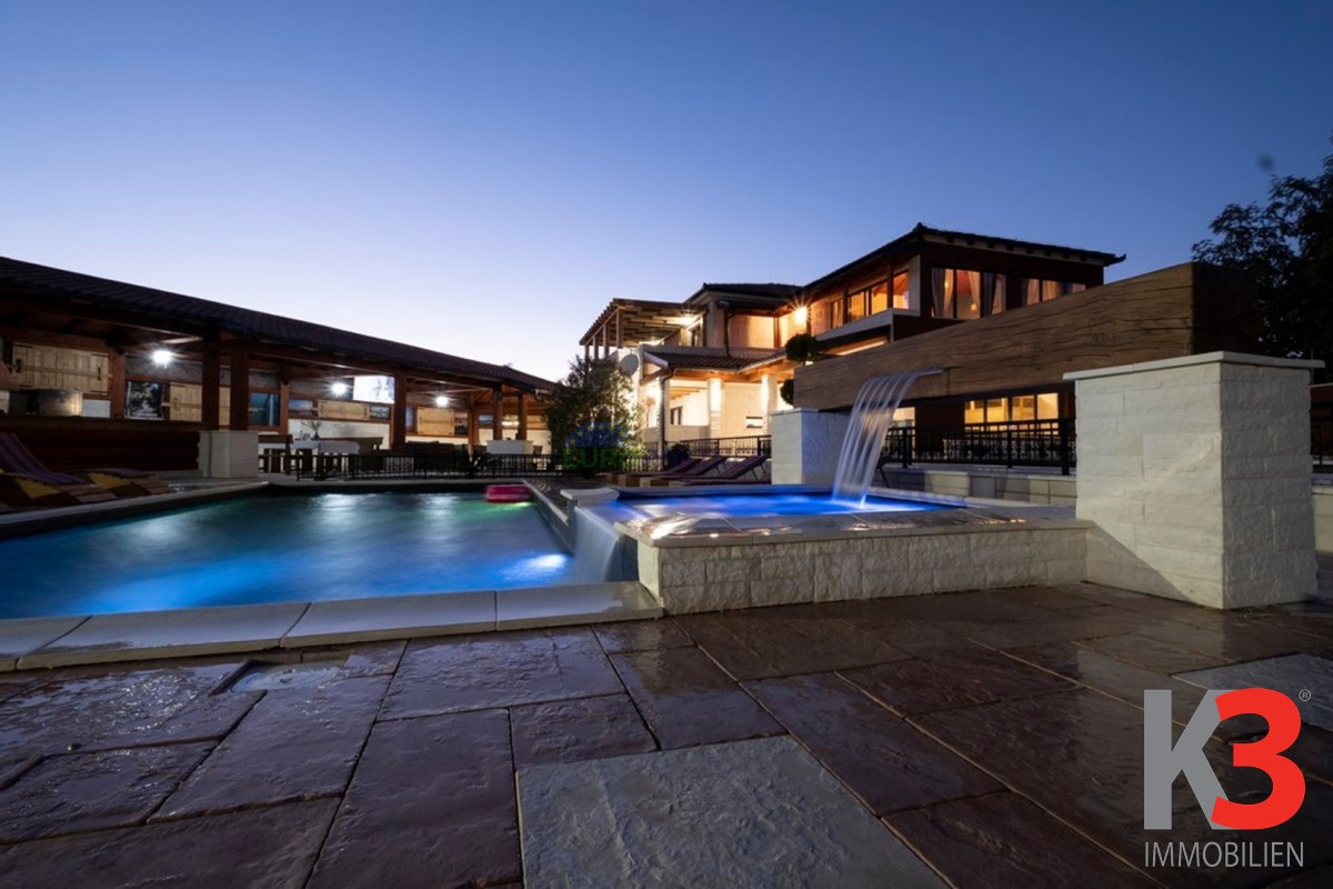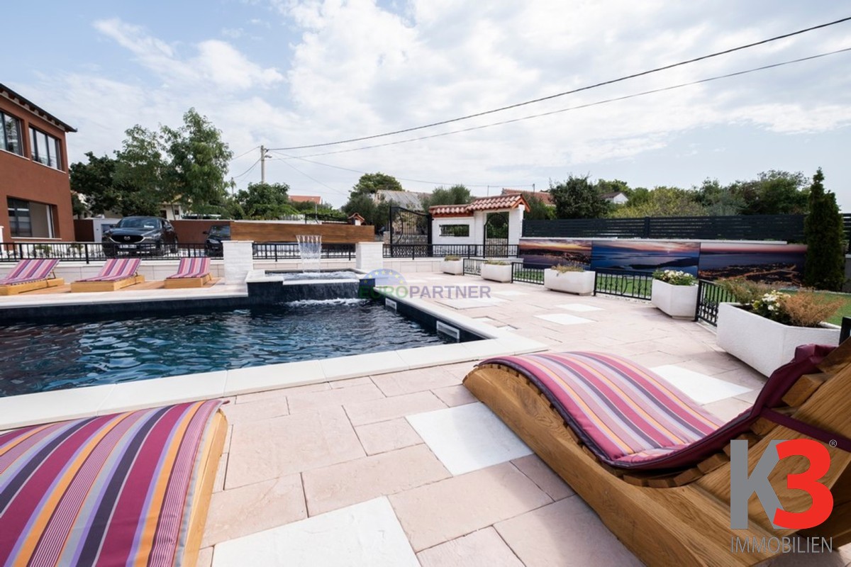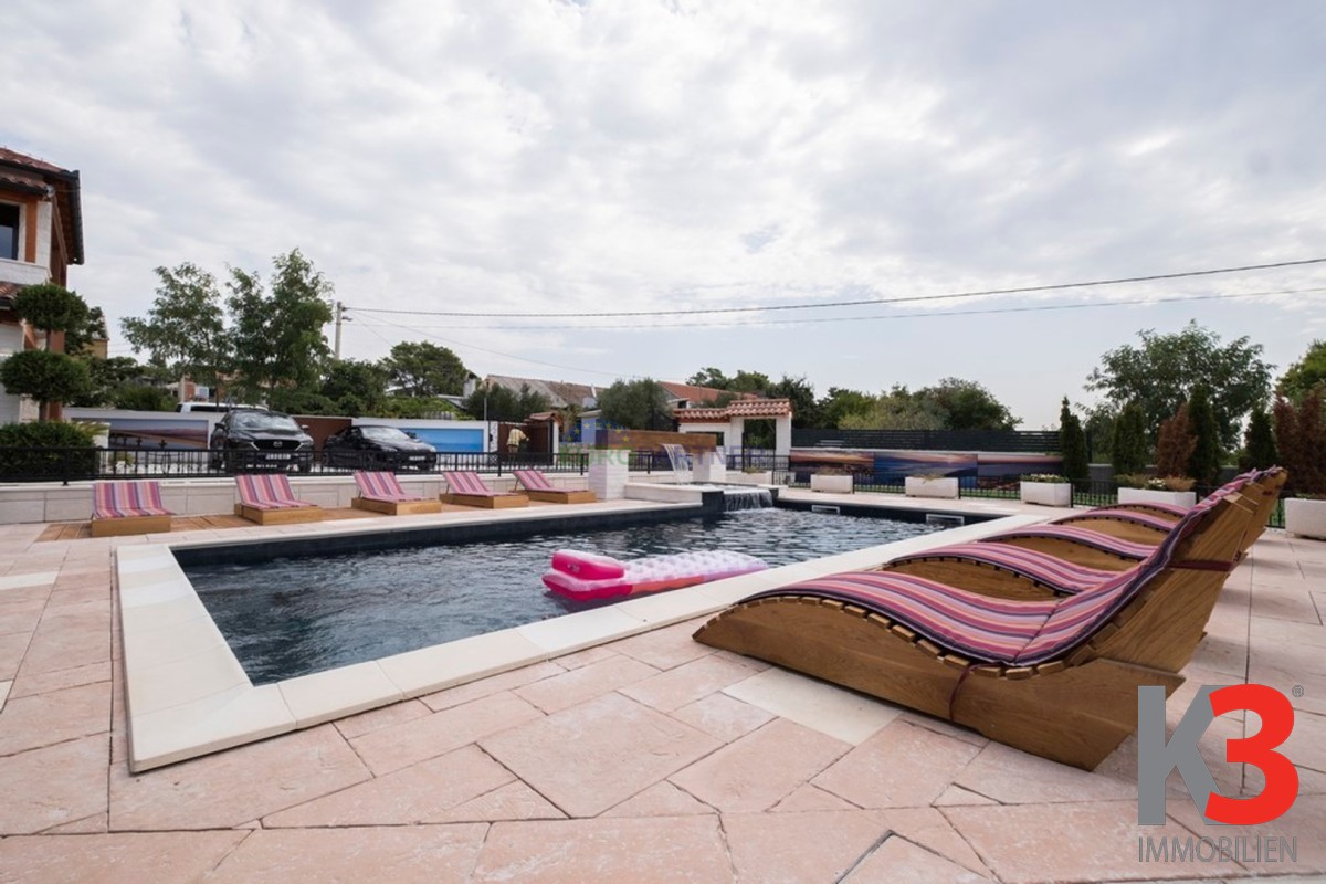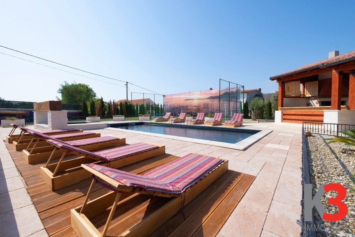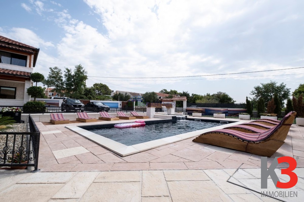 Bei der Gestaltung der Inhalte legte der Eigentümer den Schwerpunkt auf die Außeninhalte rund um das Haus. Die Größe des Gartens beträgt 1.370 m2. Wunderschön dekoriert und geräumig, ist es eng eingezäunt und durch Zypressen von der Nachbarschaft getrennt. Dort finden Sie einen beheizten Außenpool mit Gegenstromanlage, einen Außenwhirlpool für 4 Personen, eine Außendusche sowie eine Liegewiese rund um den Pool. Neben der Villa befindet sich eine Sommerküche mit Essbereich und Außenkamin. In der Fortsetzung des Hofes befindet sich ein Fußballplatz. Zu den weiteren Einrichtungen gehören Billard, Tischfußball und Tischtennis.
