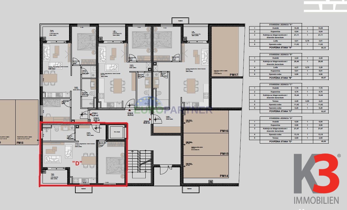 Die Wohnung bietet eine Gesamtfläche von 48,69 m2 mit optimal genutztem Grundriss. Sie besteht aus einem Eingangsbereich, einem Schlafzimmer, einem Badezimmer sowie einem offenen Wohnbereich mit Küche und Esszimmer. Große Glasflächen ermöglichen den Zugang zu einer überdachten Terrasse, die den Raum optisch erweitert.