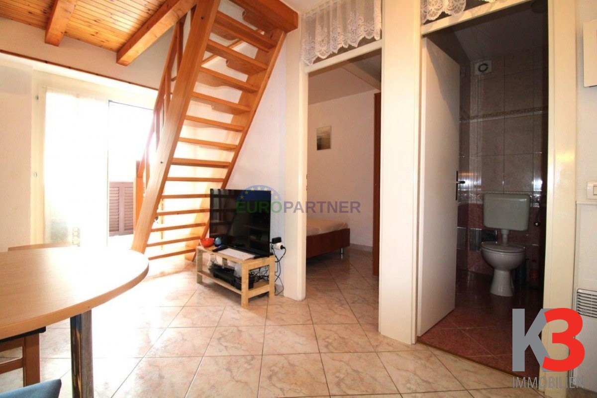 Die Wohnung erstreckt sich über zwei Etagen. Im ersten Stock befinden sich ein Schlafzimmer, ein Badezimmer, eine Küche mit Zugang zum Wohnzimmer und zur Loggia. Im Obergeschoss befinden sich zwei weitere, kleinere Schlafzimmer und ein Gemeinschaftsbad. Dadurch eignet sich die Wohnung ideal für Familien oder als Ferienvermietung.