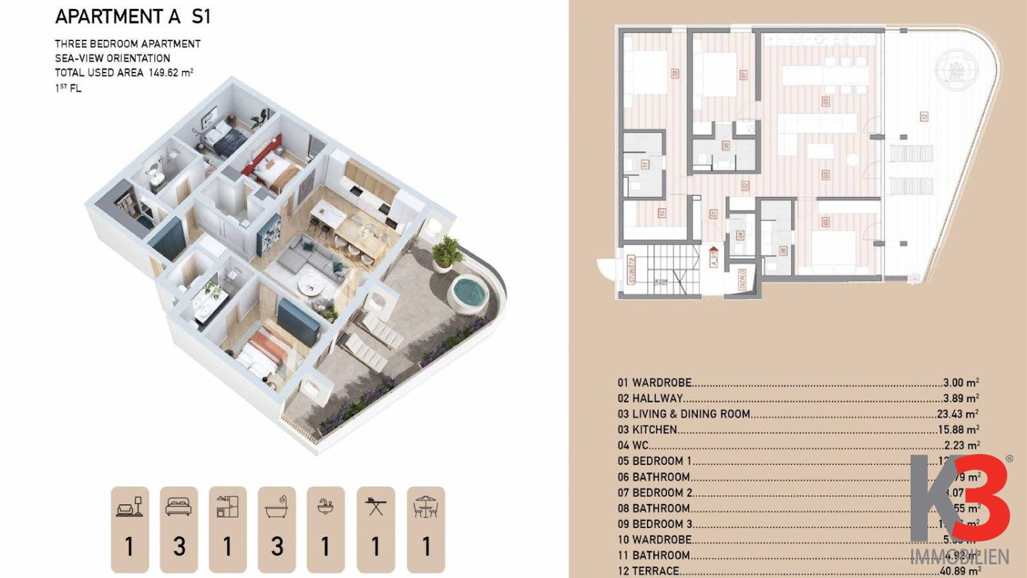 Die Raumaufteilung umfasst ein großzügiges Wohnzimmer mit Essbereich, eine Küche, zwei Schlafzimmer jeweils mit eigenem Bad sowie eine große Terrasse mit atemberaubendem Ausblick.