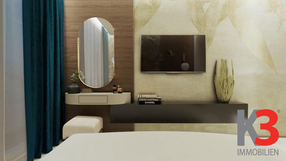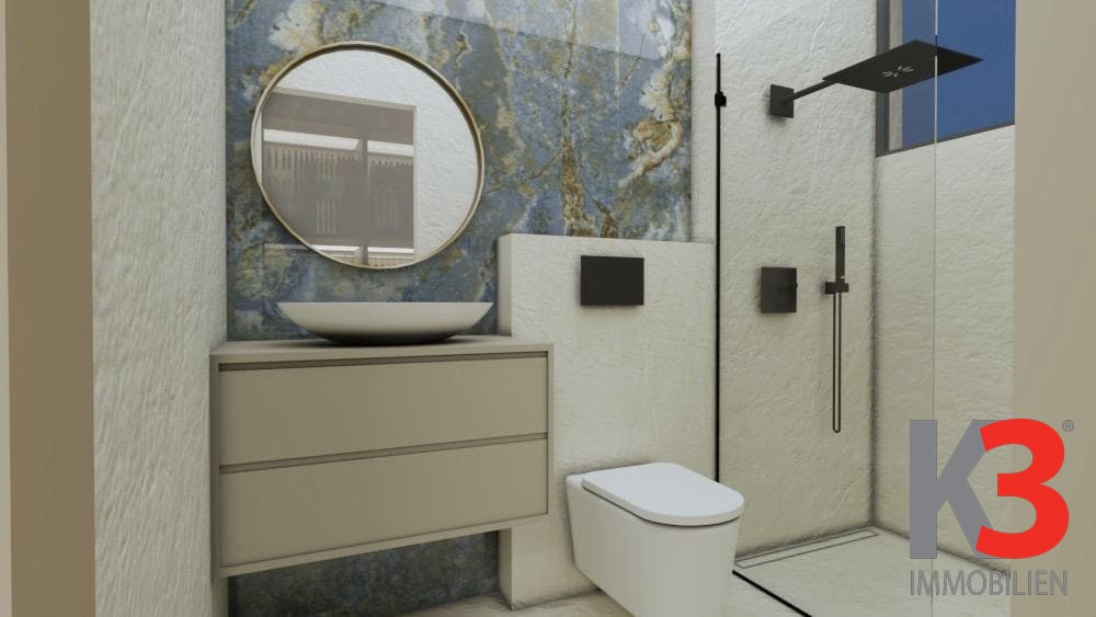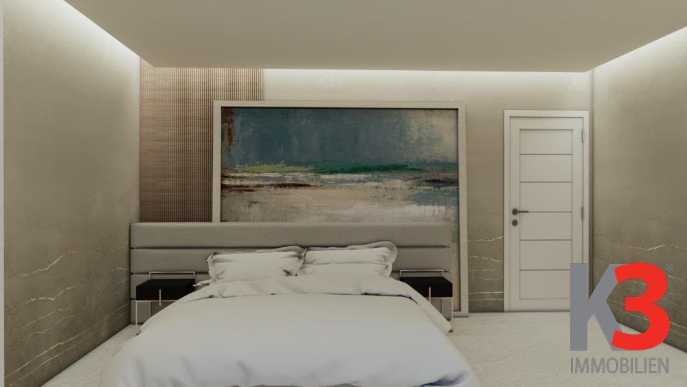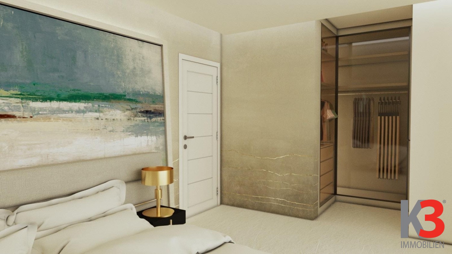 Drei komfortable Schlafzimmer, jedes mit eigenem Ankleideraum und Badezimmer, bieten Privatsphäre und Luxus, während zusätzliche Räume — wie Waschküche, Vorraum, zwei Terrassen und ein Balkon — maximale Funktionalität gewährleisten.