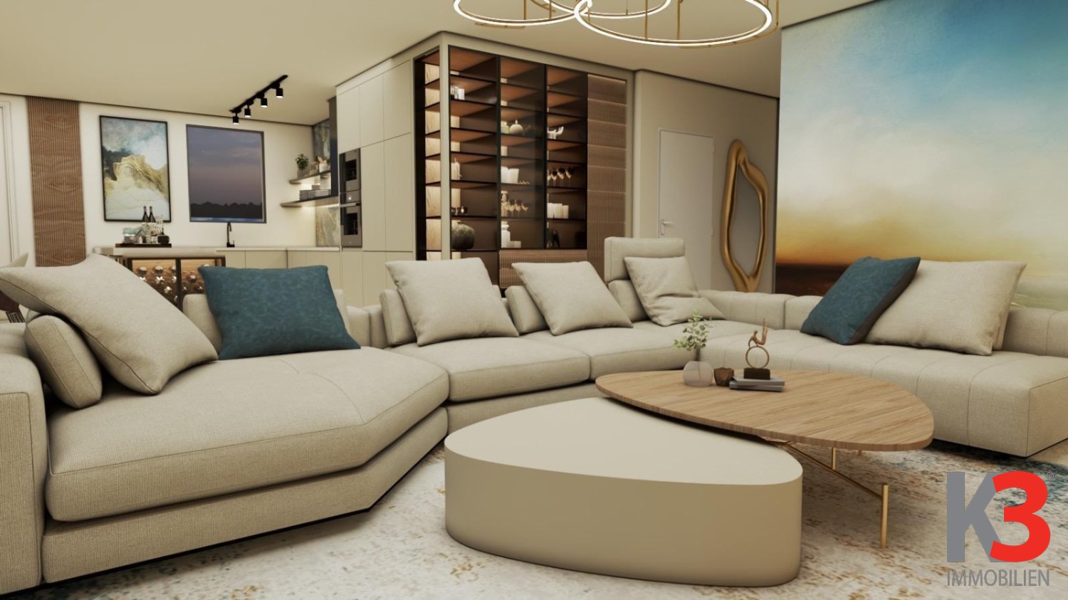 Das geräumige Wohnzimmer mit 36,80 m² ist mit einer modernen Küche und einem großen Essbereich von 25,10 m² verbunden und schafft damit den idealen Ort zum Entspannen und geselligen Beisammensein.