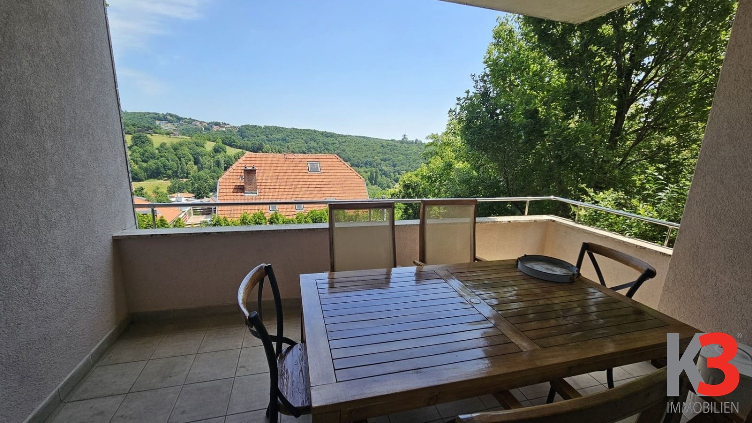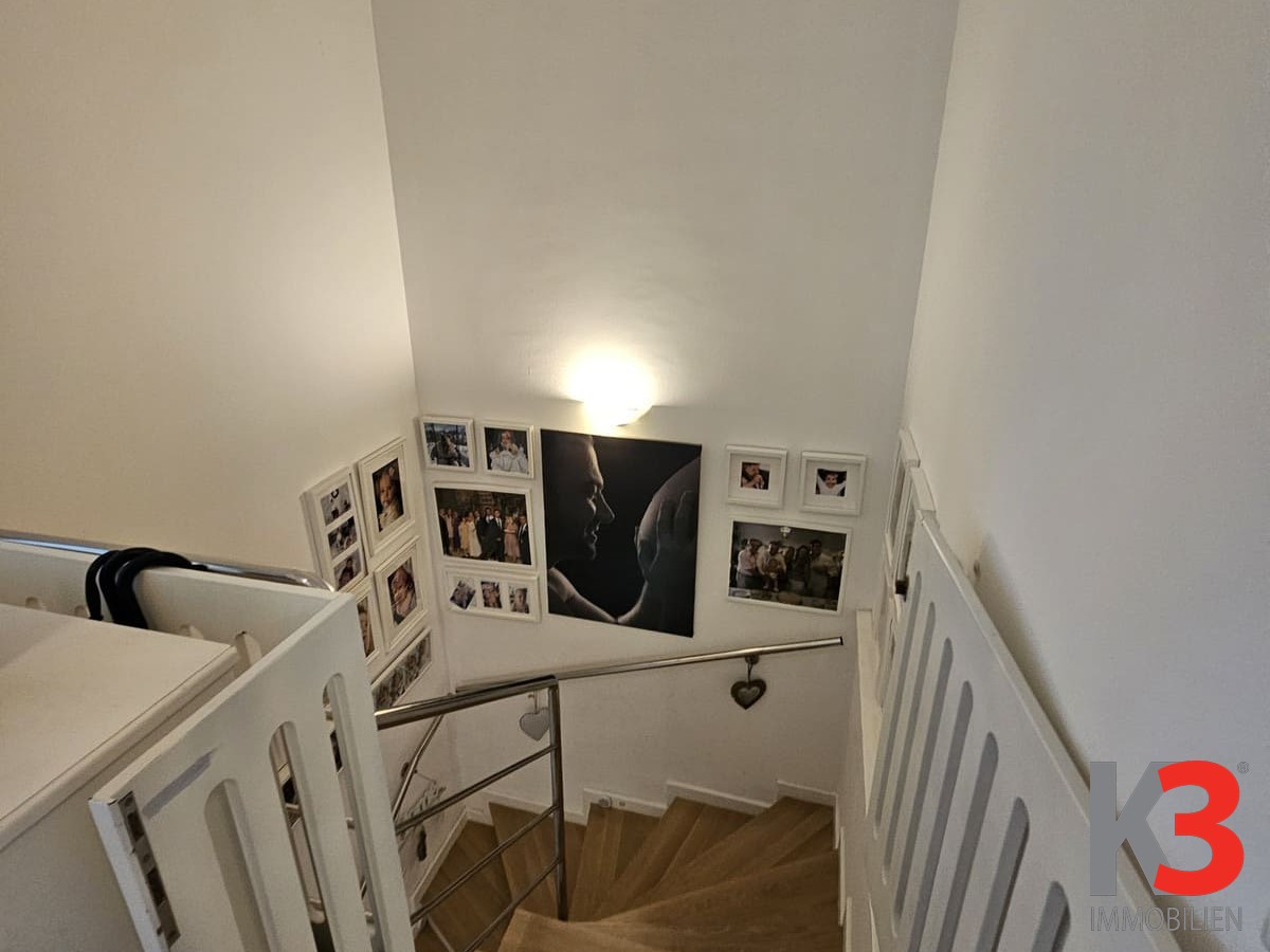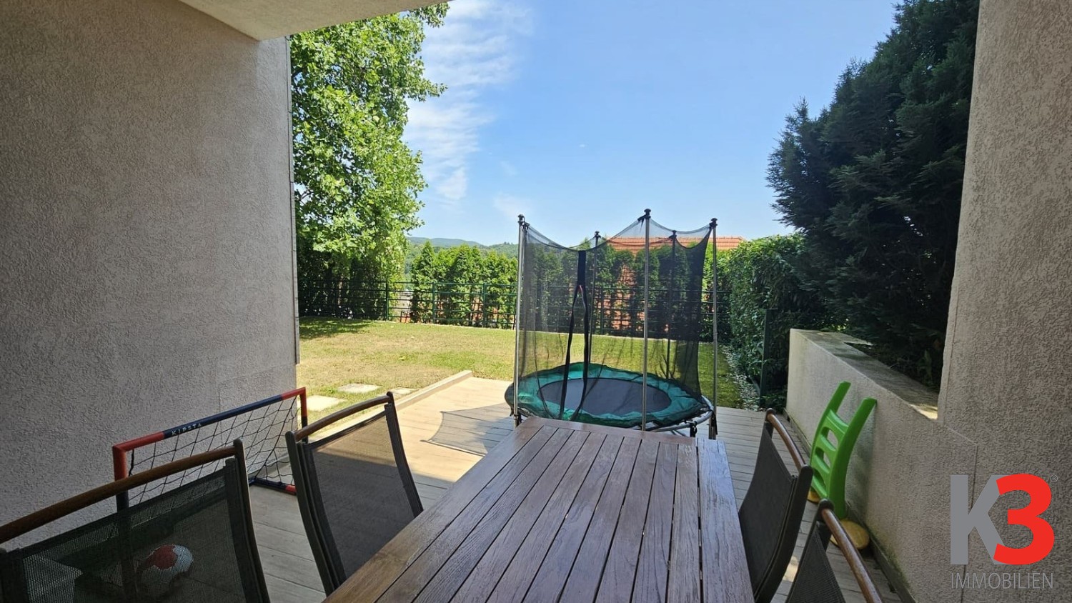 Im Obergeschoss befinden sich ein Gäste-WC, ein Schlafzimmer mit eigenem Bad, ein großes Wohnzimmer mit Küche und Esszimmer, das auf eine Loggia mit herrlichem Blick ins Grüne führt.