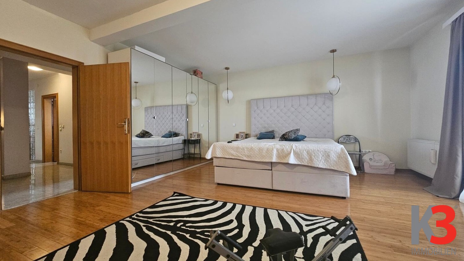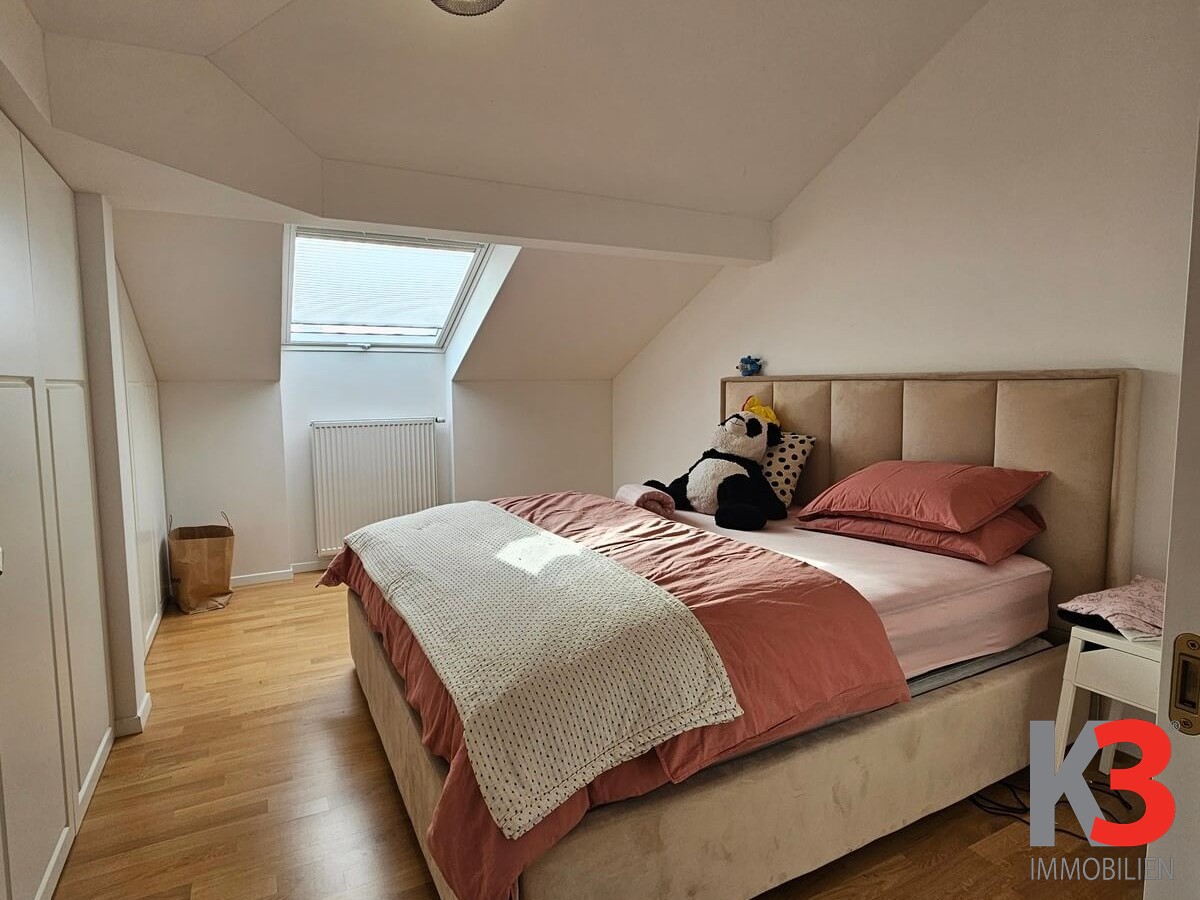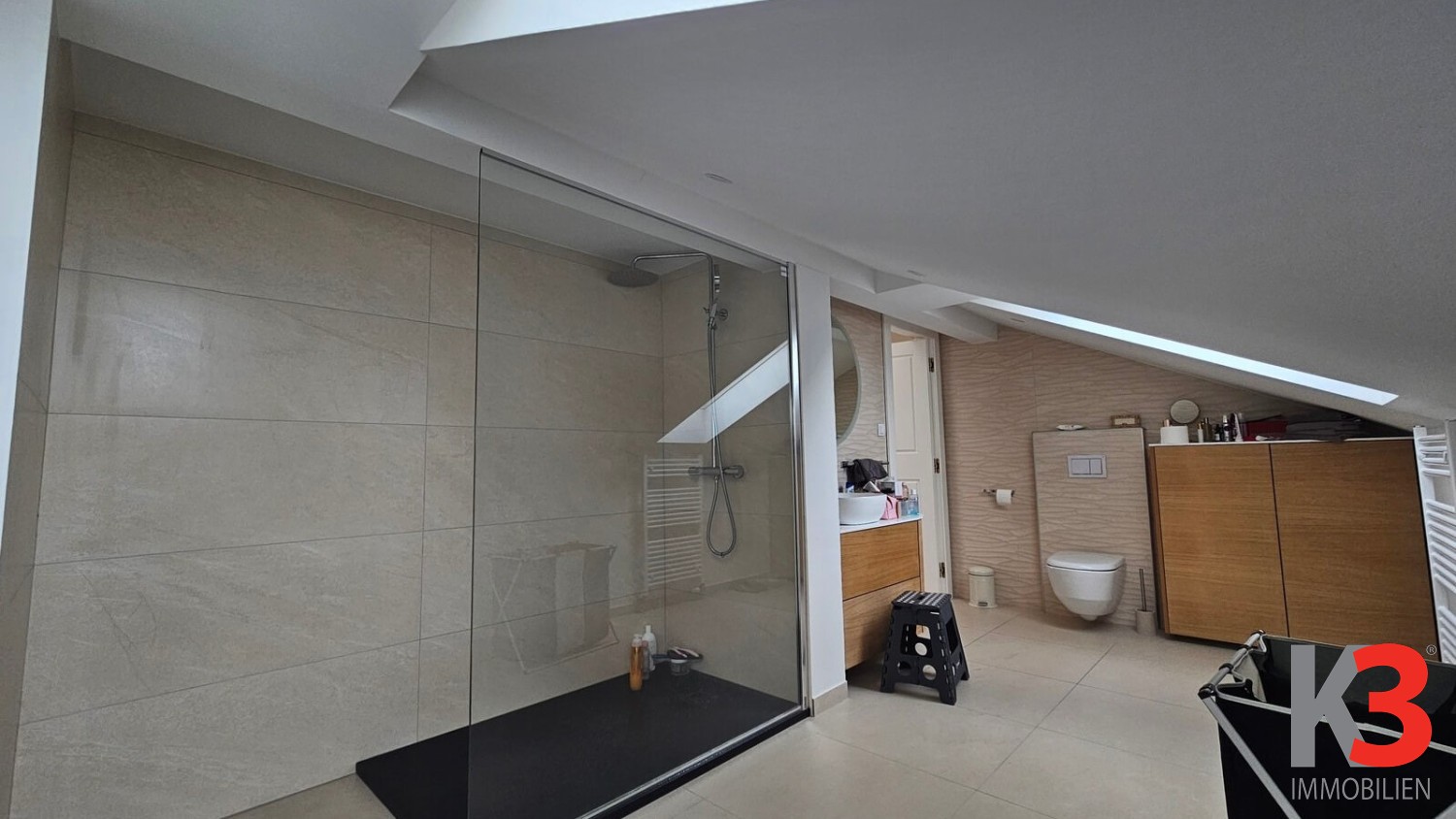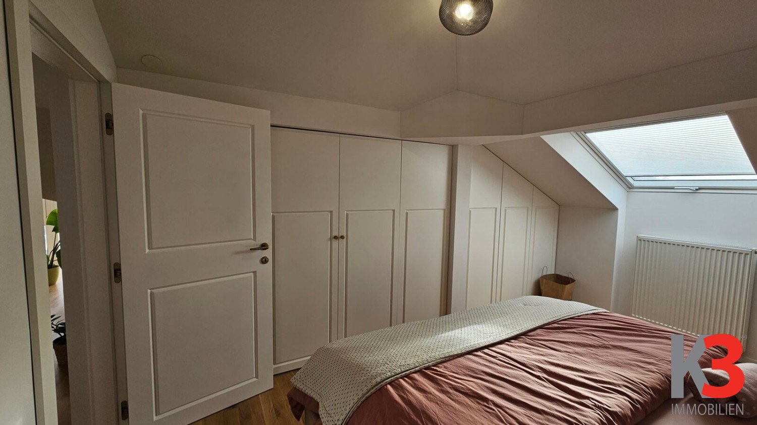 Das zweite Obergeschoss/Dachgeschoss wird bereits als separate Wohnung genutzt und besteht aus einem Wohnzimmer mit Küche und Essbereich, zwei Schlafzimmern mit begehbarem Kleiderschrank, einem Badezimmer mit Abstellraum, einer Terrasse und einem separaten Raum, der als Abstellkammer dient.
