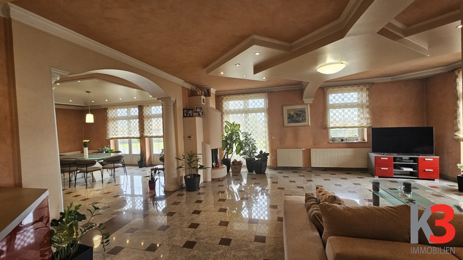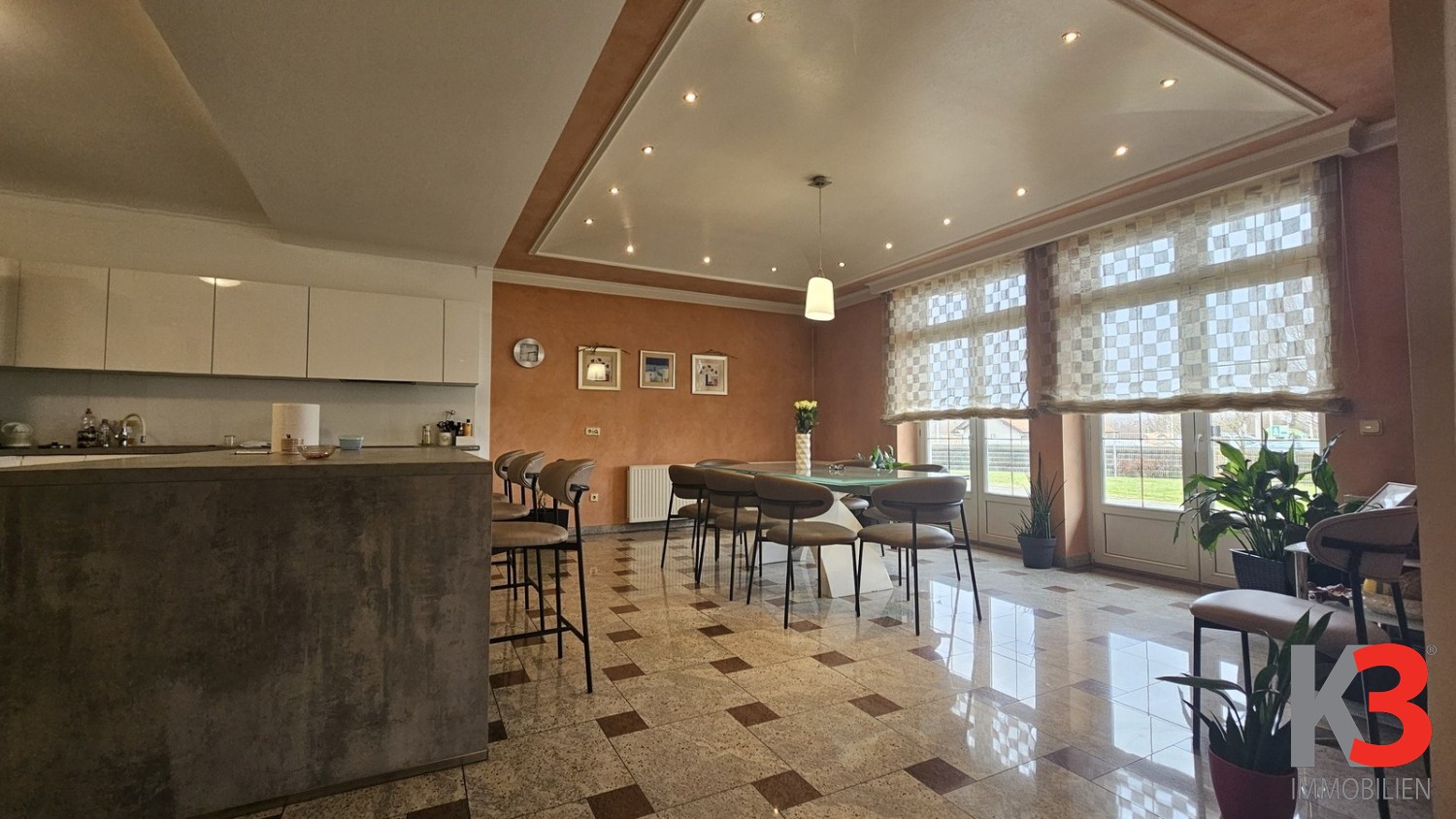 Das Erdgeschoss verfügt über ein geräumiges Wohnzimmer mit Küche und Essbereich, ein WC, einen Bürobereich (zwei Räume, eine Küche und ein WC) mit separatem Eingang, einen Flur und ein Treppenhaus.