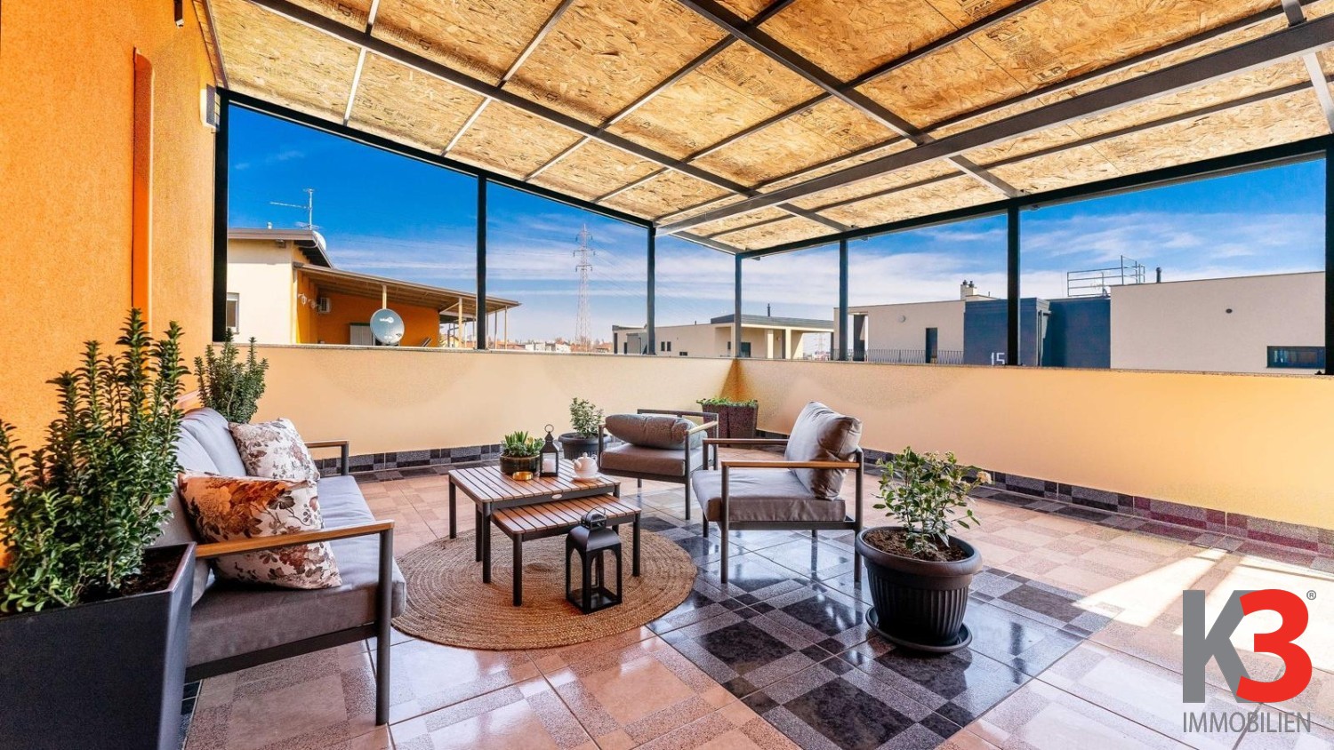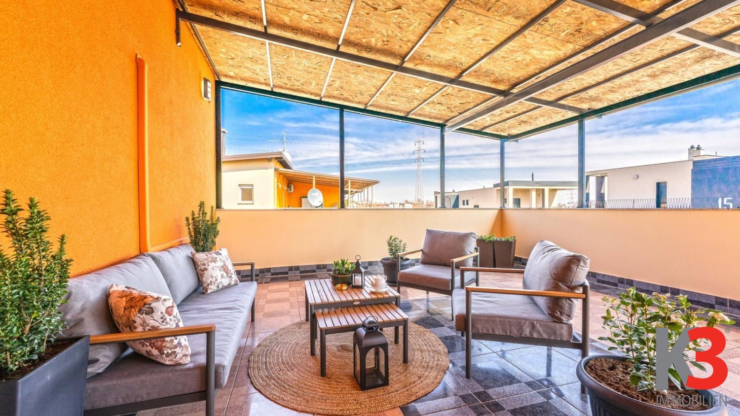 Die geschlossene Fläche beträgt 48 m², während die Gesamtfläche mit der überdachten Terrasse von 34 m² (NKP 8,5 m²) und dem Parkplatz von 12,5 m² (NKP 3 m²) eine Gesamt-NKP von 60 m² ergibt.