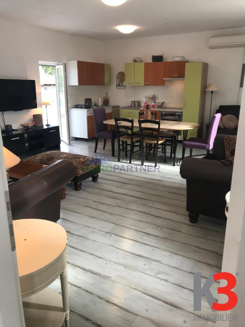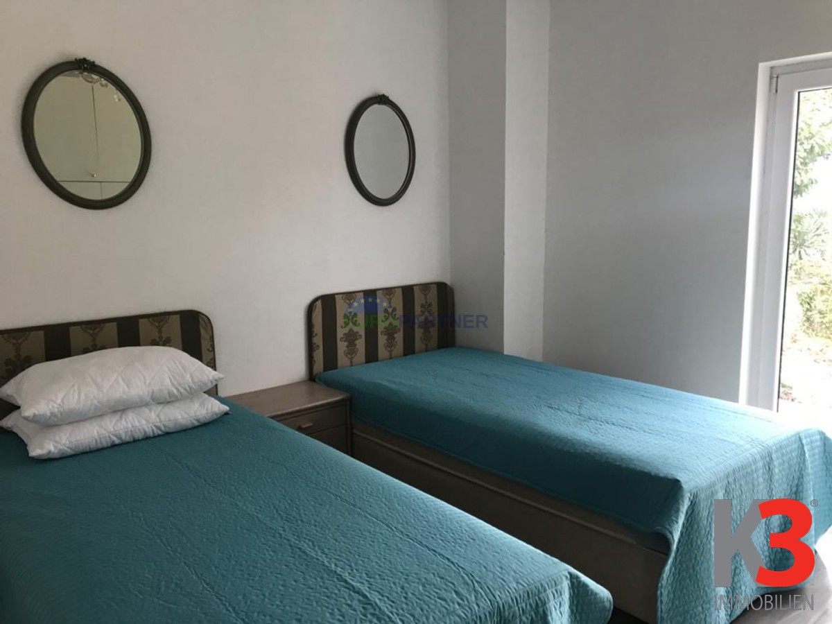 Das Erdgeschoss verfügt über 75 m2 Wohnfläche und besteht aus Flur, Küche und Esszimmer, Wohnzimmer, zwei Schlafzimmern und einem Badezimmer. Das Haus ist eingerichtet und möbliert und wird derzeit zur Langzeitvermietung genutzt. Klimaanlagen dienen zum Kühlen und Heizen.